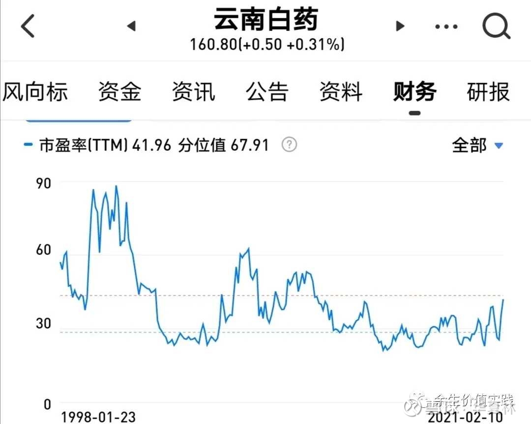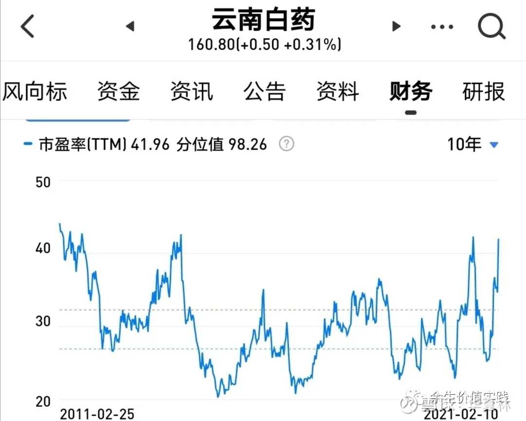 云南白药(000538):每股净资产 29.29元,每股净利润 3.18元,历史净利润年均增长 22.74%,预估未来三年净利润年均增长 13.5%,更多数据见:云南白药000538核心经营数据 云南白药的当前股价 74.72元,市盈率 26.87,未来三年的估值假设和预期收益率如下:15倍PE,预期收益率 -6.66%;20倍PE,预期收益率 24.45%;25倍PE,预期收益率 55.57%;30倍PE,预期收益率 86.68%。 新行业(医药板块)云南白药 、(白酒板块)五粮液 、(食品消费板块)待定 (证券板块)中信、华泰 这是我未来看好的的行业! 看好不代表布局!看好:是这个行业好,未来有潜力,只是在看好并没有布局!布局:在看好的基础上,这个行业你看好的公司还出现了好的价格,所以建仓布局! 先来解释解释:我看好的这几个行业!除了在原有的基础上继续持有:中国平安、平安银行、邮储银行、康恩贝外…我准备拓展下面的行业 行业的评判标准,我喜欢先看PE! 但是现在,许多新起来的投资者,喜欢这样说“现在谁还看PE?我们都看PEG{补充:PEG指标(市盈率相对盈利增长比率)是用公司的市盈率除以公司的盈利增长速度。”}说人话PEG就是成长衡量标准!这个概念是在“PE”的基础上进化而来的,对PEG来说“PE”还是他老子呢! 甚至还有人说 “现在还在用PE来衡量公司的都是小学生!我认为如果不用PE来衡量公司连小学生都不如” 不过PE只是衡量公司的一个指标之一!虽然PE能衡量企业,但是千万不要被PE束缚了手脚(这里指:高于10PE的公司就不敢投) 1.医药板块:只看中“云南白药” 医药是人的必需品!他和消费品的区别在于“白酒你可以一天不喝,但是如果手指头意外事故大量出血 你就必须用医药,这也是我想投资云南白药最基础原因!”人生病发烧是必然而医药就是解决问题的关键! 为什么偏偏看中“云南白药”?云南白药的PE在同行中比较是偏低的! 这是云南白药10年PE统计表 这是云南白药全部的PE统计图 前一段时间云南白药PE最低25!股价90多块!但是当时没现金买(好机会跑了),最高历史是90多PE!如果你感觉这个PE没什么?那么你对比一下同行业,医药平均普遍50倍—100倍PE,怎么样是不是感觉一瞬间“云南白药被低估了” 云南白药如果你单纯认为“光是止血药”那你就错了、“云南白药在医药的基础上还成功的扩展了 创可贴和日用品:牙膏”超市随处可以看见“云南白药牙膏”在药店“云南白药创可贴” 个人认为“中药龙头云南白药”是非常厉害的!在西药横行的年代里,我还是看好“中药”看好云南白药! 云南白药的风险 A. ROE同比下降!如果光有好处没有缺点,是不可能的!从财务报告看“云南白药的ROE出了问题!从过去ROE20多,下降到10几!甚至云南白药19年首次出现负增长”部分原因 41.我认为是“因为19年刚完成混改”新团队和老团队需要磨合 2.这两年销售费用的增长,广告费用和医药成本的上升,对ROE有所影响 3.副业务云南白药牙膏盈利下滑!公司承认在牙膏行业,同行的竞争力下降,销量下降!导致盈利下滑! B、毛利率有所下滑! 如A中的原因,也同时导致了毛利率有所下滑!我认为这是混改的后遗症! C、云南白药到了行业天花板! 如果没有亲身经历“双汇发展”的话,我估计我还会信这个鬼话!当年看好火腿肠没有投资的原因就是这个狗东西“行业天花板”一个企业把这个行业,做到了极致,你不考虑他的牛B(怎么干掉同行的)你告诉我的却是:就因为极致了却不好发展了,行业天花板了?20多块火腿肠涨到现在50多块!如果我没有亲身经历,我可能还相信这个“云南白药”也做到极致遇见了“行业天花板” 云南白药未来的转折点(看点) 既然我们已经聊了风险,我们在聊点好的! 我认为云南白药公司说的: 进一步夯实公司“新白药、大健康”战略实施的物质基础,巩固提升现有业务板块的业务规模,精选赛道及时切入全球健康产业前沿,打造全球领先的健康服务供应商,围绕中长期重点布局骨科、妇科和伤口护理等领域的战略规划,与国内外顶级专业的医疗领域机构合作,持续投入建设国际领先的研究型骨伤科诊疗及康复医院,打造具备国际尖端手术设备、器械、组织工程技术等体系的骨伤科与康复医疗服务机构。这就是新的看点,新的卖点! 2.白酒板:只看五粮液 除了必须的医药,消费品我们中国人最离不开的就是白酒!中国餐桌的文化说是“白酒的文化不为过”白酒是除了不能“投资的烟这样上瘾的东西”白酒是第2大上瘾的东西!所以白酒的文化是从古到今“深远流长”!在这个基础上“贵州茅台”加上品牌和价格,形成今天的“霸主地位” 因贵州茅台价格原因(买不起),我们今天聊一聊老2五粮液! 我们先看一看五粮液10年的PE 这是五粮液全部的PE 五粮液历史最高120PE,最低40PE!现在目前是70PE!300多的股价! 个人认为现在的五粮液,可以做一个参考价值,这是一个真处于大半山腰的价格!不建议现在的价格长期投资!白酒暂时的泡沫有点大,当然了有泡沫,不代表不会继续涨!就像2007年大盘到了5000点已经高度危险一样!高度泡沫!但是事实上在5000点后大盘继续涨到创造新高6200多点!但是后来呢?后来就会现在去接盘五粮液、贵州茅台的人一样! 最近在听老唐的《巴芒演义》感慨万千!甚至我也明白了,为什么老唐在自己公众号中“不惜骂名去真实的说: 我只留了百分之3的纪念仓位、清仓了陪伴他十几年的贵州茅台!老唐投资贵州茅台平均年复利高达恐怕的 35%回报率” 