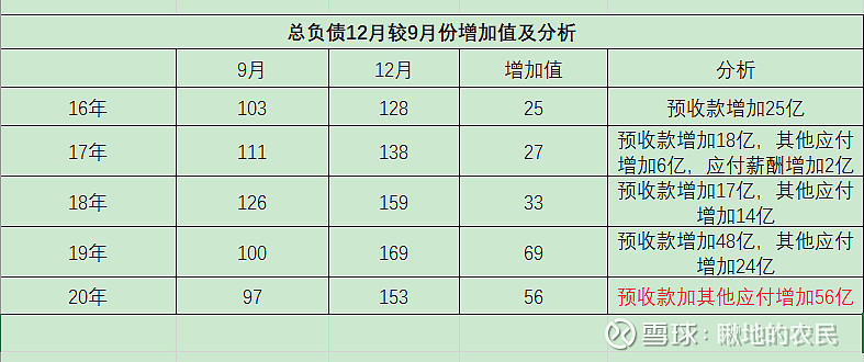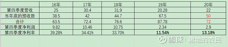 洋河股份(002304):每股净资产 24.07元,每股净利润 5.38元,历史净利润年均增长 47.08%,预估未来三年净利润年均增长 5.12%,更多数据见:洋河股份002304核心经营数据 洋河股份的当前股价 86.1元,市盈率 15.78,未来三年的估值假设和预期收益率如下:15倍PE,预期收益率 8.98%;20倍PE,预期收益率 45.3%;25倍PE,预期收益率 81.63%;30倍PE,预期收益率 117.95%。 洋河股份的2020年业绩快报:营收211亿,同比下降8.65%;实现归属于上市公司股东的净利润74.7亿,同比增长1.27%。报告期末,公司总资产5,38亿,比本报告期初增长0.69%,归属于上市公司股东的所有者权益385亿,比本报告期初增长5.40%。 下面进行详细分析: 一、资产负债表分析 1、净资产20年比19年增长20亿,而从16年至19年净资产同比前一年增长的分别为30、35、41、29亿, 20年较往年少了10亿以上,洋河的净资产的增加基本为当年净利润减上一年的分红,在2020净利润较19年基本持平的情况下,净资产为什么增幅不及往年,等年报数据出来再看。 2、总负债20年底交9月底增加56亿,统计了前几年年底总负债较9月底的增加情况,如下表: 结合前几年的情况可知,洋河年底的总负债较9月底增加,基本都是因为预收款和其他应付增加到导致的,而其他应付主要是应付经销商折扣、经销商保证金、履约保证金为主,所以判断2020年第四季度总负债增大的56亿为预收款和其他应付,比19年同期少,但是较18年正常年份对比,还是一个比较不错的数据。 19年洋河在年底留有67.5亿的预收款未确认收入,相比而言判断20年年底预收款估计在50亿左右,虽然洋河20年营收同比19年少了20亿,但是并没有急着追求业绩,而是给下一年留了足够的预收款(19年也是这样,在困难的时刻,不追求眼前的数据好看,没有为了业绩做高营收,甚至是刻意隐藏一点,这点非常佩服)。 二、经营数据分析 由上表计算可知,2020年洋河的第四季度的营收为22亿,净利润为2.9亿,第四季度净利润率只有13.2%,明显低于前三季度正常利润率。 统计了前5年洋河的第四季度的营收和当年年底的预收款、第四季度的净利润率,其中第四季度的营收和当年年底的预收款二者的之和可以大致看出第四季度的实际情况(营收加上预收款,可以大致看出利用预收调节营收部分数据) 1、从上表可知(其中50亿预收是估计的),洋河的第四季度的营收整体情况接近18年了,而19年前三季度去库存导致第四季度的67.5亿爆发增长不具对比意义。所以,2020年第四季度的实际营收肯定比22亿要好,但是还是没有达到18年的水平。 2、从上表可知,19年、20年第四季度的净利润异常的低 ,主要是因为营销费用等开支在第四季度计入比较多,是一个非常态,相信随着疫情好转、洋河逐步步入正轨,第四季度的营收和净利润率会恢复之前正常通道。 王耀2019年在一次演讲中说,洋河为了未来可以不要现在,这也是洋河精神的体现。 综上,洋河的2020年第四季度的营收实际情况比快报要好, 但是还没有达到2018年的水平。公司没有为了眼前的数据、业绩好看而做高营收,定力比较好。 更多企业分析,请关注WX公众号“ 瞅地的农民 ”。 作者:瞅地的农民原文链接:https://xueqiu.com/9731053588/173019164 转载请注明:www.51xianjinliu.com » 对洋河股份2020年业绩快报的分析 喜欢 (0)or分享 (0)