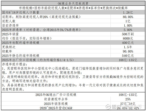 欧普康视(300595):每股净资产 3.09元,每股净利润 0.98元,历史净利润年均增长 38.92%,预估未来三年净利润年均增长 36.75%,更多数据见:欧普康视300595核心经营数据 欧普康视的当前股价 50.21元,市盈率 72.53,未来三年的估值假设和预期收益率如下:15倍PE,预期收益率 -58.43%;20倍PE,预期收益率 -44.57%;25倍PE,预期收益率 -30.71%;30倍PE,预期收益率 -16.85%。 $欧普康视(SZ300595)$ 之前写过两篇欧普康视的分析,包括实地调研的纪要。这次趁股价回调,静下心来再来捋一捋公司的逻辑,除去泡沫,客观地算一算空间、估值。 一、首先看市场空间: OK镜属于朝阳产业,还没有完全普及,对一般人而言,不说用过,就是听说过也很有限。网上对OK镜评价整体向好,OK镜对于矫正近视是有效果的;副作用大概就是角膜感染,网上也确实有戴镜后也存在角膜感染的案例,这对前期专业医师验光和后期镜片清洗和护理要求较高;不过并发症案例都可以通过修复治疗减缓。 按照我的测算,假设2025年OK镜渗透率能达到台湾2015年的水平,5%的渗透率,终端市场规模是540亿元,折算出厂口径规模在108亿-135亿。欧普康视按照25%的市场份额来算,2025年单OK镜营收在27亿-34亿,复合增长率26.45%~32.42%。 二、再看看行业的竞争者、壁垒 OK镜本身技术壁垒不是很高,原材料主要来自两家公司,美国博士伦和PARAGON公司,核心技术在于球面设计,OK镜片的内表面并不是一个球形,而是很多不同弯度的弧段圆滑的拼接起来,市面上OK镜的结构无外乎是VST设计和CRT设计。另外就是生产工艺,基本是购买生产线制造,像欧普康视的dreamvision就是采用全新一代日本进口生产线和全球工艺领先的镜片制作系统,医生通过网络下单后,智能系统自动导入数据库并计算出镜片的几何参数,镜片生产的整个过程全部由机器操作,无需人工介入。 技术上也发展了好几十年,从产品选择来看,国产和进口差别不大,从OK镜材质特性、设计匹配度、产品参数的精准性,佩戴舒适度、透氧性、透射比等指标来看,国产和进口的基本都能满足临床需求。 要比较的话主要看两个指标,一是矫正度数范围,400-600度这个区间只有欧普能做,其他包括进口的度数均没有欧普康视高,原因不在于技术上,是因为政策对临床试验过程中入组人员屈光度数有了明确限制,后续国内也不会有矫正范围更高的产品获批上市,在高度近视方面,欧普康视是垄断的。 二是透氧性,欧普产品透氧系数1.0,爱博的1.25,欧几里得1.28,欧普康视在行业只能排中上游水平。不过透氧性也不是越高越好,影响舒适度和透氧性取决于镜片的厚度,镜片越薄透氧性越高,越舒适。但OK镜的作用原理是需要一定的塑形力和维持力,硬度高对塑形效果有利,而增加厚度是提高镜片塑形力的一种方式,所以镜片的透氧性也是需要辩证的看,衡量标准关键要看各项参数平衡,完美的镜片材料是要保证最佳的透氧性能、最大的硬度、最好的弹性、最小的湿润角、最大的透射,目前材料未取得重大突破,这个要求很显然无法兼得。 所以OK镜壁垒高不在于技术,主要是一个牌照壁垒,国内对OK镜上市牌照管理非常严格,目前为止国内仅获批的7家进口、2家国产,欧普康视市占率24%。 三、公司经营层面 公司几个战略方向,一是经销向直销转型,通过参股或者购买视光中心,提高直销占比,好处是可以掌握渠道,OK镜基本靠医生推荐,另外就是可以将利润大头从渠道商抢回来。二是布局低浓度阿托品,战略方向很清晰。 四、逻辑 一是疫情常态化本土品牌的供应效率比海外强了,OK镜定制化生产,制作效率和售后还是很重要的;二是青少年网课增加了,对视力的影响加重;三是公司直销占比提升产品的量价提升。 五、财务层面 有几点值得注意,一是应收账款和存货占营业收入比例在上升,预收款下降,公司议价能力可能出现下降;二是商誉增加,之前商誉一直很少,20Q3 并购了一些销售网络。三是公司现金比较多,一直增长态势,研发投入相对占营业收入比重较小,是不是公司就不需要大规模研发了。这三个问题结合公司经营战略,可以解释,公司目前主要战略在扩展渠道,不在研发。 六、估值 根绝测算,到2025年营收净利CAGR超过30%,现在的566亿元的市值要到2023年才能消化到60倍以下,我觉得1年消化道60倍比较合理,给60倍PE,对于2021年340亿市值,还有近40%下跌空间,买入价56元。(非投资建议,仅供参考) 七、风险点 公司镜片原材料一直是向博士伦采购,这么暴利的行业,如果被美国断供或者提价可能会降低毛利率。 作者:西城小万原文链接:https://xueqiu.com/8889528003/173108941 转载请注明:www.51xianjinliu.com » 三谈欧普康视 喜欢 (0)or分享 (0)