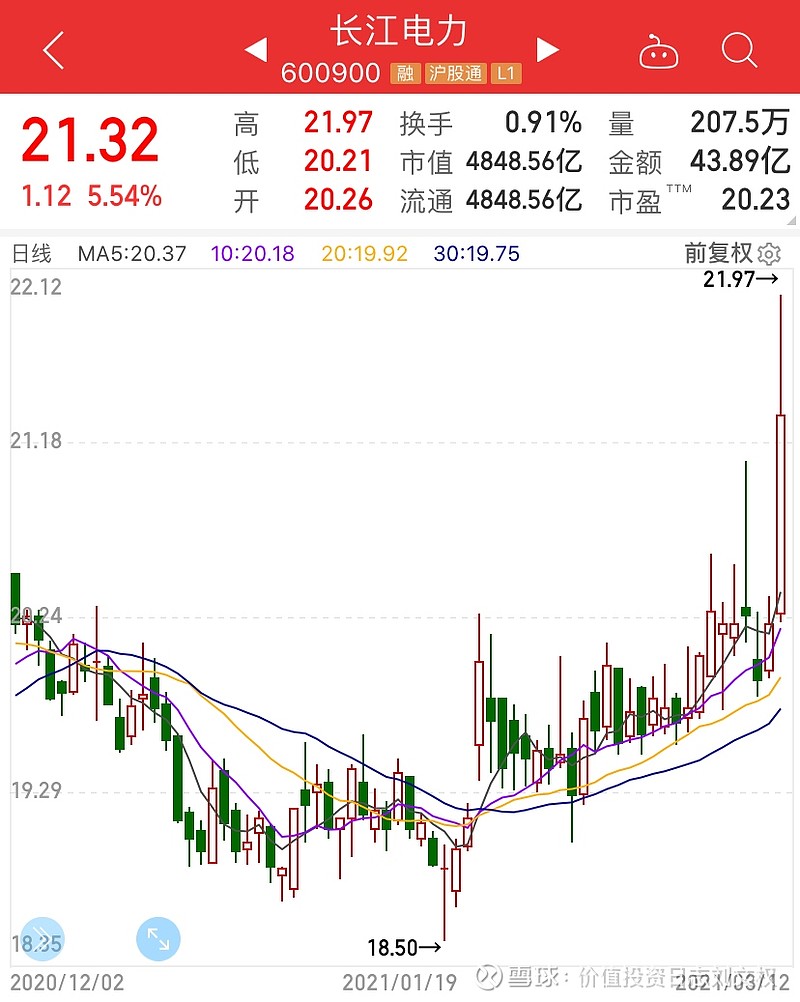 长江电力(600900):每股净资产 6.6元,每股净利润 1.03元,历史净利润年均增长 13.6%,预估未来三年净利润年均增长 0.71%,更多数据见:长江电力600900核心经营数据 长江电力的当前股价 17.07元,市盈率 16.67,未来三年的估值假设和预期收益率如下:15倍PE,预期收益率 -7.75%;20倍PE,预期收益率 23.0%;25倍PE,预期收益率 53.76%;30倍PE,预期收益率 84.51%。 日期:20210312 公司介绍: (1)发电: 去年长江流域的来水是偏丰的,导致去年的发电量上升了 7.8%,达到了 2,269 亿,三峡电站的发电量也是达到了全球单座水电站的发电记录,达到了 1,118 亿千瓦时。 (2)配售电: 配售电业务比较亮眼的是去年 5 月份把重庆的配售电资产注入到三峡水利,本次注入历时 4年,历经了多次波折,但最终的结果较好。 目前三峡水利也是三峡集团下面唯一的一个配售电业务平台,对于下一步工作的话,三峡水利这边第一个是经营好它的存量,提高效益,围绕着集团战略,例如“长江大保护”、“长江沿岸”,扩展新的盈利点。 (3)国际业务: 去年 4 月份我们完成了秘鲁 LDS 公司的股权交割,并在 4 月底顺利并表。 (1)围绕 LDS 公司完成了董事会的换届,目前董事会成员里以中方成员为主,当然后续我们也会引进一些外部董事。 (2)引入联合投资人。 (3)完成了一个强制法定要约收购,在上上周就已经完成了。 (4)投融资业务: 融资:最大的亮点就是我们去年 9 月在伦交所发行了 GDR。本次发行对公司的负债差不多降低了 4 个点,同时增厚 EPS。另外债券融资这块去年也创造了新高,债券融资成本在逐年下降。 (5)乌白项目: 乌东德去年顺利投产 8 台机组,预计 1H21 将完成剩余 4 台机组的投产发电,12 台机组将全部投产发电。 白鹤滩预计在 4 月份将开始蓄水,预计在 7 月 1 号之前首批机组投产发电。全部 16 台机组将在 1H22 完成投产发电。 公司会根据两个电站机组的进展情况以及资本市场的情况去推进资产的注入。还要看三峡集团的出售时点,内部会积极推进。 Q&A 环节 Q:目前公开信息里面,三峡水库的流量暂时看不到的原因? A:国家安全检查发现我们在公司网站上披露了一些水库的来水信息,他们建议是关闭,所以后续的水情信息估计大家也是看不到了。站在行业的角度其实我们是想去披露的,但是集团这边有要求,我们也没有办法,但是后续我们会积极与集团保持沟通。 Q:目前发电量情况? A:在 1-2 月份来水和去年同期相比差不多,但是进入 3 月份,考虑到现在上游的水库比如说杨房沟、两河口,还有我们马上要蓄水的白鹤滩,对下游会产生一定的影响,目前同比减少。 其实对于我们公司来讲,上半年主要是水量下泄的一个过程,而且它的发电量占比占全年来说不太大,各位投资人不要对我们的来水情况多虑。我们主要看 Q3 来水,因为这次的蓄水是一次性的,后续随着汛期的到来,水位去到死水位的话,公司也会发挥调度作用,去增加我们的发电量。 Q:乌东德对下游电量的贡献?白鹤滩蓄水对整体发电量的影响? A:在去年汛期的时候,乌东德正向的贡献已经显现出来了,当然增发电量大概不到 10 亿千瓦时。但是今年随着我们 12 台机组的投产,它的效益会更加明显。 Q:2021 年整体发电量展望? A:站在去年看今年,今年肯定是有压力的,因为历史发电量均未突破 2,200 亿千瓦时。如果以往年来讲的话,实际上今年的发电量应该是前年相同,我们不能拿去年做对比,和前几年对比相差不大。 发电在主营占比逐年下降,主要来源于我们公司的其他业务,比如配售电业务、国际业务。现在投资收益这一块占比在逐年的增加,这些也会逐渐降低来水波动对公司业绩的影响。 Q:公司海外投资的长期战略?未来三峡集团母公司和子公司谁来成为海外投资的主体? A:对于海外投资这块,实际上在三峡集团下面不仅限于长江电力平台,还有中水对外、三峡国际、湖北能源。从秘鲁这个国家来讲,它还有湖北能源查格亚电站、圣加旺Ⅲ等。之前在在海外业务拓展这块,我们跟集团也有过沟通,在配售电这块,未来公司业务更倾向于秘鲁的南美市场,以及欧洲市场这一块去拓展业务。当然不排除我们以往的业务重心,比如俄罗斯、蒙古这些,当然这些水电资源获取难度还是比较大,公司持续关注。 Q:西藏地区的水电开发计划? A:对于西藏雅鲁藏布江的水电开发,集团在十二五期间已经设立了西藏能投,一直在跟进当地新能源项目的开发,在西藏开发最多的是光伏,其次就是水电这块。目前雅鲁藏布江开发权国家还没有明确,但国内能开展大型水电站的集团,三峡集团的经验是最充足的。其次,因为三峡集团承担了很多大保护的职责,相信在开发权的获取上,集团有可能会胜出,但最终结果如何还是要看监管层。 Q:今年融资成本整体有上行趋势,公司融资成本和有息负债展望? A:这几年公司的融资成本一直在下降,去年上半年因为疫情的影响,公司也发行了一些和疫情相关的债券。后续随着碳中和的相关政策出台,成本也会有一定的下降。站在公司的角度,作为清洁能源,我们也有优势去发行低成本的债券。 Q:2020 年度利润分配预案目前已经征集完毕,投资者的反馈情况如何? A:因为这个是 10 号刚截止的,具体的还没有统计。肯定大家的目标都是想多分红,超过去年的 0.68 元。因为去年的业绩应该是公司有史以来最好的一年,相信公司管理层也会考虑到广大股东的诉求。 Q:公司持续增持二级市
