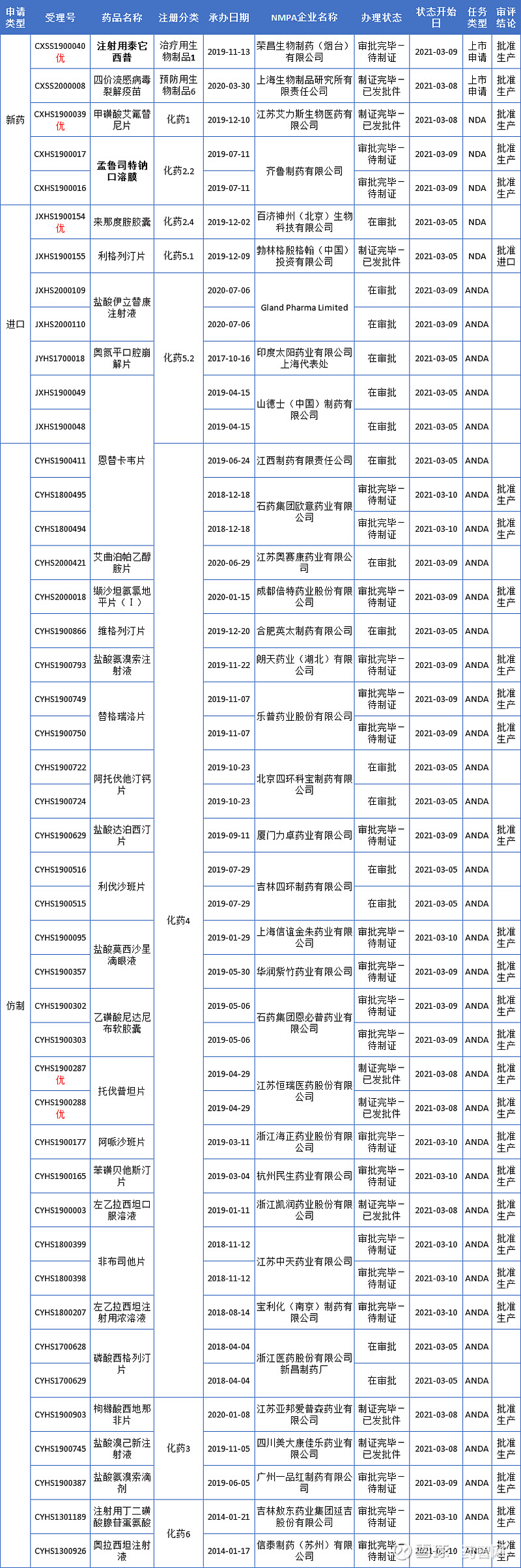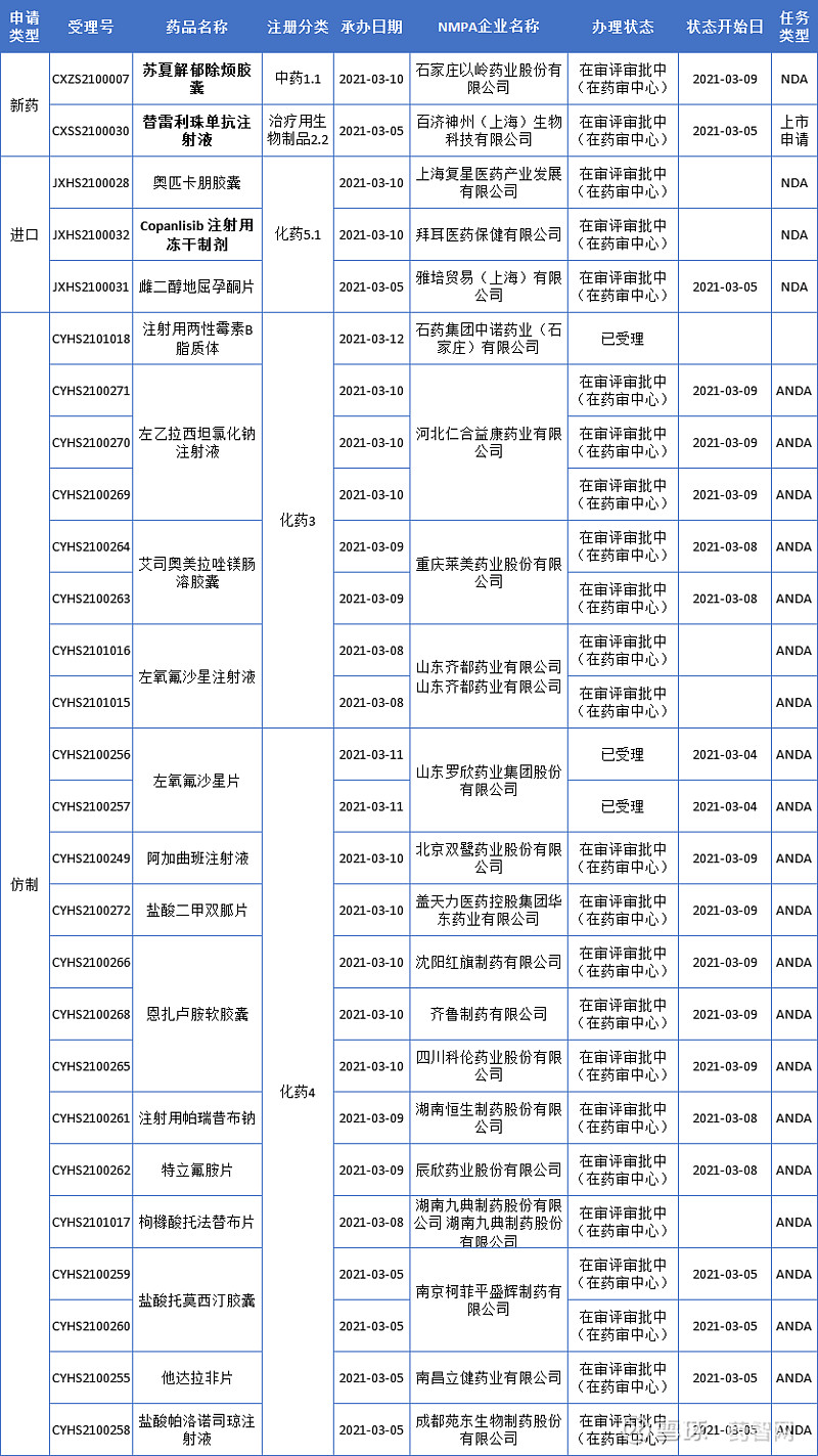 以岭药业(002603):每股净资产 6.56元,每股净利润 0.5元,历史净利润年均增长 17.24%,预估未来三年净利润年均增长 0.0%,更多数据见:以岭药业002603核心经营数据 以岭药业的当前股价 17.42元,市盈率 34.24,未来三年的估值假设和预期收益率如下:15倍PE,预期收益率 -56.95%;20倍PE,预期收益率 -42.59%;25倍PE,预期收益率 -28.24%;30倍PE,预期收益率 -13.89%。 荣昌生物1类新药泰它西普获批上市!中药1类抗抑郁新药报产,又一2类新药获批,以岭药业、齐鲁… 来源:药智网|森林 本周看点 1.荣昌生物首创新药泰它西普获批上市! 2.以岭药业中药1类新药苏夏解郁除烦胶囊上市申请获受理 3.齐鲁制药2类新药孟鲁司特钠口溶膜国内获批上市! 4.百济神州PD-1抗体第6项适应症申请获CDE受理 5.拜耳PI3K抑制剂在中国申报上市 本期(3月5日至3月12日),多个新药获批上市,包括荣昌生物全球首创系统性红斑狼疮新药泰它西普获批上市,以岭药业中药 1类新药申请获受理,还有齐鲁制药2类新药孟鲁司特钠口溶膜获批上市,更多动态如下: 国内审评审批·新动态 本周CDE有45个受理号(31个品种)报生产办理状态更新,其中荣昌生物注射用泰它西普和齐鲁制药孟鲁司特钠口溶膜备受关注,更多动态如下: 荣昌生物重磅新药泰它西普获批上市! 3月9日,荣昌生物自主研发的1类新药泰它西普新药获批上市,适应症为系统性红斑狼疮。泰它西普是荣昌生物研发的用于治疗自身免疫性疾病的一种新型融合蛋白,能同时抑制BlyS和APRIL两个细胞因子,具有全新的药物结构和双靶点作用机制。 荣昌生物于2010年向国家药监局申报泰它西普临床试验,2019年11月,荣昌生物的注射用泰它西普的新药上市申请正式获得CDE承办受理;2019年12月5日,泰它西普的新药上市申请获得CDE优先审评公示。同一天,国际风湿病领域年度盛会——美国风湿病学会(ACR)年会正在美国亚特兰大国际会议中心举办,荣昌生物以及北京协和医院的张奉春教授团队受邀,将泰它西普治疗系统性红斑狼疮的关键临床研究作为“最新突破性进展”在ACR大会万人主会场作口头报告。 此外,荣昌生物还在美国开发这款产品,荣昌生物计划于2021年上半年开展全球SLE的3期临床试验,包括美国、欧洲及其他国家地区。除了SLE之外,荣昌生物还在积极开展泰它西普针对六类其他B细胞介导自身免疫性疾病的后期临床试验,包括视神经脊髓炎频谱系疾病(NMOSD)、类风湿性关节炎(RA)、IgA肾炎、干燥综合症(SS)、多发性硬化症(MS)、重症肌无力(MG)等。 齐鲁制药2类新药孟鲁司特钠口溶膜国内获批上市! 近日,齐鲁制药孟鲁司特钠口腔速溶膜获国家药监局批准上市。孟鲁司特钠口溶膜是齐鲁制药按照2.2类申报的改良型新药,是孟鲁司特钠口溶膜制剂,也是齐鲁制药第二个批准上市的口腔速溶膜产品。 孟鲁司特钠是由默沙东原研开发的一种强效选择性白三烯受体拮抗剂,临床上适用于2岁至14岁儿童哮喘的预防和长期治疗,以及减轻过敏性鼻炎引起的症状。孟鲁司特是抗哮喘药大品种,原研产品有3种剂型,包括片剂、咀嚼片、颗粒。本次齐鲁制药获批的产品为全新剂型,市场潜力很大。 药智数据显示,齐鲁制药5个品种按照2.2类新药申报上市,其中奥氮平口溶膜、孟鲁司特钠口溶膜已顺利获批,还有3个口溶膜产品的新药上市申请在审评审批中,包括他达拉非口溶膜、阿立哌唑口溶膜、盐酸美金刚口溶膜。 国内审评审批·新受理 本周CDE新增报生产受理号27个,共19个品种,其中以岭药业苏夏解郁除烦胶囊和百济神州替雷利珠单抗备受关注,更多动态见下表: 以岭药业中药1类新药苏夏解郁除烦胶囊上市申请获受理 药智数据显示,以岭药业按中药1.1类新药申报的苏夏解郁除烦胶囊已在审评审批中。据悉,苏夏解郁除烦胶囊其方源于经方,出于临床,具有清热除烦、行气化痰之功能,是疗气郁痰阻、郁火内扰型抑郁症新药。 近年来,以岭药业积极布局中药创新药,已有3款新药报产。其中,中药创新药连花清咳片于2020年5月获批上市,12月被纳入《国家医保目录》。2020年6月“益智安神片”申报新药获CDE受理,本次报产的是一款治疗抑郁症的新药苏夏解郁除烦胶囊。 据悉,以岭药业目前已获临床批件品种涉及内分泌、泌尿系统、消化系统、风湿及精神类等疾病。此外,在研立项品种涵盖心血管系统、神经系统、呼吸系统、内分泌代谢系统、消化系统、妇科、儿科等疾病,处于临床前研究不同阶段。 百济神州PD-1抗体第6项适应症申请获CDE受理 3月5日,百济神州抗PD1抗体百泽安®(替雷利珠单抗)用于治疗接受铂类化疗后出现疾病进展的二或三线局部晚期或转移性非小细胞肺癌(NSCLC)患者的新适应症上市申请。这是百泽安申报上市的第六项适应症,也是第三项针对肺癌适应症的上市申请。 替雷利珠单抗注射液是一款人源化 lgG4 抗程序性死亡受体 1(PD-1)单克隆抗体,目前已有3项适应症获批,并有3项新适应症申请正在审评中。获批适应症包括,联合化疗用于治疗一线晚期鳞状非小细胞肺癌 (NSCLC)患者,治疗至少经过二线系统化疗的复发或难治性经典型霍奇金淋巴瘤患者以及 PD-L1 高表达的含铂化疗失败包括新辅助或辅助化疗 12 个月内进展的局部晚期或转移性尿路上皮癌患者。正在审评中的适应症包括,联合化疗用于治疗一线晚期非鳞状 NSCLC 患者、治疗既往接受铂类化疗后出现疾病进展的二或三线局部晚期或转移性NSCLC 
