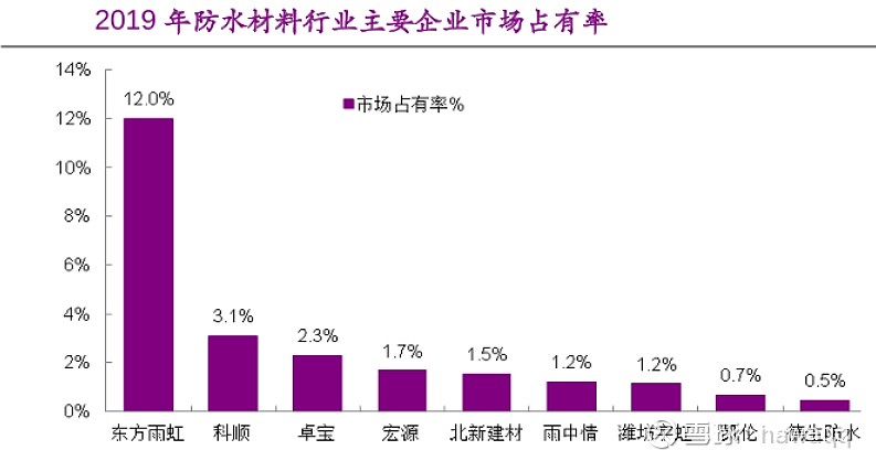 东方雨虹(002271):每股净资产 5.89元,每股净利润 1.01元,历史净利润年均增长 41.97%,预估未来三年净利润年均增长 29.83%,更多数据见:东方雨虹002271核心经营数据 东方雨虹的当前股价 30.42元,市盈率 23.13,未来三年的估值假设和预期收益率如下:15倍PE,预期收益率 8.99%;20倍PE,预期收益率 45.32%;25倍PE,预期收益率 81.65%;30倍PE,预期收益率 117.98%。 主营业务:防水材料收入占比81% 2019年,防水卷材、防水涂料、防水工程实现收入分别为99.8亿元、48.75亿元、23.48亿元,防水材料收入占比81.8%,是公司主营业务。 $东方雨虹(SZ002271)$ 毛利率和净利率较高 东方雨虹:国内防水材料绝对龙头 市占率将持续提升 数据来源:天风证券 2016-2020的数据显示,公司的毛利率维持在34%-42%之间,净利率保持在10.8-14.7%之间,盈利状况较好,显著优于同行。 行业地位:国内防水材料绝对龙头 东方雨虹:国内防水材料绝对龙头 市占率将持续提升 数据来源:中国产业信息网 中国产业信息网数据显示,2019年公司在国内防水材料行业市占率为12%,是第二名的将近4倍,是第二名到第九名市场份额的总和,东方雨虹在国内防水材料行业处于绝对龙头地位。 长期保持成长性的优秀公司 2008年公司营业收入为7.12亿元,净利润为0.44亿元,2019年分别增长至182.54亿元、20.66亿元,11年间,营业收入和净利润的复合年化增速分别为34%、42%,显示出高速成长的特征,是优秀的成长类公司。 公司竞争优势:低成本 1、淡季储备沥青可降低成本1.4%-2.8%,沥青是防水卷材的主要原材料,在成本中占比约28%,沥青主要需求来自道路建设(80%左右),而冬季不适合施工,所以在冬季是淡季,价格较低,公司在多个基地有沥青储罐,在冬季储存便宜的沥青,一个季度能节省成本20%-40%,全年可以节省1.4%-2.8%的成本。 2、公司在防水材料行业是绝对龙头,市场份额是第二名到第九名的总和,公司采购的沥青和乳液规模较大,采购价格低于竞争对手。 3、公司在全国拥有28个生产基地,大规模生产能降低生产成本,低于竞争对手。 公司未来发展的主要逻辑 逻辑一、公司市占率未来将不断提升 1、行业标准提升 中小企业受到挤压 目前我国防水材料企业数量非常多,2019年有10752家企业,分散着众多的小企业,集中度较低,2017年6月质检总局办公厅印发《2017 年建筑防水产品质量提升 专项行动方案》,引导行业质量提升,另外,环保监管措施也在加强,防水材料行业整体标准提升,中小企业生存空间受到挤压,行业集中度将提升。 2、“三道红线”政策将加速房地产行业集中度提升 相关部门针对房地产行业出台措施,即“三道红线”,剔除预收款的净资产负债率不得大于70%;净负债率不得大于100%;现金短债比不得小于1倍。如果三条红线都触碰,被划入红色档,不能新增有息负债;如果碰到两条线,则被划入橙色档,负债年增速不得超过5%;如果碰到一条线,则被划入黄色档,负债年增速不得超过10%;如果三条都未触碰,则被划为绿色档,负债年增速不得超过15%。这一措施,将严格限制房地产企业融资冲动,整个行业将面临压力,财务状况不良或者管理不善的企业将被淘汰出局,房地产企业集中度将进一步提升。而大型的优秀房地产企业更愿意和优秀的防水材料企业合作,这将推动防水材料行业集中度提升。 3、房地产集采模式推广 刺激防水材料行业集中度提升 随着房地产行业集采模式的推广,下游的防水材料行业明显受益,2019年国内防水材料行业头部企业增速普遍在30%以上,就是明显受益于集中度提升,而这个趋势还将继续。 4、目前精装修渗透率仅32% 离80%还有较大提升空间 2016年后国家出台政策推动精装房发展,之后精装房渗透率快速提升,2019年全国精装修商品房渗透率达到32%,而欧美发达国家精装房渗透率均在80%以上,国内精装房渗透率还有较大提升空间。相对于毛坯房,精装房对于防水材料的需求更大,并且防水材料在房地产行业的成本仅2%-3%,占比很小,地产企业对价格不敏感,而对于品牌和质量比较看重,大型房地产企业更愿意和优秀的口碑好的企业合作,随着精装房渗透率的提升,也将刺激防水材料行业集中度的提升。 东方雨虹是目前国内防水材料行业的绝对龙头,在防水材料行业集中度快速提升过程中将充分受益,2011年东方雨虹的市占率仅4%,2019年已经提升至12%,2020年有望超过15%,需要注意的是,国外防水材料龙头企业的市占率超过30%,超过30%以后进入相对稳定状态,也就是说,东方雨虹的市占率还有一倍左右的提升空间,当未来市占率达到30%以后,再次提升将面临困难,这是需要注意的。 逻辑二、不断扩张业务边界 同心扩展具有较大空间 公司远景目标是打造防水全产业链产品的生态系统,在防水材料业务以外通过自建和收购不断扩张品类,已经涉及非织造布、节能保温、硅藻泥、砂浆、腻子粉、建筑涂料等领域。2016年12月底,公司收购德国建筑涂料企业DAW ASIA,进军建筑涂料领域,机构预计东方雨虹2020年建筑涂料收入约6亿元,而目前建筑涂料市场的前三名都是国外企业,立邦市占率12%排名第一,东方雨虹在建筑涂料领域有增长空间。2019年,公司防水材料以外的业务收入33亿元,同比增长20%,随着业务边界的不断扩张,将增加公司收入。 逻辑三、基建还有较大发展空间 防水材料将受益 我国人均基础设施拥有量相当于发达国家的20%-30%,在交通、能源、水利、环保等领域存在短板,国内对于基
