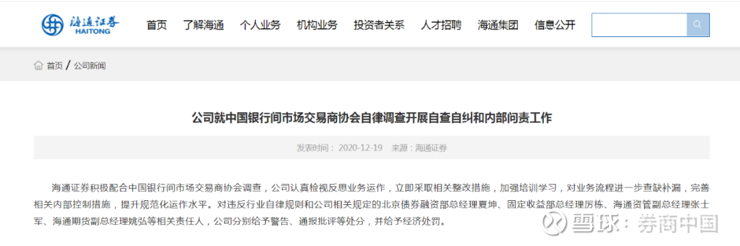 海通证券(600837):每股净资产 10.24元,每股净利润 0.75元,历史净利润年均增长 39.41%,预估未来三年净利润年均增长 30.88%,更多数据见:海通证券600837核心经营数据 海通证券的当前股价 13.34元,市盈率 17.03,未来三年的估值假设和预期收益率如下:15倍PE,预期收益率 89.07%;20倍PE,预期收益率 152.09%;25倍PE,预期收益率 215.11%;30倍PE,预期收益率 278.13%。 永煤违约引发的信用债市场整顿大潮逐步向纵深推进。 12月20日晚间,海通证券突然在公司官网发布文章表示,海通证券积极配合中国银行间市场交易商协会调查,公司认真检视反思业务运作,立即采取相关整改措施,加强培训学习,对业务流程进一步查缺补漏,完善相关内部控制措施,提升规范化运作水平。 对违反行业自律规则和公司相关规定的北京债券融资部总经理夏坤、固定收益部总经理厉栋、海通资管副总经理张士军、海通期货副总经理姚弘等相关责任人,公司分别给予警告、通报批评等处分,并给予经济处罚。 永煤违约之后,信用债市场存在的违规发行等问题引起监管关注,11月18日,交易商协会公告,发现海通证券股份有限公司及其相关子公司涉嫌为发行人违规发行债券提供帮助,以及涉嫌操纵市场等违规行为,涉及银行间债券市场非金融企业债务融资工具和交易所市场公司债券。 永煤违约余波未尽 永煤违约对债券市场带来了剧烈的冲击。永城煤电信用债违约事件发生后,不仅造成了永城煤电及其控股股东河南能源化工集团存续期债券的交叉违约,更是快速传导成债券市场恐慌情绪的蔓延,从银行间市场蔓延至交易所市场,一级市场发行大量取消、二级市场债券折价抛售、债券基金净值大幅下跌等。 中信证券12月18日的一份研报指出,国企违约事件首先在机构中引起了较大反响,不仅是债券投资者,权益、商品投研机构均开始关注信用风险的扩散情况,甚至信贷、信托体系也受到一定冲击。 情绪最终反映在一二级市场,在违约发生的短时间内,大批信用债取消发行,特别是部分地区和行业的相关债券受到的冲击更加明显。 随着违约爆发,信用利差也开始走阔,10月以来3年期AAA债利差保持在40bp、3年期AA债利差保持在120bp左右。事件发生后,信用利差迅速走阔,低等级高收益债被机构大量清仓,宏桥、苏宁等主体开展了危机下的债券购回操作。11月21日金稳委会议以来,利差上行趋缓但抛售潮仍未停息,中信证券统计目前3年期AAA债、3年期AA债利差分别达55bp、176bp,较事件发生前走阔幅度达12bp、44bp。 “近年违约主体是从民企到国企,从蚂蚁到大象。”中信证券在研报中指出,2017年以来,新增违约主体总资产规模整体上升、国企违约规模占比明显提升。今年下半年以来,共有12家国企发生实质违约或展期,当前债券余额合计1149.27亿元。华晨、紫光等大型国企事件连发,国企隐忧已成为现实,“大而不倒”的论调、“政府兜底”的信仰正面临重塑。 多家中介机构风险暴露 永煤违约之后,信用债市场存在的违规发行等问题引起监管关注,多家中介机构风险暴露,被监管机构等立案调查。 11月12日,交易商协会对永煤控股等相关机构启动自律调查。 11月18日,交易商协会公告,发现海通证券股份有限公司及其相关子公司涉嫌为发行人违规发行债券提供帮助,以及涉嫌操纵市场等违规行为,涉及银行间债券市场非金融企业债务融资工具和交易所市场公司债券。 11月27日,证监会宣布,根据相关金融管理部门移送的永煤控股及相关审计机构涉嫌违法违规的线索,证监会决定依法对永煤控股及希格玛会计师事务所立案调查。 11月30日,交易商协会在对相关企业进行自律调查的过程中了解到,东海基金管理有限责任公司存在涉嫌为发行人违规发行债务融资工具提供便利,以及涉嫌操纵市场等违规行为。依据《银行间债券市场自律处分规则》,交易商协会将对东海基金管理有限责任公司开展自律调查。 12月4日,交易商协会发布新的《非金融企业债务融资工具主承销商尽职调查指引》,督导主承销商尽职履责,切实加强主承销商自律管理。 新的调查指引体现了三方面内容: 第一,压实主承销商责任,进一步明确主承销商职责边界。督促主承销商坚持职业操守、勤勉尽责、诚实守信。将尽职调查工作的开展情况,作为评价主承销商从事债务融资工具业务是否尽职履责的重要依据。 第二,丰富尽职调查内容,细化各项工作要求。 第三,增设自律管理和自律处分等内容。新设专门章节,对主承销商在尽职调查过程中违反自律规则的不同情形,分门别类采取不同程度的自律管理或自律处分措施,加大对违规行为的惩处力度。 加强信用违规违法行为处理,夯实信用市场基础的信号也在不断释放。12月14日,中央纪委国家监委网站披露,近日,知名评级机构东方金诚国际信用评估有限公司原总经理金永授、东方金诚江苏分公司原总经理崔润海被“双开”,涉嫌犯罪问题被移送检察机关依法审查起诉,所涉财物随案移送。 更早之前,11月21日金融委召开第四十三次会议,研究规范债券市场、维护债券市场稳定工作。 市场逐步好转 有市场人士认为,虽然违约给市场带来惨烈教训,但是风险暴露之后,市场发展有望进一步往良性状态靠拢。 “尽管我们对明年的违约率不乐观,我们也可以看到正面的信息越来越多,债券违约处置在提速且处置的手段更加灵活和多元化,债市正往一
