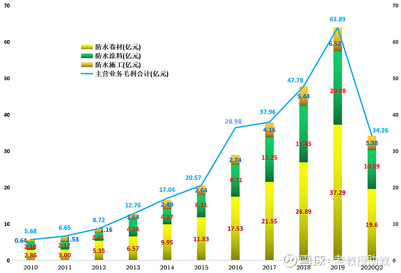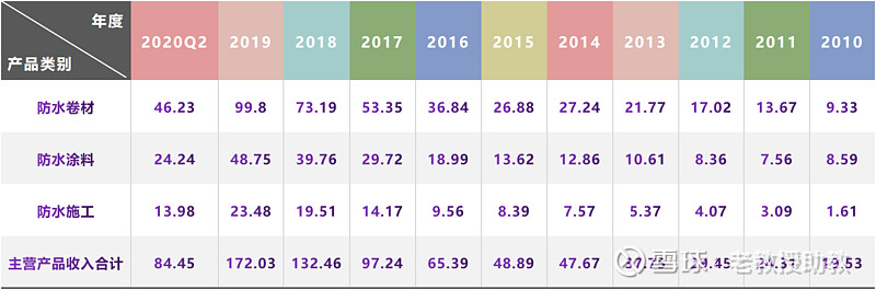 东方雨虹(002271):每股净资产 5.89元,每股净利润 1.01元,历史净利润年均增长 41.97%,预估未来三年净利润年均增长 29.83%,更多数据见:东方雨虹002271核心经营数据 东方雨虹的当前股价 30.42元,市盈率 23.13,未来三年的估值假设和预期收益率如下:15倍PE,预期收益率 8.99%;20倍PE,预期收益率 45.32%;25倍PE,预期收益率 81.65%;30倍PE,预期收益率 117.98%。 前言:东方雨虹一年前(2020年3月12日)收盘价为20.78元/股,一年时间股价上涨了129%。公司当前PB7.73倍,PE32.9倍,总市值1117.76亿元。 一、公司主营业务分析 东方雨虹主营防水材料生产销售(包括防水卷材和防水涂料,2019营收占比80.24%)、防水工程施工(2019营收占比15.92%)、以及其他业务(包括民用建材、节能保温、非织造布、特种砂浆、建筑涂料、建筑修缮、建筑粉料等多元业务, 2019合共营收占比3.54%)。 公司防水卷材和防水涂料产品图片——图片来自公司官网产品页面 1.1、公司历年主营业务收入按产品类别划分分析 以上表格中的数据单位为亿元 公司按主要产品/业务类别划分可以分为防水卷材、防水涂料、防水施工三大类别。 (1)、公司主营产品营业总收入从2010年的19.53亿元增加至2019年的172.03亿元,年复合增长率为27.3%; (2)、防水卷材产品营业收入从2010年的9.33亿元增加至2019年的99.8亿元,年复合增长率为30%; (3)、防水涂料产品营业收入从2010年的8.59亿元增加至2019年的48.75亿元,年复合增长率为21.2%; (4)、防水施工业务营业收入从2010年的1.61亿元增加至2019年的23.48亿元,年复合增长率为34.6%。 由以上数据可知,最近10年公司总体收入保持了较高的增长速度,其中防水卷材和防水施工业务高于公司整体业务增长率,而防水涂料的增长速度则相对稍慢。由于防水施工业务在2010年的基数较小(营收仅为1.61亿),因此其较容易实现更高的复合增长率。防水卷材和防水涂料产品是公司历年主要的收入来源。 1.2、历年主营业务毛利率按产品类别分析 (1)、公司主营业务整体毛利率从2010年的29.1%增加至2019年的37.14%。历年整体毛利率变化呈现出一定的波动性:从2010年至2016年总体毛利率呈上升趋势,从2016年至2019年呈下降趋势,但是2020Q2整体体毛利率相对2019年有所上升。公司整体毛利率从长期来看呈总体上升趋势,显示出近10年公司盈利能力总体有所提升。 分具体产品/业务来看: (2)、防水卷材毛利率从2010年的30.67%上升至2019年的37.36%,其毛利率的最高值为2016年的47.58%。 (3)、防水涂料的毛利率从2010年的25.39%上升至2019年的41.19%,其毛利率的最高值为2016年的45.88%。 (4)、防水施工业务的毛利率从2010年的39.78%下降至2019年的27.76%,其毛利率的最高值为2011年的49.53%。 由以上数据可知,近10年公司防水卷材和防水涂料的毛利率总体均呈上升趋势,而防水施工业务毛利率总体呈下降趋势;由于防水卷材和防水涂料占公司营业收入的大部分,防水施工业务所占比重相对较低,因此公司总体毛利率变动趋势跟随防水卷材和防水涂料毛利率变动趋势。 1.3、历年主营业务毛利额按产品类别分析 (1)、公司主营业务毛利额从2010年的5.68亿元增长至2019年的63.89亿元,10年间增长了1025%; (2)、公司防水卷材毛利额从2010年的2.86亿元增长至2019年的37.29亿元,10年间增长了1204%; (3)、公司防水涂料毛利额从2010年的2.18亿元增长至2019年的20.08亿元,10年间增长了821%; (4)、公司防水施工业务毛利额从2010年的0.64亿元增长至2019年的6.52亿元,10年间增长了920%; 由此可以看出,公司防水卷材产品为公司历年创造了最高的毛利额,并且年复合增长速度也最快(高于公司整体毛利额增长速度),是公司业绩增长主力。防水施工业务毛利额由于2010年的基数较低,因此也保持了较高的增长速度。防水涂料的毛利增长速度相对稍低。防水卷材和涂料产品是公司历年利润的主要来源。 1.4、公司历年产品(非金属矿物制品)销量情况分析 公司在2012至2019年报中披露了“非金属矿物制品”销量,公司没有直接称呼此产品销量为防水卷材的销量,但是根据公司产品构成和销量的单位(以“平方米”为单位)来看,“非金属矿物制品”即指防水卷材。 (1)、防水卷材的销量从2012年的9345万平方米增加至2019年的81654万平方米,共增长了773.77%,年复合增长率为36.3%,保持了较快的增长速度。 (2)、防水卷材的单位售价从2012年的18.12元/平方米下降至2019年的12.22元/平方米,整体呈下降趋势, 8年间单位售价共下降了32.56%; (3)、防水卷材的单位毛利额从2012年的5.72元/平方米下降至2019年的4.57元/平方米,8年间共下降了20.1%,小于同期单价的下降幅度;分具体年度来看,防水卷材单位毛利额从2013年至2016年呈上升趋势,从2016至2018年呈下降趋势。 考虑到防水卷材的销量近8年持续快速增长,单价和单位毛利呈总体下降趋势,而单位毛利的下降速度小于单价的下降速度,可以看出公司奉行产能持续扩张的政策,这一政策为公司产品带来了规模经济,规模经济促使产品单价和产品单位成本持续下降,而单位毛利仅小幅下降,这样使得公司赚取了更多利润。 二、公司财务状况分析 2.1、资产基础分析——公司历年总资产、净资产、留存收益变化趋势分析 (1)、公司的总资产从2010年的21.98亿元增长至2020年的279.62亿元(如下图),11年间增长了11.72倍,年复合增长率为28.9%,历年均呈同比增长趋势; (2)、公司归属于股东的净资产从2010年的10.18亿元增长至2020年的144.63亿
