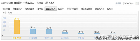 双汇发展(000895):每股净资产 4.58元,每股净利润 1.49元,历史净利润年均增长 26.47%,预估未来三年净利润年均增长 9.35%,更多数据见:双汇发展000895核心经营数据 双汇发展的当前股价 34.38元,市盈率 21.94,未来三年的估值假设和预期收益率如下:15倍PE,预期收益率 -15.03%;20倍PE,预期收益率 13.29%;25倍PE,预期收益率 41.61%;30倍PE,预期收益率 69.93%。 双汇发展未来怎么发展? $双汇发展(SZ000895)$ 过去十年双汇发展的表现,可称得上是消费股中的肉制品龙头,泡面的时候加根双汇火腿肠,美滋滋,如果自己是双汇的股东就更好了。 在此将对双汇发展(000895)的分析分享,只用作自己投资成长的记录和学习交流,不构成任何投资建议。 这波牛市,终于被人发现了双汇的价值。 1 主营业务,经营模式及行业简况 公司主营为畜禽屠宰,肉类食品的加工销售和食品包装。 消费者对双汇更熟悉的必然是他的加工肉制品,也就是直达C端的产品;但是也不能忽视占双汇营收64.83%的屠宰业务。虽然屠宰业务的毛利只有9.22%,但是也比同行业的雨润4%以下的毛利高得多。 双汇的战略倾向于围绕肉类加工产业做大做强屠宰和肉制品两大主业,适当发展饲料业和养殖业等产业,完善产业链,提高产业化经营水平。双汇生鲜肉渠道分为四大类,份额从大到小为特约店、商超、农贸、餐饮加工。与雨润、龙大、中粮肉食等竞争对手相比,双汇在农贸批发、餐饮加工等走量为主的低附加值渠道占比偏低,而特约店、商超等更能实现品牌溢价的渠道占比较高,科学化的渠道结构有利于推高产品整体售价。 从营收规模来看,在肉质品加工行业双汇行业领军地位还是很明显,比第二三名的上海梅林,龙大肉食高出一倍还多,当然, 竞争者还有个没上市的金锣集团;不过目前看来暂时不能动摇双汇的地位。 2 公司财务状况分析 1、通过总资产判断公司实力及扩张能力 双汇发展近5年增长率振幅较大,19年增长重回25%以上,感觉是受到了猪肉价格上涨所致,肉贵了香肠吃的就多了?/(ㄒoㄒ)/~~,从季度报数据来看,增长率不降反增,大概率2020年可以保持20%以上的增长率。 2、通过资产负债率判断公司债务风险 双汇发展近5年的资产负债率不断提高,虽然同行业对比远好于行业竞争对手,公司债务违约风险较低,但依然值得关注。 3、看有息负债和货币资金判断公司偿债风险 公司近年来短期借款大幅增长,而与17年对比,18、19年货币资金大幅降低,勉强覆盖有息负债,且货币资金占总资产比例较低,据公司解释是由于分红和增加了银行存款。但毕竟2018年出现负值,以后还是要时刻关注是否有流动性的风险。 4、通过“应收应付”和“预付预收”判断公司行业地位 双汇发展(应付+预收)远远大于(应收+预付)},无息占用上下游公司近45亿的资金,占用资金能力极强,说明其行业龙头地位非常稳固。 5、通过固定资产判断公司的类型 本数值近4年逐年降低,并在19年首次降到40%以下,降为中型资产类公司。不过通过行业对比发现,双汇发展的固定资产比率依然高于竞争对手。 6、看投资类资产,判断公司是否不务正业 双汇发展近两年增加了大笔的投资类金融资产,是新增的银行结构性存款。存货近两年大幅增加,占总资产比例达到三成以上,说明其19年总资产大幅增加主要原因是存货增加所致,这点需要重点关注。 7、通过营业收入判断公司的行业地位及成长能力 双汇发展近四年的营收同比增长比较不稳定,2019年前规模未出现明显增长。笔者认为19年大幅增长是受猪肉价格上涨所致,公司未来的成长能力存疑。 8、通过毛利率判断公司产品的竞争力 双汇发展的平均毛利率在20%左右,虽然不高但远远好于行业竞争对手,说明其产品竞争力较强。 9、通过费用率判断公司成本管控能力 双汇发展的费用率非常低,说明公司的成本管控能力较强,行业地位也非常稳固。 10、通过主营利润判断公司的盈利能力及利润质量 双汇发展的主营利润率在11%左右,已经远远好于同行业竞争对手了,主营利润率不断上升,对比同行业可知,其盈利能力和利润质量都非常不错。 11、通过净利润判断公司的经营成果及含金量 双汇发展的净利润同比增长自18年来重回两位数,但其净利润现金比率大幅下降,净利润增速变大,但含金量降低。 12、通过归母净利润判断公司自有资本的获利能力 双汇发展近4年ROE都在30%以上,而且非常稳定,说明资本获利能力较强,不确定性较低,具有较高的投资价值。 13、通过经营活动产生的现金流量净额,判断公司的造血能力 公司现金流量净额近三年逐年下降,说明公司造血能力受到行业周期的影响,公司可能已经进入成熟稳定期。 14、通过分红率判断公司品质 双汇发展近三年的分红率均大于60%,令人叹为观止,说明其赚到了钱,对股东大方,公司厚道。 3 企业及行业分析 虽然近五年来双汇的财务表现随着周期上下波动,但是股价却稳步爬升,2019年至今更是极为亮眼。那么双汇发展未来预期如何? 01行业所处阶段及市场竞争格局 先说屠宰行业吧,在定点屠宰企业中,落后产能占比较高,仅10%屠宰场实现全机械化,70%屠宰场仍为手工屠宰。 这部分产能很落后,龙头企业有利用自己的资金和规模优势进行兼并。拉长周期看,屠宰行业的集中度提高一直在进行。近8 年来看,规模以上定点企业屠宰量占全国屠宰量的比重在30%-35%,但规模以上定点屠宰企业数量从2012 年4