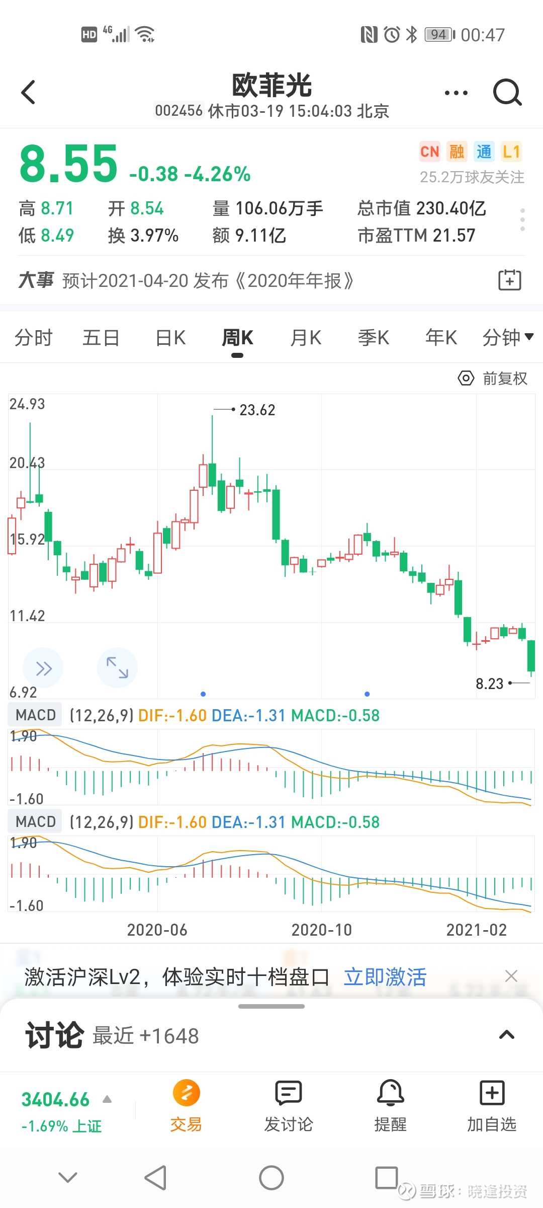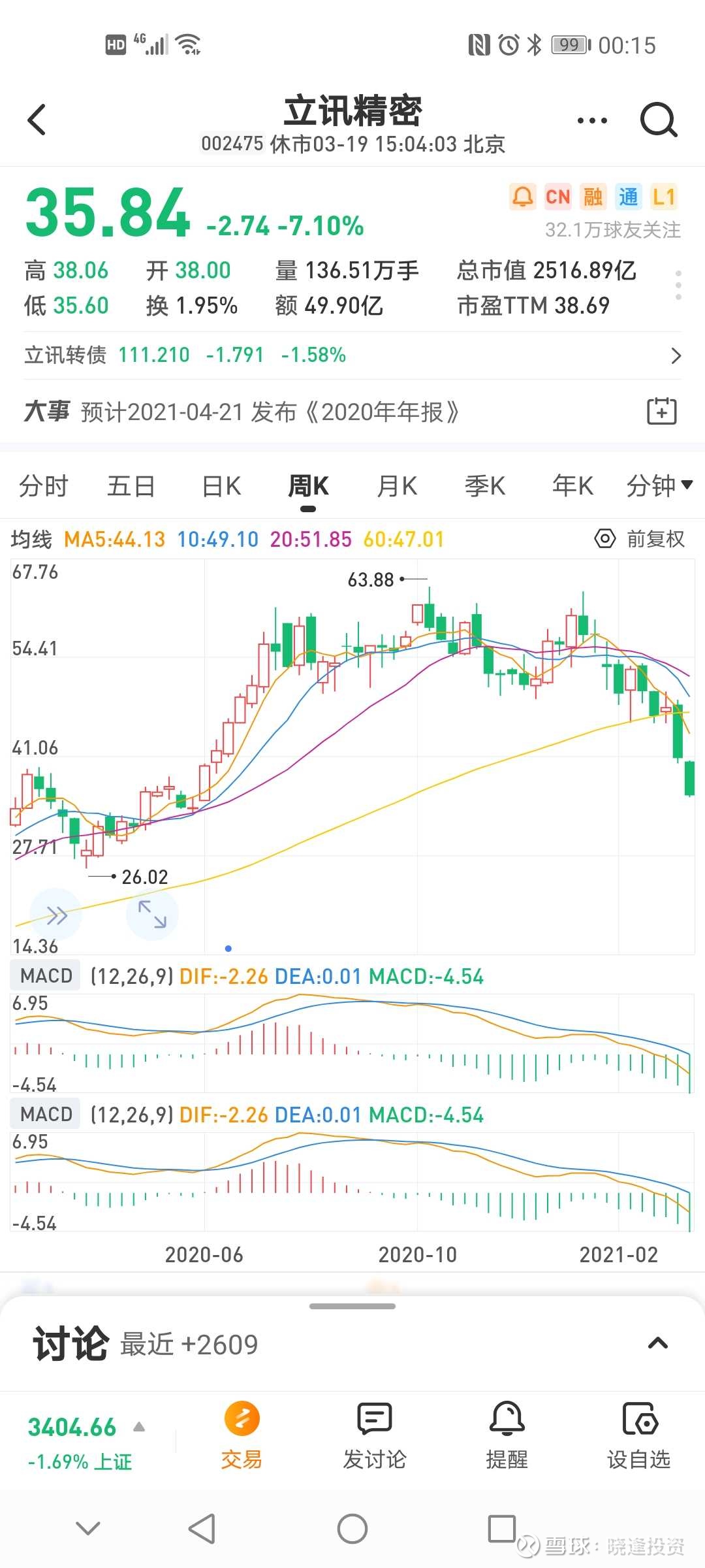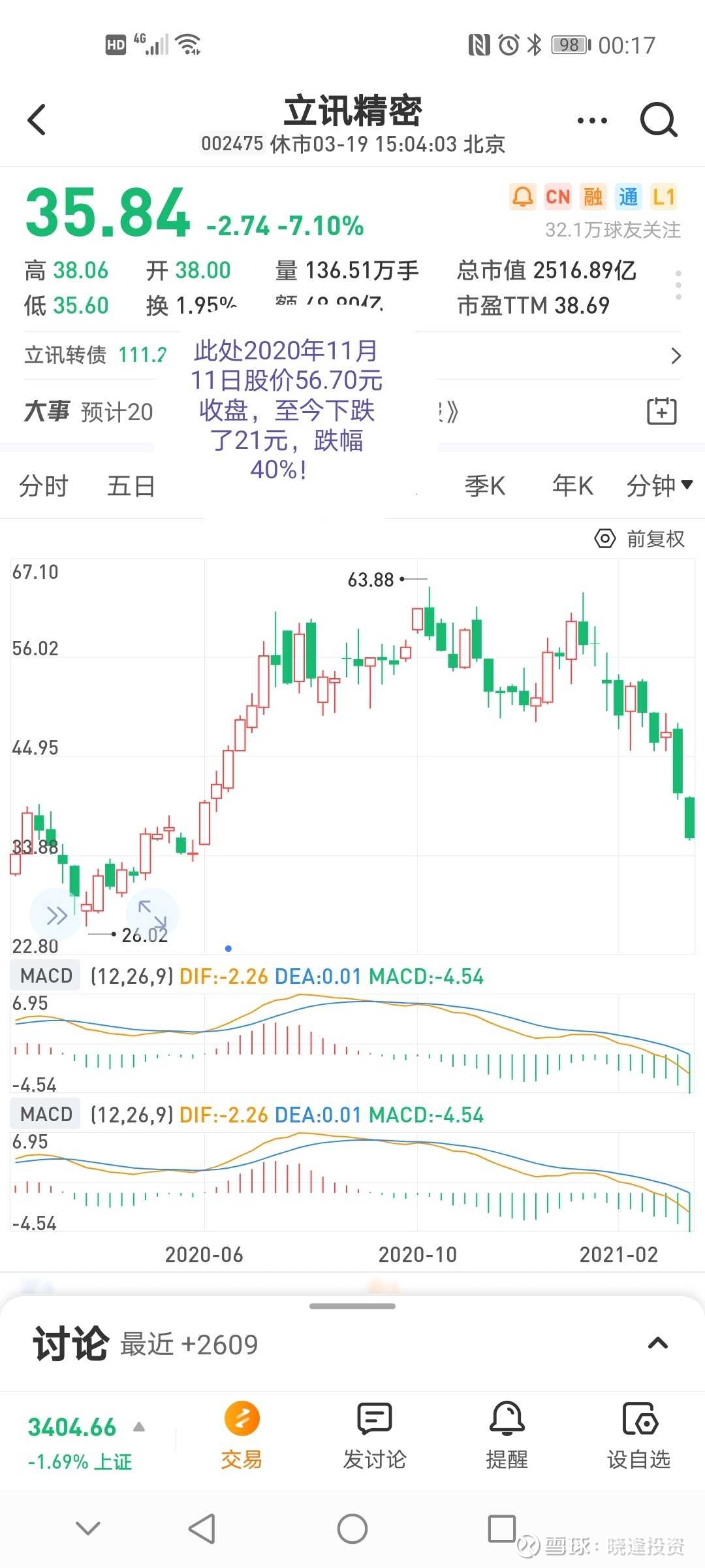 立讯精密(002475):每股净资产 3.42元,每股净利润 0.66元,历史净利润年均增长 49.72%,预估未来三年净利润年均增长 45.02%,更多数据见:立讯精密002475核心经营数据 立讯精密的当前股价 37.91元,市盈率 51.45,未来三年的估值假设和预期收益率如下:15倍PE,预期收益率 -38.73%;20倍PE,预期收益率 -18.31%;25倍PE,预期收益率 2.11%;30倍PE,预期收益率 22.53%。 春天花会开,可好景不常来。 人生苦短,好运不常在。 股票投资,大多数一路坎坷,跌的时候多,涨的时候少! 现在流行词:结构性牛市,结构性牛股。 涨总有涨的理由,跌有跌的解释。 英雄末问出处! 周末暮然回首,立讯精密“原形毕露”?两个半月时间竟然“闪了一下小蛮腰”!股票价格从最高价63.26元下跌到本周五最低价35.60元,跌幅高达43.7%,可恨可悲。 唉,往事不堪回首。 当初的时间,2020年11月11日晓逢著文:立讯精密该不该清仓? 原文如下,点击连接重读。网页链接 晓逢利用自己独创的赚钱秘籍《炒股一招致胜》的操盘系统分析显示:该股头部已经到达!是卖出去的最佳时机喽! 四个月的时间重新回顾:晓逢判断准确! 眼下绩优股的逃顶比抄底还重要。 逃顶就是水平!逃顶就是真本事。 也许有许多投资者说:我们是价值投资者,择时不重要,重要的是选择好上市公司,套过三年又何妨?好公司套过五年都无所谓。 死扛好公司? 其实,公司好不好,投资者说了不算,上市公司老总也不好说公司未来的五年如何?企业发展是动态的,面对各种意想不到的险境,种种困难都是意料不到的。 有句老话,也是口头禅:前途是光明的,道路是曲折的!为什么说今天的贵州茅台股票这么好,其原老总季大师为什么不倾家荡产买入其股票呢?特别是其退休后能明正言顺买入呢? 说腾讯今天的“伟大”?为什么其创始人在上市初期就大手笔套现了呢? “伟大”是偶然的,并不具有必然性!只不过是“基因”强些。有谁会在拼多多上市之初肯定的,斩钉截铁的说其就是“伟大”?超越淘宝,京东呢?马后炮一大堆? 当下最流行的一首歌:有多少爱可以重来? 转换在股市有多少亏损可以承受?人生有几个三年,五年可以等待?万一该股是乐视第二呢?康得新第三呢? 正视现实,正确的把握好投资方法。择股重要,可择时同样重要!老话一句,来得早,不如来得巧。 “生不逢时”?为什么。 也许在股市行情里,好公司也要好价格,讲的就是“时机”的把握。 立讯精密再优秀,何时才能重上63.88元? 死扛?扛死? 往事如烟,未来难说。 敬畏生命,敬畏股市,小心驶得万年船。 扪心自问:你能否学得好?巴菲特为什么不投资中概股呢? 对于晓逢而言:买得好,不如买得巧!好公司还需好价格!个人投资者死扛不融资还能死扛,融资呢?还能死扛吗? 看一下“傍大款”的欧菲光 “落水的凤凰不如鸡”!鸡金们早就悄悄的跑光喽。死扛,扛死! 个人观点仅供有缘人参考。晓逢微信号Xfzqpx 作者:晓逢投资原文链接:https://xueqiu.com/8404578050/174946451 转载请注明:www.51xianjinliu.com » 晓逢死扛立讯精密 喜欢 (2)or分享 (0)