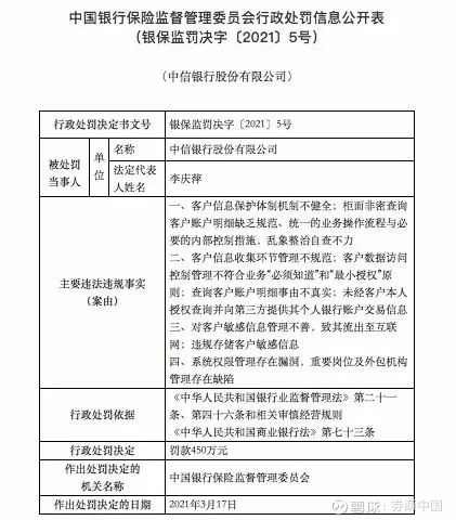 招商银行(600036):每股净资产 22.3元,每股净利润 3.13元,历史净利润年均增长 26.51%,预估未来三年净利润年均增长 14.28%,更多数据见:招商银行600036核心经营数据 招商银行的当前股价 31.63元,市盈率 8.82,未来三年的估值假设和预期收益率如下:15倍PE,预期收益率 121.54%;20倍PE,预期收益率 195.38%;25倍PE,预期收益率 269.23%;30倍PE,预期收益率 343.07%。 中信银行(601998):每股净资产 8.84元,每股净利润 0.88元,历史净利润年均增长 22.6%,预估未来三年净利润年均增长 8.22%,更多数据见:中信银行601998核心经营数据 中信银行的当前股价 5.29元,市盈率 5.34,未来三年的估值假设和预期收益率如下:15倍PE,预期收益率 216.26%;20倍PE,预期收益率 321.68%;25倍PE,预期收益率 427.1%;30倍PE,预期收益率 532.51%。 立案调查10个月后,“池子案”迎来处置结果。 3月19日,银保监会披露的一则行政处罚决定书显示,中信银行因客户信息保护不到位等问题,被处以罚款450万元。记者了解到,此次处罚与脱口秀演员池子控诉中信银行擅自泄露其个人流水事件有关。 中信银行方面回应券商中国记者称,对于检查发现问题,该行高度重视、深刻剖析,立查立改。截至目前,相关问题已整改完毕。 事涉客户信息保护 根据银保监会披露,此次中信银行涉及的具体违法违规案由包括: 一是客户信息保护体制机制不健全;柜面非密查询客户账户明细缺乏规范、统一的业务操作流程与必要的内部控制措施,乱象整治自查不力。 二是客户信息收集环节管理不规范;客户数据访问控制管理不符合业务“必须知道”和“最小授权”原则;查询客户账户明细事由不真实;未经客户本人授权查询并向第三方提供其个人银行账户交易信息。 三是对客户敏感信息管理不善,致其流出至互联网;违规存储客户敏感信息。 四是系统权限管理存在漏洞,重要岗位及外包机构管理存在缺陷。 中信银行方面回应道,对于检查发现问题,该行高度重视、深刻剖析,立查立改,主要措施包括: 在全面风险管理体系下进一步加强个人客户信息保护体制机制建设,制定完善并实施专项制度; 进一步完善检查机制,加强考核、处罚和问责; 加强关键环节流程管控,通过技术手段强化相关人员的行为管理; 加强对外包公司客户信息管理的强制约束与监督等。 “截至目前,相关问题已整改完毕。”该行表示。 “池子案”大结局 记者了解到,这张罚单与曾经闹得沸沸扬扬的“池子案”有关。 回溯2020年5月6日下午,脱口秀演员池子(本名王越池)在微博平台公开与前东家笑果文化之间的经济纠纷,控诉该公司拖欠其演艺报酬,提出仲裁后却被索赔3000万。 这一纠纷还牵扯到一个第三方,即中信银行。池子前述微博中同时表示,笑果文化寄给他的材料包含其个人银行账户的交易明细,他怒斥中信银行未经本人授权,泄露个人隐私,将其个人账户交易明细交给笑果文化,且称“中信银行说这是配合大客户的要求”。 该事件迅速将中信银行与个人银行账户信息的安全性推上舆论焦点。去年5月7日凌晨1点左右,中信银行快速完成内部处置,并作出道歉,“我行员工未严格按规定办理,提供了王越池的收款记录。对此,向王越池郑重道歉!”中信银行已按制度规定对相关员工予以处分,并对涉事支行行长予以撤职。 去年5月7日下午,券商中国记者了解到,上海银保监局已介入该事件的调查。 去年5月9日,银保监会消费者权益保护局发布公告表示,已对中信银行涉嫌泄露客户信息事件启动立案调查程序。该公告显示,2020年3月,中信银行在未经客户本人授权的情况下,向第三方提供个人银行账户交易明细,违背为存款人保密的原则,涉嫌违反《中华人民共和国商业银行法》和银保监会关于个人信息保护的监管规定,严重侵害消费者信息安全权,损害了消费者合法权益。 时隔10个月,银保监会对中信银行开出百万罚单,也意味着池子指责中信银行泄漏其个人隐私一案正式迎来调查结果。 金融信息保护不断加码 事实上,池子事件之所以引发关注,重要原因在于客户对个人金融敏感信息的安全问题早已心有疑虑。据移动支付网发布的《中国个人金融信息保护执法白皮书》不完全统计,2020年,央行开出的行政处罚罚单中,案由涉及“个人金融信息”的共181张,涉罚金额合超1.8亿元人民币,其中,无论是处罚金额还是频次上,银行都是受罚“大户”。 从公布的裁判文书看,银行员工私自对外提供个人客户信息的情况也时有发生,尤其是在银行支行一级,由于信息安全把关不严,“内鬼”钻漏洞泄漏个人客户信息等问题更具有一定普遍性。 但随着各方对个人信息保护的意识不断提高,涉及客户切身经济利益的金融信息更是这一议题里的重中之重。有国有大行人士表示,近年银行对客户资料的管理越来越严格。 “现在都不允许员工用手机对着设备,防止员工拍内部资料和客户信息。”该人士告诉记者,“银行的监控没有死角,对外服务客户就要进行‘双录’(录像、录音),对内就通过授权制度,限制员工查看客户信息的权限。” 此次,中信银行也表示,不仅在制度层面进行机制完善,还通过技术手段强化了对相关人员的行为管理。 监管部门也屡屡强调客户信息安全的重要性。2020年4月,时任银保监会副主席的黄洪就曾在国新办发布会上表示,银保监会高度重视银行保险机构网络安全工作,尤其把客户信息保护作为重中之重,并