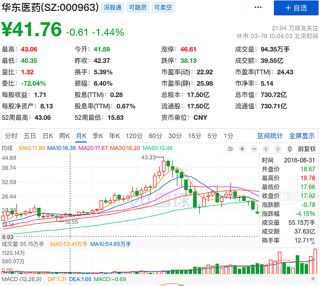 恒瑞医药(600276):每股净资产 5.23元,每股净利润 1.1元,历史净利润年均增长 30.79%,预估未来三年净利润年均增长 28.72%,更多数据见:恒瑞医药600276核心经营数据 恒瑞医药的当前股价 80.59元,市盈率 72.91,未来三年的估值假设和预期收益率如下:15倍PE,预期收益率 -63.61%;20倍PE,预期收益率 -51.48%;25倍PE,预期收益率 -39.35%;30倍PE,预期收益率 -27.22%。 华东医药(000963):每股净资产 6.66元,每股净利润 1.55元,历史净利润年均增长 37.67%,预估未来三年净利润年均增长 21.0%,更多数据见:华东医药000963核心经营数据 华东医药的当前股价 17.89元,市盈率 11.72,未来三年的估值假设和预期收益率如下:15倍PE,预期收益率 91.86%;20倍PE,预期收益率 155.82%;25倍PE,预期收益率 219.77%;30倍PE,预期收益率 283.72%。 这个市场是很奇怪的 去年这个时候华东医药一度下探15元,一片看衰。今年有创新高趋势一片看多,是去年的华东崩了吗? 从2020年的视角看,财务数据并没有出现大幅波动,净利润的增长和roe基本都保持往年的水平。然而却出现了市场的一致看空,发生了什么? 营收占比30%却贡献了79%的的医药制造,其中阿卡波糖和百令胶囊是其中的大单品。而华东的阿卡波糖却在集采中出局,市场出局。 但是华东的跌势却是从18年中就开始的: 从营收占比确实可以看出,营收占比70%的商业却只带来不足17%的利润。市场所担心的是其研发能力,这里是不是还可以理解华东的销售渠道足够强劲? 现在的华东为什么能上涨看多的大多数文章,其实都在围绕着医美进行“想象”。医美的赛道可以发生很多故事,股价上涨后就开始给它强化能够上涨的其他理由比如原来的现金牛作为基础盘,医美能借助它的销售能力很好的开展,22倍动态市盈率低估等等。 完美的印证了那句:你不行的时候肺腑之言都是废话,你可以的时候废话都充满哲理。 也许这里的可以仅仅是k线图上的上涨,为什么? 因为从实际的营收上没有得到所谓真正“业绩”支撑,医美占比依旧很毛碎。 肯定有人会说“买股票就是买预期” ,如果是这样去年就预期它研发能力不行,集采失去了大单品。股价涨起来就各种好,这不是扇了自己左脸现在又想扇自己右脸嘛? 华东依旧低估,这是从数据上认可的。它是一个老白马了,我去年,今年也都有小小参与。 我选择了暂时撤退,并不是不看好这家企业,而是短期的市场情绪让人觉得就是在炒买炒卖。如果是这样,短线搏杀即使让我赚取一倍利润我也觉得不是我的认知带给我的,仅仅是运气。我能理解的是,华东的基础盘足以支撑现在的市值,医美若能带来更多利润确实也会上一个台阶。 其实更重要的是因为我没有做到知行合一,一直以来两融账户的运用都在可控范围。1.5倍以内的杠杆,即使真的到了警戒线能够选择外调资金直接买券还券。但是越发觉得自己很多时候竟然把杠杆资金当作自己的操作资金,一直告诉自己很危险。 让自己冷静一会,重新思考企业,思考市场的价格,思考自己的资金。 还会在合适的时候再度参与进华东,希望不会就此卖飞。 千亿华东,相信我们能在三年内看见。 暂别华东 #华东医药# 作者:金融大大恶原文链接:https://xueqiu.com/7888304839/174965976 转载请注明:www.51xianjinliu.com » 华东医药我会不会后悔 喜欢 (0)or分享 (0)