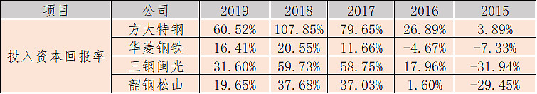 方大特钢(600507):每股净资产 4.52元,每股净利润 1.18元,历史净利润年均增长 31.24%,预估未来三年净利润年均增长 6.45%,更多数据见:方大特钢600507核心经营数据 方大特钢的当前股价 8.22元,市盈率 6.95,未来三年的估值假设和预期收益率如下:15倍PE,预期收益率 74.32%;20倍PE,预期收益率 132.43%;25倍PE,预期收益率 190.54%;30倍PE,预期收益率 248.64%。 $方大特钢(SH600507)$ 今年春节后,在市场的一片哀鸿遍野中,我的组合却逆势大涨,我问过自己好几次:运气,还是实力?这个答案还是在未来让时间给出吧。 对于完善的投资体系,总是盈亏同源的,比如,华东医药,我的第一重仓股,虽然2月份以来上涨60%以上,但我从2018年12月7日建仓以来,一直买买买,买到30%左右的仓位一直持续2021年2月8日,共坐了2年又2个月的冷板凳,基本上还在成本线附近徘徊,是运气不好,还是水平不行?然而后面短短一个多月,上涨60%,又当怎讲?所以,单纯看投资标的的表现是没法判断策略有效与否的,也正因此,我依靠设立的组合,才得以在前两年近半仓位横盘的情况下整个组合实现了年化30%以上的收益。我前期总结了投资以来的许多教训,都非常深刻,今天开始,借组合这波逆势大涨给我的勇气与信心,来分享下自己这两年多以来的几笔投资的逻辑,也当是对自己投资的一次比较全面的梳理归纳,希望各位同道中人多多指教。 今天和大家分享的是方大特钢,为什么说是狙击战呢,原因有二:一是对标的比较熟悉,曾经在2017年投资过,实现了翻倍的收益,所以对它情有独钟;二是本次交易虽然提前埋伏时间较长,有半年之久,但一直认为是个难得的双击机会,在低位持续加仓,所以特称之为狙击战。 一、为什么选择方大特钢 1.整个行业极低的估值 2019年在国内外不稳定因素增多、国内经济存在下行压力、供给侧结构性改革红利进一步弱化的综合作用下,我国钢铁行业呈现产量继续增加、企业效益下滑、行业结构有所优化的特点。期间,铁矿石受巴西淡水河谷溃坝、澳大利亚飓风等事件影响,价格大幅上涨;焦炭因环保政策趋严,供应量受到限制,价格低位反弹;在成品价格走低和原料价格回升的挤压下,钢厂利润空间明显收窄。反正就基本上全是利空消息,钢铁行业的利润被大幅压缩,上市公司里出现大量破净股,但是,即便如此,没有一家出现亏损,说明前几年的供给侧结构性改革还是有成效的,作为成熟的周期性行业,全行业的估值已经到了一眼即知胖瘦的低估区域。 2.低成本的护城河 钢铁行业和造纸、化工等材料行业一样,产品同质化严重,对这类企业,最大的护城河就是低成本,下面是A股上市的钢铁公司中成本控制靠前的几家公司前几年的吨钢利润: 可以看出,在2015年钢铁行业最困难的一年,很多钢企面临亏损,方大特钢还能保持盈利,这就是低成本的优势,而且公司的吨钢利润基本上一直碾压其它钢企,截至今年3月16日17时已披露2020年年报的25家主流钢铁上市公司中,方大特钢加权平均净资产收益率暂列第一,另悉,在中钢协对标企业排名中方大特钢吨材利润位列第一,这就是实力,这就是最大的护城河! 还有我比较关注的投入资本回报率,公司也是持续碾压其它同行: 公司2020年的投入资本回报率为100%。虽然说,数据好未必能代表公司好,但好的公司肯定会有良好的财务表现。 3.优秀的企业文化 公司的优秀企业文化相信大家早有耳闻。还是直接附上公司年报中的内容:学习先进企业经验,推动薪酬、绩效制度改革,坚持以奋斗者为本,以干成事论英雄,通过实行“以岗定级、以级定薪、人岗匹配、易岗易薪”,实行长期激励与短期激励相结合,坚持组织绩效和个人绩效相结合,遵循结果导向原则,即以结果、贡献为导向,让收入向指标突出、业绩优秀的奋斗者倾斜,真正地体现多劳多得,少劳少得。与此同时,公司通过建立小改小革、合理化建议激励奖,管理创新创效激励奖,技术、技能提升激励奖,科技攻关激励奖,特殊人才引进激励奖,学历教育提升激励奖,劳动竞赛激励奖等创效渠道,激发干部员工的积极性、主动性、创造性,推动企业持续健康的发展。 说实话,看到这段文字,让我这个体制内的人顿感心情澎湃,都有想去大干一场的冲动。 二、什么时候买 市场上优秀的标的不少,但并不是都值得买入。我买入股票的基本依据还是估值。当然,不同类型的企业估值的方法还是有区别的,我将自己的组合持仓分为三类:中小盘成长股、稳定增长股、周期及低谷反转股。显然方大特钢属于第三种,即周期及低谷反转股中的周期股。此种类型企业,对买入时机的判断,我主要根据三点,一是所要投资的企业必须是行业中的龙头企业或者特色企业;二是考察企业的历史估值,必须处于历史的低位,至少是较低位;三是企业或者整个行业的最困难时期即将过去。 对照这三点,来看下方大特钢:一是公司在行业中的地位,虽然按规模公司不靠前,但公司在企业文化、公司治理、成本控制及财务指标方面一直是独占鳌头。二是估值,从公司的历史PB可以看出,到2019年底,公司的估值基本一直处于低位,也就是差不多这个时候,我将公司列入了重点关注。三是等待企业的经营拐点出现,其实这也是整个行业的拐点。公司在2020年2月28日公告了2019年财报,我注意到2019年第四季度营收的降幅已经从三季度的37.48%收窄到了4.64%,这是一个很好的信号。对周期股及困境反转股,一定要