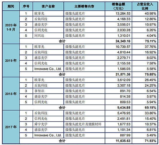欧菲光(002456):每股净资产 2.79元,每股净利润 -0.72元,历史净利润年均增长 0.0%,预估未来三年净利润年均增长 0.0%,更多数据见:欧菲光002456核心经营数据 欧菲光的当前股价 8.45元,市盈率 -12.31,未来三年的估值假设和预期收益率如下:15倍PE,预期收益率 -66.41%;20倍PE,预期收益率 -55.22%;25倍PE,预期收益率 -44.02%;30倍PE,预期收益率 -32.83%。 集微网报道,随着全球智能手机双摄、三摄及多摄的快速渗透,下游摄像头模组厂商也需求旺盛。如欧菲光摄像头模组出货量从2018年的5.51亿颗增长至2020年前三季度的5.53亿颗,舜宇光学出货量从2018年的4.23亿颗增长至2020年的5.93亿颗,丘钛科技出货量从2018年的3.71亿颗增长至2020年的4.84亿颗。 而上述厂商的供应商及主营滤光片的湖北东田微科技股份有限公司(以下简称:东田微)的产能也从2018年的2.16亿片增长至2020年前三季度的5.56亿片。背靠大客户,东田微的业绩得以快速增长,不过,其收入主要靠红外截止滤光片,营收结构略显单一,且产品价格受智能手机市场变动影响较大,造成2018年净利润增速暴跌76%。同时,其对大客户的依赖也与日俱增,尤其是对欧菲光单一客户的营收占比更超过四成。 近日,东田微提交了招股书拟创业板上市,上市前夕,其大客户欧菲光便陷入失去北美A客户事件,外界猜测此事或对其业绩造成影响。在此情景下,其冲刺IPO的胜算又有多少? 东田微营收结构单一,2018年净利增速暴跌76% 招股书显示,东田微主要从事精密光电薄膜元件的研产销,并具备镀膜材料自研和生产能力,主要产品包括应用于智能手机摄像头模组的滤光片和光通信元件,可广泛地应用于消费类电子产品、车载摄像头、安防监控设备以及光通信信号传输、数据中心等多个应用终端领域。 目前,其已进入全球知名摄像头模组厂商和智能手机品牌厂商的供应链,与欧菲光、丘钛科技、信利光电、舜宇光学、盛泰光学、同兴达等摄像头模组厂商建立了合作关系,与屏下指纹识别方案提供商汇顶科技建立业务联系并实现批量出货,产品广泛应用于华为、小米、OPPO、vivo、传音、三星等知名品牌智能手机;光通信元件类产品已与中际旭创子公司苏州旭创、中国电子十三所下属麦特达、瑞谷光网等建立长期稳定的合作关系。 业绩方面,东田微的营收和净利润呈波动上涨。2017年至2020年前三季度,分别实现营收1.62亿元、1.36亿元、2.84亿元和3.24亿元,年均增长率为28.76%;净利润分别为2440.42万元、586.33万元、2017.21万元和4435.93万元。 可以看出,2018年其业绩显著下滑,营收同比下降2541.30万元,降幅为15.71%,净利润下降1854.09万元,降幅达75.97%,远超营收的降幅。据其解释,主要系2018年全球智能手机出货量较2017年明显下滑,从2017年度14.66亿部下滑至2018年度的13.95亿部,行业竞争加剧导致产品价格下降较快,加之毛利率下降、其购置机械设备以扩增产能并加大研发投入,期间费用率有所上升所致。 同时,从主营业务的收入构成来看,东田微的营收结构也略显单一。报告期内,营收主要来源于摄像头滤光片业务下的红外截止滤光片产品,其中光学玻璃、高强度超薄蓝玻璃和树脂红外截止滤光片的合计收入分别为1.49亿元、1.16亿元、2.51亿元和3.02亿元,营收占比分别为98.11%、91.15%、91.31%和95.06%,始终高达九成。 而生物识别滤光片的销售收入始终较低,2018年至2020年前三季度,收入分别为230.89万元、1579.55万元和843.05万元,营收占比为1.81%、5.76%和2.65%。主要受限于ToF镜头模组的成本较高,在中低端机型的渗透较慢,市场需求有限,其更于2020年起逐步减少该产品的生产。 光通信元件产品则几乎处于停滞状态,实现销售收入分别为286.41万元、897.96万元、805.03万元和728.19万元,营收占比为1.89%、7.04%、2.93%和2.29%,多在2%左右徘徊。 再来看毛利率,近年间,其综合毛利率分别为33.45%、27.09%、29.77%和30.54%,2018年下滑幅度较大,同比减少6.36%。主要受手机产业链整体环境影响价格下降较快,收入规模减少所致。而同行五方光电、美迪凯和水晶光电的平均毛利率为40.22%、33.98%、29.79%和28.60%,仅在2020年前三季度略低于东田微。 从经营情况来看,尽管东田微的业绩总体呈上升趋势,但营收结构却较为单一,且产品收入和单价主要取决于智能手机市场需求的变动情况,颇为被动。与此同时,其对大客户的依赖程度也较高,且第一大客户欧菲光失去北美A客户事件一出,东田微的业绩又是否会产生较大变动? 欧菲光独占四成营收,东田微产品竞争力存疑 客户方面,2017年至2020年前三季度,东田微对前五大客户的销售收入分别为1.16亿元、0.94亿元、2.16亿元和2.43亿元,占当期营业收入的比重分别为71.93%、69.19%、75.85%及75.11%,客户集中度较高。 集微网注意到,2017年,其第一大客户还是丘钛科技,不过2018年以来,欧菲光便始终占据其第一大客户的位置,对该客户的销售金额分别为0.36亿元、1.07亿元和1.33亿元,营收占比分别为26.49%、37.76%和40.98%,比例不断攀升。对此其解释称,要系欧菲光摄像头模组销售大幅上升,且其停止自产红外截止滤光片业务,对外采购量增加所致。 不过业内周知,欧菲光子公司于2020年7月被美列入实体清单,恐向苹果供货受阻。果然,2021年3月,欧菲光便发布了关于境外特定客户跑单的公告,引发市场关注。公告显示,“近日公司收到境外特定客户的通知,特定客户计划终止与公司及其子公司的采购关系,后续公司将不再从