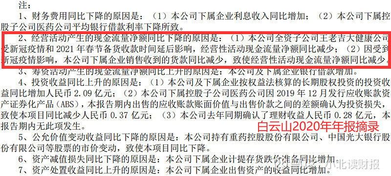 白云山(600332):每股净资产 17.08元,每股净利润 1.79元,历史净利润年均增长 20.2%,预估未来三年净利润年均增长 0.0%,更多数据见:白云山600332核心经营数据 白云山的当前股价 27.69元,市盈率 15.44,未来三年的估值假设和预期收益率如下:15倍PE,预期收益率 6.23%;20倍PE,预期收益率 41.64%;25倍PE,预期收益率 77.05%;30倍PE,预期收益率 112.46%。 $白云山(SH600332)$ $片仔癀(SH600436)$ $云南白药(SZ000538)$ 要问A股中药行业中哪家企业混得最好,大家首先想到的可能是云南白药或者片仔癀。的确,从市值上来看,这两家企业的总市值均已经超过1600亿元,在中药行业中稳稳拿下了领先的龙头位置。 然而,我们要是抛开资本市场,单从企业经营规模的角度来选龙头,那非白云山莫属。2019年白云山凭借650亿元的营业总收入拔得头筹,相当于2个多云南白药、11个多片仔癀的规模。 但是规模大不等于质量好,近年来白云山屡陷业绩困境,股价整体表现低迷。前两天公司出了年报,我们来扒翻扒翻~ 一、从现金流量表看问题 读财报的核心就是阅读企业资产负债表、利润表、现金流量表这三张报表。2020年白云山的报表中最值得关注的是现金流量表,我们可以顺着这张表寻找公司在经营管理等层面存在的问题。 看现金流量表简单来说就是看企业的三种现金流:经营活动现金流、投资活动现金流和筹资活动现金流。2020年白云山上述三个现金流净额分别为5.85亿元、-10.88亿元和14.39亿元。 其中变动最大的两项就是经营和筹资现金流了,相对于2019年的数据,一个遭遇“脚踝斩”、一个显著飙升,我们分开来看。 二、骤减的经营现金流 先看看历史数据,2018-2019年公司经营活动产生的现金流量净额为52.2亿元、50.2亿元,而2020年白云山经营赚的现金直接同比减少了88%,看上去企业的资金链仿佛要断裂了……难道是公司的经营出了问题吗? 这时候我们就需要联系一下公司的利润表了,看一下白云山的业绩表现。2020年白云山实现营业收入617亿元、净利润29.2亿元,分别同比下滑5.05%、8.58%。拉长时间年限来看,这是公司近五年来第一次收入下滑、第二次利润下滑了,公司的成长性已经越来越弱。 虽然公司的业绩表现不如意,但也没有“断崖式”的下跌,所以说业绩不是引起白云山经营现金流的剧烈变动原因。 那么我们再去企业的资产负债表找原因,可以发现白云山2020年流动负债中的“合同负债”项目减少的很多,合同负债可以将它当做预收账款。那么是不是因为2020年公司预收的钱少了,导致现金流迅速减少了呢? 细读公司的年报就能验证我们的猜想,根据官方解释,营活动产生的现金流量净额同比下降的原因有两个: (1)本公司全资子公司王老吉大健康公司受新冠疫情和 2021 年春节备货收款时间延后影响,经营性活动现金流量净额同比减少。 (2)因受到新冠疫情影响,本公司下属企业销售收到的货款同比减少,致使经营性活动现金流量净额同比减少。 而白云山在解释“合同负债”的变动时也使用了相同的说辞。简单来说就是,王老吉主要在春节卖的多,2021年春节比较延后,企业主要在2021年1月收钱,而前年企业的春节档又是主要在2019年12月收钱,这就导致2020年1月-12月没有收到两个春节档的钱,导致现金流看上去少了。 这样听上去倒是挺合理的,但是实际情况是怎样我们就不得而知了。在上述分析过程中,我们确实也发现了企业陷入业绩困境的尴尬状态。主要是受疫情影响,白云山的“大健康”板块拖累了业绩,说白了就是王老吉卖的不行了,多数抗微生物类药产品如头孢克圬等收入也是负增长。 但是目前白云山的头部产品金戈倒是卖得不错,2021年公司能否重回正轨还得拭目以待。 三、骤增的筹资现金流 筹资现金流指的是企业因为筹集资金产生的现金,它的增长可不是什么好事,一般企业出现大额有息借债时才会产生高额的筹资现金流。 2020年白云山的筹资现金流从-22.3亿元增加到14.3亿元,主要是因为公司银行借款的增加。 要研究银行借款,我们就得去联系企业的资产负债表了,2020年白云山的长短期负债占营业收入的比重超过14%。比上一年增长了30%左右。奇怪的是,公司账上的货币资金和交易性金融资产总共占比33%,明明不缺钱为啥还要借钱呢? 有投资者针对白云山“存贷双高”的现象进行了提问,公司的解释是: (1)本公司下属企业因储备新型冠状病毒肺炎防疫物资、支付供应商采购款而增加银行借款; (2)本公司控股子公司广州医药有限公司以银行借款置换了原在合并报表层面抵消的内部委托借款人民币10亿元。 但是(1)中说的疫情因素是2020年初开始产生的,公司在2019年就存在大笔借款了,(2)只解释了10亿元的借款,而白云山的短期借款高达80个亿…… 四、最后 综上来看,我们从白云山的现金流量表出发,发现了公司存在业绩困境以及“存贷双高”的现象,这些我们都需要将其看做投资中潜在风险的一部分。 最后发一条寻人启事!寻人启事!寻人启事! 近期购买【小北价投圈】的同志们注意啦,有些同志下单付款之后没有在微信后台留下联系方式!导致我们的助理联系不到您没法将您拉进群~ 所以,如果你也是其中之一,请在微信公众号前台留下您的“姓名+手机号+微信号”,具体操作流程如下哦~ @今日话题 文末划重点: 小北读财报,带你选白马。 让每个人都能学会财务分析,找到白马股票。 关注公众号“小北读财报”,