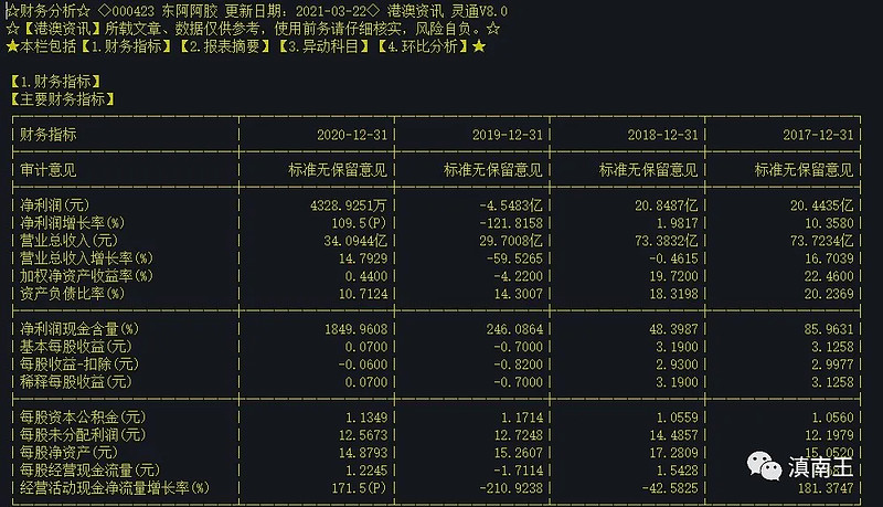 东阿阿胶(000423):每股净资产 14.97元,每股净利润 0.07元,历史净利润年均增长 -6.01%,预估未来三年净利润年均增长 233.4%,更多数据见:东阿阿胶000423核心经营数据 东阿阿胶的当前股价 34.82元,市盈率 526.07,未来三年的估值假设和预期收益率如下:15倍PE,预期收益率 -1185.59%;20倍PE,预期收益率 -1547.46%;25倍PE,预期收益率 -1909.32%;30倍PE,预期收益率 -2271.19%。 周末东阿阿胶出2020年年报,原计划是昨天写年报分析,但是东阿阿胶属于亏损后的扭亏,所以我看了最近三年的年报,今晚才写出,东阿阿胶2020年的年报主要有三大亮点! 第一大亮点是扭亏! 2019年东阿阿胶亏损,2020年扭亏,亏损的原因我认为有两个,一个是销售渠道改革,二是最近十几年提价太多,从2006年产品价格提高了四倍,导致销售滞涨,这点其实2017和2018年销售停滞在72亿就可以确认! 转型是痛苦的,但是也是为了涅槃重新,从2010年到2020年,东阿阿胶平均每年净利润12.2亿,也就是说,最近十年阿胶还是非常优秀的企业,最高做到20多亿净利润,所以2020年扭亏,2021和2022年净利润应该能回到10亿这个水平,甚至更多! 评价一个企业,最少三五年,如果看一个企业商业模式,十年是最好的!只要能保持十年都挣钱的商业模式,十有八九是好企业,这是我研究企业的感悟! 第二大亮点是推出两大新产品! 不管任何企业任何产品,其实都有局限性,所以新产品的更新就比较重要,阿胶20年推出两款新产品,我觉得很有潜力! 一款产品是阿胶即食燕窝,燕窝和阿胶都是滋补品,能消费阿胶的群体自然也会认可阿胶燕窝,阿胶的燕窝性价比应该还是不错的,所以我觉得这产品有潜力! 另外一款有潜力的是阿胶粉,阿胶粉我觉得突破更大,直接把阿胶带入日常生活,可以当咖啡喝,泡一杯阿胶粉喝,成本不如一杯星巴克咖啡,未来潜力还是很大的! 阿胶2020年天猫销售4.7亿,2019年才2亿多,销售额翻倍!网购其实是最能体现消费者认可度的!这也是年报的一大亮点! 第三、性价比非常高的滋补品牌! 阿胶每年资产负债都不超20%,2020年资产负债才2020年,这也是我看好的原因,轻资产运行的品牌企业,即使最近这两年转型,依然坚持分红,这种企业,说明根本不差钱,价值回归只是时间长短的事! 上图是最近10年阿胶的市盈率图,最近几年一直价值回归,这个过程其实就是蓄势转型的过程! 200多亿买一个全国性知名的滋补品牌,且背景是华润,而且毛利超70%的消费品,性价比非常高! 月线上,真正的大压力在60线45元附近,大支撑在250线25元,从基本面目前看,以后下30元的可能性都比较小!后面重点看什么时候突破40-45元一带! 周线上,20年从25见底后翻倍,然后调整,调整到35元就开始震荡,其实这技术和2019年构成一个头肩底,20年扭亏,所以企稳的迹象也非常大! 日线上,目前处于一个三角形收敛形态,2月份三个涨停,这是资金进场的信号,今天高开放量,这是需要要选方向的节奏! 好的投资机会,都是跌出来的,好好珍惜40元下的东阿阿胶,阿胶的任何产品,单品价格基本都在50元以上,所以这不是一般的消费品,属于奢侈消费!在食品行业中,阿胶就是茅台五粮液的定位!懂的自然懂,不懂的慢慢参悟! $东阿阿胶(SZ000423)$ $白云山(SH600332)$ $云南白药(SZ000538)$ @今日话题 #2021雪球投资炼金季# 作者:滇南王原文链接:https://xueqiu.com/2496980475/175590481 转载请注明:www.51xianjinliu.com » 东阿阿胶2020年报的三大亮点 喜欢 (0)or分享 (0)