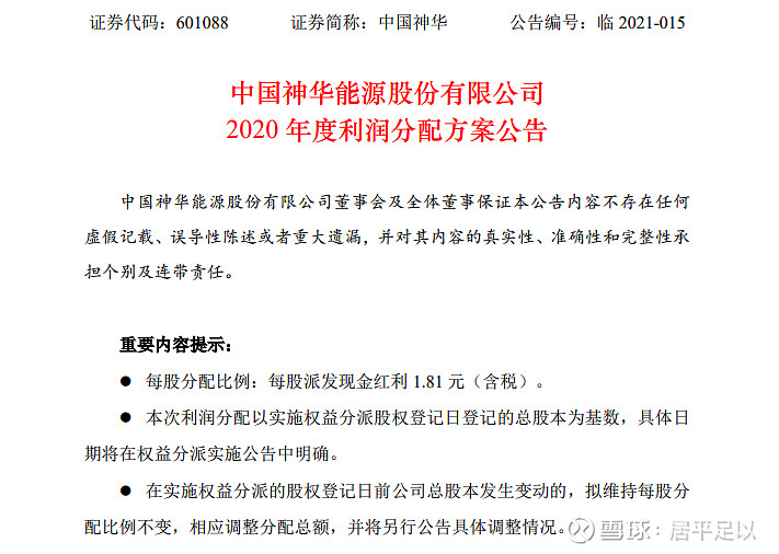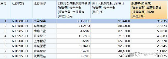 中国神华(601088):每股净资产 18.73元,每股净利润 1.97元,历史净利润年均增长 6.75%,预估未来三年净利润年均增长 6.06%,更多数据见:中国神华601088核心经营数据 中国神华的当前股价 19.55元,市盈率 9.92,未来三年的估值假设和预期收益率如下:15倍PE,预期收益率 99.0%;20倍PE,预期收益率 165.34%;25倍PE,预期收益率 231.67%;30倍PE,预期收益率 298.01%。 近年来,煤炭上市公司的分红积极性大增,出口阔绰。 在碳中和的背景下,煤炭行业逐步进入存量竞争状态,业绩稳定性与现金奶牛属性也日趋凸显,而煤企背后大比例持股的国有股东从中受益颇丰。 股息率近10% 作为行业龙头,中国神华虽然2020年营收、净利润双降,但是分红力度并未削弱。年报显示,去年中国神华实现营业收入2332.63亿元,同比下滑3.6%;归母净利润391.7亿元,同比下滑9.4%;基本每股收益1.97元。 分红方案显示,公司拟派发期股息现金1.81元/股(含税),对应派发股息近360亿元,也就是约九成净利润用来分红。相比,去年股息实际分红比例约60%。 记者注意到,经股东周年大会批准,中国神华股东大会已经同意了提高分红比例,规定2019至2021年三年现金分红比例至不低于当年归属于公司股东净利润的50%;自上市以来,中国神华已累计向股东现金分红(含2020年度末期股息)3009.98亿元,已经超过上市公司最新的流通总市值。 按照最新收盘价计算,中国神华的股息率高达9.98%,远超主流货币基金收益率。 中国神华指出,受疫情影响,全球工业生产活动有所放缓,能源需求有所减少。在减碳等环保协议等因素影响下,化石能源持续遇冷,煤炭在一次能源中的占比继续下降。报告期内,集团煤炭销售量4.46亿吨,商品煤产量2.92亿吨,节能降耗成效显著,单位产品综合能耗、水耗均降到历史最低水平。 展望2021年,中国神华预计全球煤炭市场供应整体偏宽松,局部时段、部分地区可能因需求波动出现短期供应偏紧。 逆势高比例分红 除了中国神华外,兖州煤业也出手阔绰。年报显示,去年归属于上市公司股东的净利润约为71.22亿元,同比下降28.2%;基本每股收益盈利降至1.46元。但是,兖州煤业还是拟推每10股派息10元;对应占当期归母净利润比例到达77%(归母净利润按照国际财务报告准则),按照最新收盘价计算,公司最细股息率达到7.59%。 此前,公司还在2019年中期派现54亿元,分红比例更是高达92%。 淮北矿业、开滦股份去年净利润也出现小幅下降,但公司都提出了分红计划,按最新收盘价计算,对应股息率分别为5.7%和4.27%。 记者注意到,从财务能力来看,中国神华的资产负债率近24%,在当前已披露年报的煤企中最低;而兖州煤业的资产负债率已将近70%,但是公司还是推出了分红方案。 行业分析师指出,当前上市煤企股权相对集中于国有资本,而行业潜在产能充足、未来资本开支逐年降低,具有高分红的动力和能力。另外,有业内人士认为,通过大分红力度、释放积极信号,有利于维持市场持信心,为今后再融资等奠定基础。 今年以来,多家煤企股价持续上扬。Wind显示,陕西黑猫涨幅超过60%中煤能源、兖州能源等涨幅超过30%,开滦股份、陕西煤业等涨幅也超过10%。 大股东收大红包 从股权结构来看,股息率较高的上市公司,大股东持股比例也相对较高。以中国神华为例,去年年末大股东国家能源投资集团期末持股比例就高达69%,按照持股数量计算,对应可获分红金额约250亿元;兖州煤业的大股东兖矿集团将获近23亿元分红。 机构观点认为,煤炭行业十四五格局向好,大型企业长期受益碳中和。虽然市场预期“碳中和”大方向下煤炭消费将下降,但短期五年内消费仍将是上升状态,需求端无需担忧,供需平衡状态下煤价仍将维持合理水平。“十四五”末全国煤矿数量控制在4000处左右, 2020年煤炭开采和洗选固定资产投资同比下降0.7%,增速较2019年的29.6%增长大幅下滑,行业资本开支进入下行周期,市场格局持续向好,优质产能将具备更大优势。 长期来看,由于非化石能源加速替代,煤炭消费或逐步下滑,对煤价形成打压,龙头煤企凭借低成本优势将更能对冲煤价下行所带来的影响,从而保障盈利能力的稳定性和持续性。 $中国神华(SH601088)$ #中国神华年报拟分红360亿# #万物皆可ETF# #传有对冲基金爆仓多只中概股闪崩# 作者:居平足以原文链接:https://xueqiu.com/7043712948/175607218 转载请注明:www.51xianjinliu.com » 从强有力的逻辑看中国神华的长期投资机遇 喜欢 (0)or分享 (0)