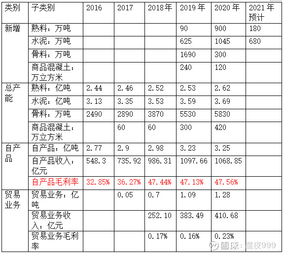 海螺水泥(600585):每股净资产 31.61元,每股净利润 6.63元,历史净利润年均增长 34.61%,预估未来三年净利润年均增长 3.39%,更多数据见:海螺水泥600585核心经营数据 海螺水泥的当前股价 50.05元,市盈率 7.55,未来三年的估值假设和预期收益率如下:15倍PE,预期收益率 110.0%;20倍PE,预期收益率 179.99%;25倍PE,预期收益率 249.99%;30倍PE,预期收益率 319.99%。 一、企业介绍 1、行业介绍 本集团的主营业务为水泥、商品熟料及骨料的生产、销售。根据市场需求,本集团的水泥品种主要包括 32.5 级水泥、42.5 级水泥及 52.5 级水泥,产品广泛应用于铁路、公路、机场、水利工程等国家大型基础设施建设项目,以及城市房地产开发、水泥制品和农村市场等。 2、控股股东: 安徽省投资集团系安徽省国有资产监督管理委员会(“安徽省国资委”)所属的国有独资有限责任公司,安徽省国资委为本公司实际控制人。截至 2020 年 12 月 31 日,海螺集团、安徽省投资集团以及安徽省国资委之间的股权关系结构图如下: 二、主营业务分析 1、建材业务 (1)、盈利能力分析 2020年公司主营业务中的建材(水泥、商品熟料及骨料),平均毛利率47.56%,同比毛利率上升0.42%,而贸易建材毛利率很低。 (2)、新增产能和总产能 (3)、毛利率变化原因分析 分析2016年~2020年书水泥熟料综合对比,得出毛利率变化的原因是燃料及动力的变化,因为售价上涨有限,所以毛利率受动力煤价格影响较大。 三、财务报表分析 1、2020年资产负债表分析:货币资金621.8亿;交易性金融资产269亿,交易性金融资产都是短期银行理财,现金流充裕;应收票据以银行承兑汇票为主,应收账款很少; 2、2020年利润表分析:归母净利润相比2019年增加了15.3亿,最大的贡献就来自于资产减值损失的变化,2019年对一些建筑厂房和机器设备计提了11.6亿的资产减值损失。 四、预测营收 根据2021年公司展望,2021 年,本集团计划全年水泥和熟料净销量(不含贸易量)3.25 亿吨,同比基本持平,预计吨产品成本小幅上涨,吨产品费用基本稳定。预测水泥熟料实现营收与2020年持平,即961.25亿; 国外销售部分,受海外疫情影响,出口销量同比下降51.14%,销售金额同比下降44.06%。随着海外项目相继建成投产,以及销售市场网络的不断完善,海外项目公司销量同比增长17.97%, 销售金额同比增长12.80%。 骨料及石子2020年实现营收10.25亿,假设2020新增产能全部实现销售,则2021年营收为10.25*5830/5530=10.8亿,增加营收0.55亿;骨料毛利率68.34%; 商品混凝土业务2020年实现营收2.1亿,假设2020新增产能全部实现销售,则2021年营收为2.1*420/300=2.94,增加营收0.84亿;商品混凝土毛利率22.14%; 贸易业务经过2018和2019年的高速增长,2020已大幅放缓,2021年按照7%增长率计算,实现营收为410.68*1.07=439.42,增加营收29.42;但是贸易业务因为毛利率太低,对净利润的贡献极其有限。 综述,预测2021年营收1762.43+0.55+0.84+29.42=1793.24,增长1.75%。 五、风险 2021 年,本集团可能面临的风险因素主要有以下四个方面: 1、公司所处水泥行业对建筑行业依赖性较强,与房地产投资增速关联度较高; 2、国家将加强污染防治和生态建设; 3、煤炭和电力成本在熟料生产成本中占比较高,一旦煤炭价格由于政策变动或市场供需关系等因素出现大幅上涨,将会带动本集团生产成本上升,倘若由此造成的成本上涨无法完全传导至产品价格,则会对公司盈利产生一定影响。 4、若海外疫情长期未能得到有效防控,可能导致公司国际化发展战略推进缓慢。 六、未来盈利空间分析 根据相关行业经验,平均每消耗1吨水泥约匹配6吨骨料,骨料在混凝土中所占的比例超过70%,可见砂石骨料市场远大于水泥。根据统计,2017年我国水泥产量23.2亿吨,砂石骨料产量约为184亿吨,对比欧美发达国家,欧洲年产水泥3.5亿吨左右,而骨料产量为27亿吨左右,美国年产水泥8000万至1亿吨,而年产骨料22亿吨,可以看出我国市场与欧美类似,骨料市场容量均超过水泥8倍以上。如果按照现在骨料80元/吨,水泥400元/吨的价格计算,骨料市场空间将是水泥2倍左右。 骨料是海螺未来的一个增长点,并且骨料毛利率高达68%,但是19和20年骨料新增产能有限,希望未来海螺能大幅度提高骨料业务。 $海螺水泥(SH600585)$ $海螺水泥(00914)$ 以上仅系个人观点,不构成投资建议。入市有风险,投资需谨慎。 作者:星夜999原文链接:https://xueqiu.com/1611135101/175614701 转载请注明:www.51xianjinliu.com » 从零分析公司海螺水泥 喜欢 (0)or分享 (0)