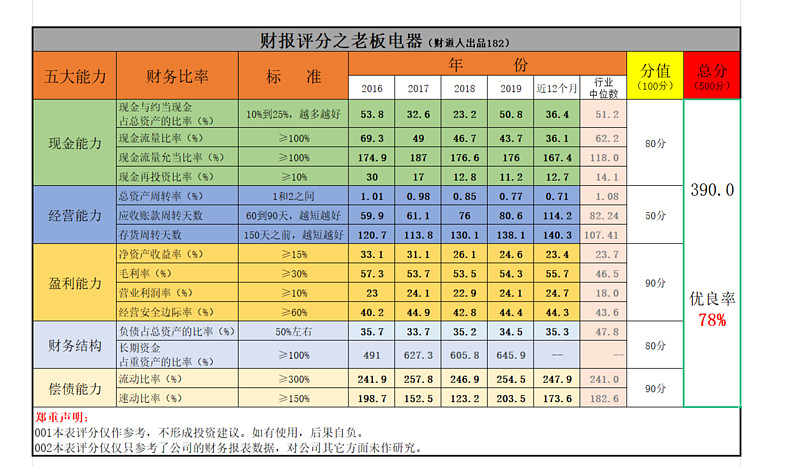 老板电器(002508):每股净资产 8.86元,每股净利润 1.75元,历史净利润年均增长 29.06%,预估未来三年净利润年均增长 13.63%,更多数据见:老板电器002508核心经营数据 老板电器的当前股价 35.92元,市盈率 20.37,未来三年的估值假设和预期收益率如下:15倍PE,预期收益率 2.93%;20倍PE,预期收益率 37.24%;25倍PE,预期收益率 71.55%;30倍PE,预期收益率 105.86%。 去年疫情,原以为对外贸出口的影响最大,谁知道到了后期,外贸业务呈现爆发式增长。就拿货运港口来说,集装箱不仅价格一天一个样地飞速增长,而且还供不应求。在这波出口浪潮中,主力军是小家电。这不,尽管去年很艰难,但据老板电器在3月23号披露的公告显示,依然保持了近6%的利润增长。 要知道,在过去的2020年,能保证不亏就相当不错了,有赚那就更加优秀了。老板电器果然非同一般。不仅如此,在这次的“中国家电及电子消费博览会”上,老板电器还推出了好多新品,聚焦打造智能厨房。 不论是在疫情下的利润增长,还是不断推陈出新的产品,老板电器的实力究竟怎么样呢?咱们从现金、经营、盈利、财务结构、偿债五大能力入手,剖析它的综合实力。每项是100分,总分500。 01现金能力:80分 莎士比亚说过这样一句话:“金钱是个好士兵,有了它可使人勇气百倍。”勇气百倍不百倍的不知道,但没钱确实只能喝西北风。企业的资本可用现金储备和现金流来衡量。 在现金储备方面,从2016年到2018年,老板电器不仅年年下滑,而且是从54%到23%,已经腰斩。好在不仅最低都有23%的水平,而且还在2019年止跌回升,又猛增到了51%。 虽然现金储备波动比较大,但好歹还足够用,现金流状况就不太好了。现金流量比率不仅最高水平只有69%,且在2017年还猛然从69%下滑到49%,此后几年也是微幅递减,很差劲儿。 现金再投资比率倒挺好。除了2017年高达187%之外,其它年份都稳定在175%左右,同样非常高。尽管现金再投资比率波动有点大,但最低都有11%,很不错。现金能力给80分。 02经营能力:50分 虽然金钱是个好士兵,但没有个好将军,再好的士兵都是炮灰。如果公司拥有一个——能把一分钱发挥出两分钱价值——的管理层,金钱才是个好士兵。 在总资产周转率方面,老板电器稍微有点差劲儿。不仅是因为它从2016年开始逐年递减,而且在2017年后就掉入了1次每年以下。这意味着,管理层的资金使用效率很慢,且越来越慢。 不仅管理层的资金使用效率不如人意,老板电器的收账能力也一般。它的应收账款周转天数年年递增不说,到了2019年甚至需要81天,已经比较靠近标准的上限,有点危险。 从2017年开始,它的存货周转天数就在加长。这暂且不说,关键是最短都有114天。这意味着最快都需要将近4个月才能卖一轮货,速度稍微有点慢。经营能力给50分。 03盈利能力:90分 公司最重要的能力就是赚钱。如果一直亏钱,连生存都难,更别提发展壮大了。在股东回报率方面,老板电器虽然逐年递减,且幅度不小,但即使到了最低时的2019年,那也高达25%,非常优秀的回报率水平。 不仅股东回报率很高,毛利率水平也非常高,最低都有54%。利润空间很大,最为关键的是还挺稳定。那它赚不赚得到钱呢?老板电器的营业利润率不仅最低都有23%,而且还一直稳定在这个水平,非常优秀。 虽然利润空间很大,赚钱能力也让人满意,但老板电器也并不是十全十美,它的抗风险能力就有点让人担忧。因为它的经营安全边际率最高只不过有45%,营业利润仅仅只有毛利润的5成不到。盈利能力给90分。 04财务结构:80分 基础不牢,地动山摇。想要谋发展,首先要把基础给打牢。建在豆腐渣地基上的高楼,风一吹就倒。企业最应该重视的地基是财务结构,即股东自有资金与外部债务之间的关系。 在负债水平上,老板电器不仅很稳定,而且还是在35%左右的水准。那么,股东出资就在65%左右。这说明,股东很看好公司的钱途,要不然也不会掏大钱经营公司。 股东看好,长期资金的来源就没啥问题了。这不,它的长期资金占重资产的比率不仅最低都高达491%,而且从2017年开始就在606%之上,非常高的水平。财务结构给80分。 05偿债能力:90分 尽管自身很优秀,但天有不测风云,还是得做好未雨绸缪的工作。企业需要做的未雨绸缪就是打造好自己的偿债能力,免得出现“急用钱却借不到钱”的尴尬境况。 在流动比率方面,老板电器最低时有242%,高时有258%。虽然小有波动,但流动资产起码都有短期债务的2.4倍以上,还算是可以。现金储备又非常充沛,就更优秀了。 尽管从2016年到2018年,它的速动比率逐年递减,且幅度很大,但最低时都有123%不说,到了2019年就止跌回升了,且高达204%,足够清偿债务。偿债能力给90分。 老板电器得分:390,优良率:78%。 写在最后 尽管老板电器的经营能力有点不尽如人意,但扛不住赚钱能力非常优秀。公司只要能赚钱,其它的都不是事儿。因为有钱,还能持续不断地赚钱,就能熬死竞争对手,而这就是一个“剩者为王”的时代。 投资路上风雨同行,从此不再孤单一人 @今日话题 #老板电器# $老板电器(SZ002508)$ 作者:正经的盗财人原文链接:https://xueqiu.com/5619832321/175671081 转载请注明:www.51xianjinliu.com » 小家电出口潮让去年不再难过老板电器的财报 喜欢 (0)or分享 (0)