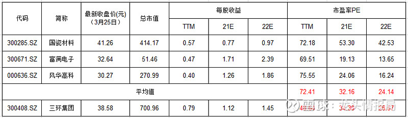 三环集团(300408):每股净资产 6.22元,每股净利润 0.82元,历史净利润年均增长 14.86%,预估未来三年净利润年均增长 36.87%,更多数据见:三环集团300408核心经营数据 三环集团的当前股价 41.91元,市盈率 52.84,未来三年的估值假设和预期收益率如下:15倍PE,预期收益率 -54.12%;20倍PE,预期收益率 -38.82%;25倍PE,预期收益率 -23.53%;30倍PE,预期收益率 -8.23%。 投资逻辑随着5G通信以及商业化的发展,国产替代大背景下,三环集团作为集多龙头于一身的头部企业,它既是中国电子陶瓷材料龙头,又是中国被动元件MLCC龙头,还是全球陶瓷插芯龙头,也是全球陶瓷基片龙头。 公司的多项产品迎来发展机遇期,叠加公司扩建的产能逐步达产,有望迎来新一波成长。 公司是国际领先的先进电子陶瓷企业。 三环集团成立于1970年,产品覆盖光通信、电子、 电工、机械、节能环保、新能源等众多应用领域,其中光纤连接器陶瓷插芯、氧化铝陶瓷基板、电阻器用陶瓷基体等产销量均居全球前列。 公司被评为国家高新技术企业、中国制造业单项冠军示范企业,连续多年名列中国电子元件百强前十名。公司将自己定位为“先进材料专家”,公司已经掌握了新型材料、电子浆料、功能玻璃、纳米粉体等关键基础材料的制备技术。 目前国内陶瓷粉料制备技术相对落后,主要依靠进口日本东曹、京瓷,公司是国内少数可实现自制的企业,掌握高端陶瓷粉体核心技术。公司已实现了从粉体、浆料、成品全产业链覆盖,最终体现为材料成本降低、制造良率提升、产品性能优异等竞争优势。 公司是被动元件(MLCC)龙头,有望再造新三环。 MLCC是世界上用量最大、发展最快的片式元件之一,其主要优点为体积小、频率范围宽、寿命长、成本低。 MLCC广泛用于各类电子产品,其中边际增长最快的是智能手机、汽车电子和可穿戴设备等。根据智多星顾问数据,2024年全球市场规模将达48000亿只、国内市场规模将达37700亿只。按照每万只约200元计算,2024年全球市场空间约1000亿元。根据中国产业信息网预计,2018-2021年前全球陶瓷电容器复合增速约5%,中国为约7%,主要系MLCC带动。 国内每年需要进口近50%MLCC满足下游需求。全球供应市场为日本、韩国、中国台湾寡头垄断,前五大厂商占据全球近80%份额。因此进口替代空间巨大。 2018-2019年为行业去库存周期,2020Q1-Q3年进入复苏周期,公司电子元件材料业务同比快速增长。 公司2001年引进MLCC产线,目前已实现多规格MLCC量产,产品覆盖 0402到2225所有型号及多种具有温度特性的产品。 2018-2020年底,三环集团MLCC产能分别为20/40/100亿只/月。根据扩产计划,公司2021和2022年底产能有望达到200和300亿只/月。 2020年公司进行5G通信用高品质多层片式陶瓷电容器扩产技术改造项目,预计完成后 MLCC新增年产能2,400亿只,本项目有助于实现高端产品的规模化生产并应用于 5G等领域,未来基站、手机、车规将是三环MLCC主要发展方向。 公司的插芯/基片/基座等业务全面向好。 2018年中国陶瓷插芯市场规模达到27亿元,同比增长35%。陶瓷插芯数量多、尺寸小、单价低,属于典型的利基产品,头部企业易形成高护城河。公司通过对光纤陶瓷插芯与套筒大幅降价,以提升市场份额,国内市场份额由13年前的40%飙升至目前的60%以上,是行业内绝对的寡头企业。该产品的毛利率保持在50%以上。目前价格稳定,5G来临带来增长机会。海外需求全面向好,2020年海外收入占比已至15-20%。 陶瓷基片是片式电阻的重要原材料之一,公司通过研发和自制,完成了片式电阻用氧化铝陶瓷基片的生产,目前公司在陶瓷基片市场占有率超过50%,位居全球前列。受中美摩擦影响,电阻的国产化进程显著,国产化背景下公司陶瓷基片业务有望迎来发展机遇。 公司是国内首家实现陶瓷封装基座(PKG)批量化生产的公司,目前在晶振PKG基座领域全球市占30%左右。在下游带动下PKG行业稳定增长。公司2017-2018年在半导体零部件的收入仅占京瓷的5%左右,但毛利率接近40%,半导体陶瓷板块整体盈利能力潜力巨大。 2021年,公司PKG产能将扩产10-20%至10亿只/月。 公司的其它新产品包括浆料、劈刀、氮化铝基板等加快导入,2021年有望加速成长。 公司形成了高技术人才构筑的行业壁垒。 公司具有50多年电子陶瓷领域技术积累,拥有一支技术研发能力强的研究开发团队。2018年,公司新聘任了近300名工程师,招入300多名重点大学本科及以上学历的优秀毕业生,其中硕士和博士学历占比50%以上。 公司自2014 年上市以来两次实施股权激励计划帮助公司创新。2020Q1-Q3公司研发费用达到1.66 亿元,同比增长29.08%,研发费用率为 6.06%。 公司历史经营靓丽,业绩拐点显现。 公司自2013年开始,公司营收实现正向增长。 2018年下半年以来,受中美贸易摩擦、4G-5G换代下游厂商控制库存,5G基站建设高峰未到等因素影响,公司所处行业景气度下行。2019年公司营收/净利同比下滑 27.30%/33.93%,但毛利率/净利率仍维持49.06%/32.06%,与历史数据基本持平,凸显公司在行业景气下行时仍有强议价能力。 图1 三环集团营业收入增长情况 2020年公司的营业收入39.94亿元,同比增长46.30%,营业利润14.41亿元,同比增长65.46%,重返高速增长。 图2 三环集团归属净利润增长情况 图3 三环集团成长能力单季度指标 公司3月25日预告了2021年度第一季度业绩情况,公司的归属利润同比增长130%-180%。 从单季度的成长能力指标可以