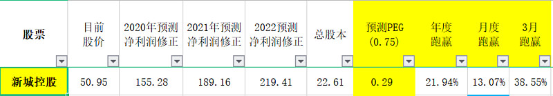 新城控股(601155):每股净资产 22.61元,每股净利润 6.79元,历史净利润年均增长 41.16%,预估未来三年净利润年均增长 17.34%,更多数据见:新城控股601155核心经营数据 新城控股的当前股价 46.65元,市盈率 6.91,未来三年的估值假设和预期收益率如下:15倍PE,预期收益率 191.95%;20倍PE,预期收益率 289.27%;25倍PE,预期收益率 386.59%;30倍PE,预期收益率 483.91%。 重要提示:本号主要记录老杜实盘和自选股表现,所涉股票不作推荐,据此操作风险自负。 在上一篇谈到新城控股的文章里 《新城控股:年报后成为“三栖”明星》,老杜曾详细演示过,如果按照股息率模式去投资,过去一年可以赚到53.59%的利润。 新城为什么能涨?因为有诸多必涨的理由。一是按股息率模式来看,其股息率达到4..45%(按3月29日价格计算);二是按高ROE模式来看,其五年预期远超100%;三是按祖鲁模式来看,其PEG和相对强度都符合要求。 这些都在上一篇文章中提到了,今天想补充一些没有提过的问题。 (一)新城控股的分红非常稳定 这个“稳定”主要是针对其分红率来说的。请看下图。新城上市以来,年分红率基本都在30%的水平,而分红总额是逐年递增的,这说明公司的净利润也是逐年增长的。 从下图可以看到:2014年到2020年,公司净利润一直保持高速增长,总额从2014年的11.67亿元,增加到2020年的152.56亿元,增长12倍有余;而股价从历史最低价4.35元(前复权)涨到46.04元(3月29日),涨幅9.58倍。这些都是成长股的特征。 所以,有人问老杜,为什么新城控股能用祖鲁模式去评估?《祖鲁法则》一书中明确排除了房地产股票啊!其实老杜觉得,我们不必管它是什么股票,只要符合书中的成长年限(3+1增长),就可以适用祖鲁模式。当然,这是一家之言。 在3月份祖鲁清单中,新城控股的各项数值如下。当时的价格是50.95元,如果市价买入的话,到现在是微亏的。不过个人觉得后市还很乐观。 (二)技术面支撑。大家知道,老杜是不使用技术分析做决策的,所以说到技术可能很外行,姑且一试。 技术上一般看周线比较稳妥,也更清晰,并且适合中长线投资。从上图可以看到,1月22日的这根大阳线,突破了前期两个平台,而且前期的K线呈规则的收敛状,算是比较理想的图形。略微遗憾的是突破时量能不足。目前30周线稳步上行构成支撑,在设好止损的前提下,是可以操作的。(老杜自己的模式没有止损要求) 从流通股东的变化上也可以看出,市场人士对新城的后期走势有更多期待。本文不涉及经营层面的探讨,有关信息可参考年报和近期研报。不过,作为分散型投资者,有上述的认知已经够了。 $新城控股(SH601155)$ $上证指数(SH000001)$ $创业板指(SZ399006)$ @今日话题 @雪球达人秀 作者:祖鲁老杜原文链接:https://xueqiu.com/5956645909/175825223 转载请注明:www.51xianjinliu.com » 新城控股可能还有大涨 喜欢 (0)or分享 (0)