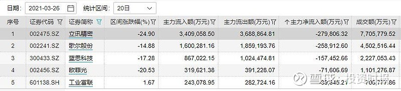 立讯精密(002475):每股净资产 4.11元,每股净利润 1.03元,历史净利润年均增长 51.68%,预估未来三年净利润年均增长 29.04%,更多数据见:立讯精密002475核心经营数据 立讯精密的当前股价 37.39元,市盈率 36.41,未来三年的估值假设和预期收益率如下:15倍PE,预期收益率 -41.65%;20倍PE,预期收益率 -22.2%;25倍PE,预期收益率 -2.75%;30倍PE,预期收益率 16.7%。 今年以来,立讯精密股价已累计下跌37.78%,跌幅不仅超过同期苹果指数、歌尔股份和蓝思科技,甚至还略大于最近处风波中的欧菲光 《投资时报》研究员 卓玛 绵延两个半月的股价跌势终于有了止跌迹象? 2021年3月25日和3月26日,立讯精密工业股份有限公司(下称立讯精密,002475.SZ)连续两个交易日收涨,其中3月26日上涨6.17%,报收于34.92元/股。 不过这一价位仍较该公司在去年10月13日盘中触达的的52周高点,同时也是历史最高点63.88元/股缩水超45%。3月29日开盘,该股继续下跌,终收于33.75元/股,日跌幅3.35%。 自今年一月中旬以来,立讯精密股价持续下跌,截至3月26日已累计下跌37.78%。这一跌幅不仅超过同期苹果指数(884116.WI),也较大幅度超过歌尔股份(002241.SZ)、蓝思科技(300433.SZ)等同业上市公司,甚至还略微大于近期处于风波中的欧菲光(002456.SZ)。 尽管其于近期发布了2020年度业绩快报和2021年一季度业绩预告。数据显示,其2020年营收和利润均实现同比较大幅度的增长。但在财报发布次日,立讯精密股价仍小幅下挫2.69%,当日报收于34.35元/股,业绩并未能提振公司股价。 针对前述情况,《投资时报》研究员电邮沟通提纲至立讯精密相关部门,但截至发稿尚未收到回复。 立讯精密上市以来股价走势(元) 数据来源:Wind 业绩亮眼难挽股价颓势 近日,立讯精密发布了2020年度业绩快报和2021年一季度业绩预告。数据显示,其2020年全年实现营业总收入918.70亿元,较上年同期增长46.95%;实现归母净利润72.33亿元,同比增长53.44%。 对于如此业绩表现,立讯精密表示面对错综复杂的外部环境,公司上下高效执行管理层前期制定的发展规划和目标,审慎、灵活应对外部环境变化,各项业务快速发展。 但在财报发布次日,立讯精密股价仍小幅下挫2.69%,当日报收于34.35元/股。 《投资时报》研究员注意到,尽管2020年立讯精密归母净利润仍实现高增长,但相较此前增速已显著下滑。2018年和2019年,立讯精密归母净利润分别实现61.05%和73.13%的同比增长。 公开资料显示,立讯精密成立于2004年,于2010年9月登陆资本市场上市,该公司主营连接线、连接器的研发、生产和销售,产品主要应用于3C(电脑、通讯、消费电子)、汽车和通讯等领域。 从股价表现上来看,上市以来相当长时间内,立讯精密的股价都表现平平,但自2019年起却迅速走高,一路从最低7.55元/股涨至2020年10月13日盘中的63.88元/股,触达历史最高点,股价也在不足两年内上涨超7倍。 立讯精密股价的大幅上涨主要受益于苹果推出的AirPods无线耳机,但该产品对其业绩贡献正在减弱。日前,知名苹果分析师天风证券的郭明錤发布研报预测称,2021年AirPods出货量将同比下滑,下调2021年AirPods出货预测30%—35%至7500万部—8000万部。 年内跌幅近40% 不过相比于某一个产品,今年以来屡屡传出的“苹果供应链或转移”和“苹果砍单”等传闻,对立讯精密等苹果产业链公司影响更大。 今年年初,有消息称欧菲光位于广州的手机摄像头模组工厂广州得尔塔将被出售给立讯精密。作为国内知名的显示光学镜头模组厂商和苹果产业链公司,市场由此猜测欧菲光或被“剔除”苹果供应链。 随后,立讯精密即对外回应称“情况不属实”,欧菲光亦否认了相关说法。 不过,欧菲光承认目前确实拟筹划出售相关子公司的全部或部分资产,出售范围不超过广州得尔塔、江西慧光微电子、南昌欧菲显示和江西晶润光学。2019年年报显示,上述四家公司的总资产(113.39亿元)约占欧菲光当期总资产(405.60亿元)的27.96%,营业收入(113.62亿元)约占欧菲光当期总营收(519.74亿元)的21.86%。 值得关注的是,就在3月16日晚间,欧菲光突然宣布境外特定客户计划终止与公司及其子公司的采购关系,后续其将不再从该客户取得现有业务订单。 虽然欧菲光并未透露该“境外特定客户”的名称,但市场普遍认为该“境外特定客户”就是苹果。发布这一消息的当晚,深交所亦火速对欧菲光下发关注函。 3月19日晚间,欧菲光回复深交所关注函称,公司预计特定客户相关的订单出货将持续到3月31日,客户计划于今年第二季度(具体时间尚未完全确定)终止与公司的采购关系,后续将签署终止合作协议。受此影响,欧菲光预计2020年度净利润可能为负。此外,其表示公司有境外业务的参股公司亦可能存在类似情况,导致公司承担相应投资损失。 受前述诸多不利消息影响,自今年1月14日起,立讯精密股价结束上涨态势,并显示出持续下跌走势,年内累计跌幅已达37.78%。而若与其在去年10月13日盘中触达的52周高点,同时也是历史最高点63.88元/股相比,则不到半年的时间内股价即缩水超45%。 不止是立讯精密,今年以来截至3月26日,同为果链企业的歌尔股份股价已累计下跌27.01%,较其于去年11月9日盘中触达的历史高点50.23元/股缩水45.77%;蓝思科技年内已累计下跌15.55%,较其在今年1月18日触达的历史高点41.40元/股缩水37.56%。 至于近期身处砍单风波中的欧菲光,截至3月26日年内股价也已累计下跌35.96%。苹果指数今年以来则累
