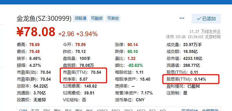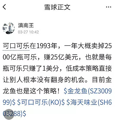 海天味业(603288):每股净资产 6.8元,每股净利润 1.98元,历史净利润年均增长 22.18%,预估未来三年净利润年均增长 17.51%,更多数据见:海天味业603288核心经营数据 海天味业的当前股价 170.8元,市盈率 86.44,未来三年的估值假设和预期收益率如下:15倍PE,预期收益率 -76.49%;20倍PE,预期收益率 -68.65%;25倍PE,预期收益率 -60.81%;30倍PE,预期收益率 -52.97%。 01valuefirm 财务报表分析 一般看财务报表,我会先从资产负债表入手;特别在意外部融资的情况; 首先我会看一家公司在经营层面是否可以不用银行外部融资,仅靠自身的商业信用来提供公司资金运作; 以下是两家公司资产负债表中,体现对外部融资的依存度情况的报表科目 一个是金龙鱼的财务报表货币资金和短期借款,长期借款,长期债券(无) 从上图可以看出公司的,金龙鱼短期负债,长期借款比例高于货币资金。 可以反映两大含义: 第一:公司在资金筹划方面,利用效率方面很低效; 第二:公司在商业信用方面很脆弱,没有很好的上下游产业链优势,不能够压缩付款的周期,减少回款的周期; 我们看下海天味业,资金利用情况: 货币资金远远大于短期借款和长期借款;企业完全可以利用商业信用来运作企业的日常经营; 反映两大含义: 第一:说明公司管理能力优秀 第二:公司在产业链上具有竞争优势,在产业链上有话语权,能够充分利用商业信用,不依靠外部融资环境; 刚刚提到的第二种商业信用能力,产业链的能力,我们可以从下图反应: 海天味业,反应的上下游产业链的优势; 金龙鱼反应的产业链情况 我们可以看到,两家公司都是针对to B端,但是海天味业的应收账款几乎为0;反映的是产品比较畅销,需要供应商拿现款现销;产品的市场销售比较好,才有这种强势地位; 而金龙鱼,其应收账款却存在大量赊销;反映油品在消费者市场并不是金龙鱼一家独大,而是有竞争对手互相竞争,产品竞争优势没有海天味业强大,存在赊销,尽量求着供应商赶紧将产品卖出去; 投资最忌讳竞争和存货挤压资金的情况; 从存货占比情况,我们都可以看出这种情况; 海天味业的存货,结构比只有5%左右; 金龙鱼的存货占总资产的情况 金龙鱼存货挤占公司资金情况太明显;存货管理混乱,不能做到现产现销;而且还挤占资金,说明库存管理能力较差; 经过这么多年对财务报表的思考,一家企业能不能够提高存货周转率至关重要; 因为企业的固定成本几乎不变,如机器设备,人员工资;但是如果在同样的时间下,产品的周转率提升,可以做到将固定成本摊薄到很多量的产品上,如果不能提高产品周转率,只摊销到少量产品上的成本是有天壤之别的;这样就无法在产品成本端上形成竞争优势; 随着时间的积累,时间是会奖励那些管理能力优秀,产品周转率高,能够利用成本竞争优势抢占市场份额的公司;而不是那些虽然外表鲜艳而管理低效的公司; 雪球的大V,一句评论,我真的不知道这个逻辑在哪里 低成本策略,则应该是薄利多销,我们可以看出,金龙鱼的存货并没有海天味业周转快;而且存货管理效率底下,占用大量资金; 02valuefirm 商业模式 产品端: 海天味业 公司的主营业务未发生变化,依然坚持主业,坚持调味品的生产和销售,并在调 味品行业内实施相关多元化,产品涵盖酱油、蚝油、酱、醋、鸡精、味精、料酒等调味品。多年来公司调味品的产销量及收入连续多年名列行业第一,其中酱油、调味酱和蚝油是目前公司最主要的产品。 金龙鱼 从产品端:金龙鱼多元化,导致存货管理混乱;而海天味业专注酱油、调味酱和蚝油;在消费者市场非常畅销,不存在库存压力; 销售模式: 海天味业 金龙鱼 销售模式其实是由产品的核心竞争力决定,当一家企业聚焦主业,在产品竞争优势明显的情况下,销售端也会更加强势,先款后货的海天味业就是产品力和企业管理能力的体现; 商业模式都差不多;产品端-销售经销商–消费者;由于是日常用品,消费频次较高,随着消费升级,对品牌的忠诚度会提升; 03valuefirm 行业空间及市占率(CDR) 调味品 调味品目前市场份额在3000亿;而龙头企业营业收入200亿; 市场占有率是200/3000=6%;以上只是本人粗略估算,具体单品市场占有率还的看更多研究报告 04valuefirm 估值 海天味业,高达80倍估值,这样的估值区间,风险极大,所以仍然需要耐心等待;有时候持有现金也是不错的选择; 股息率低的只有0.14%;市盈率高达70pe,市净率5倍,这个就是资本市场的选择;普通公司虽然看似便宜,但是管理层不优秀,产业链没有海天味业强势; 所以市场定价有时候又是合理的,优秀的公司不可能以便宜的价格买到,只能以合理的价格买到伟大的公司,希望有一天海天味业下跌到一定的区间,我也会上车的; 了解更多好的公司需要花费大量时间,争取能够做到每周一更。 最后还是以自己偶像的语句结尾 学习与不学习的人,在每天看来没有任何区别;在每月看来差异也是微乎其微;在每年看来差距虽然明显,但好像也没什么了不起的;但在每5年来看的时候,那就是观念的巨大分野。等到了10年再看的时候,也许就是一种人生对另一种人生不可企及的鸿沟。再忙,别忘给自己充点电! $金龙鱼(SZ300999)$ $海天味业(SH603288)$ #海天味业全年净利润同比增近两成# #股民的日常# $上证指数(SH000001)$ 作者:白马说财原文链接:https://xueqiu.com/8664472800/175881459 转载请注明:www.51xianjinliu.com » 解析海天味业VS金龙鱼谁最值得投资 喜欢 (0)or
