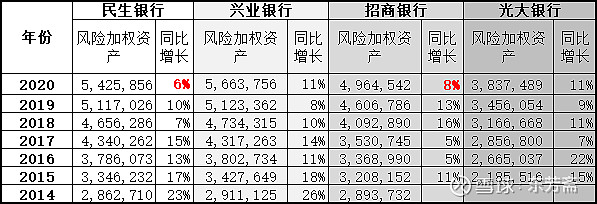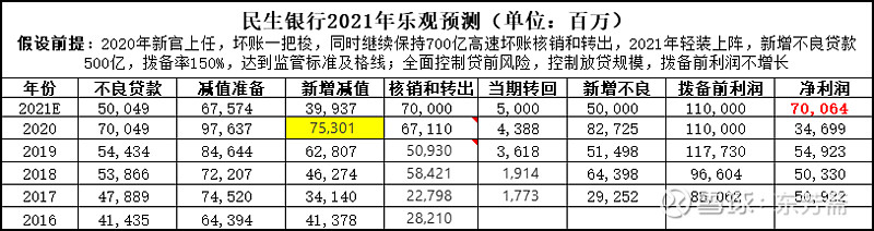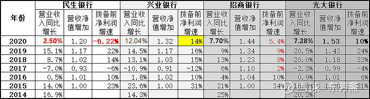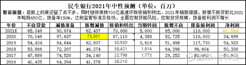 招商银行(600036):每股净资产 26.61元,每股净利润 3.79元,历史净利润年均增长 24.17%,预估未来三年净利润年均增长 13.17%,更多数据见:招商银行600036核心经营数据 招商银行的当前股价 53.3元,市盈率 13.81,未来三年的估值假设和预期收益率如下:15倍PE,预期收益率 47.66%;20倍PE,预期收益率 96.88%;25倍PE,预期收益率 146.1%;30倍PE,预期收益率 195.32%。 民生银行(600016):每股净资产 10.86元,每股净利润 0.71元,历史净利润年均增长 18.55%,预估未来三年净利润年均增长 0.0%,更多数据见:民生银行600016核心经营数据 民生银行的当前股价 4.86元,市盈率 6.2,未来三年的估值假设和预期收益率如下:15倍PE,预期收益率 276.54%;20倍PE,预期收益率 402.06%;25倍PE,预期收益率 527.57%;30倍PE,预期收益率 653.09%。 文字仅为自我思考输出之用,菜鸟阿东2019年底入市,时间不长见识还很浅薄,不喜勿喷,有高明见解敬请不吝赐教! 阿东目前持有民生银行仓位21%,融资买入,持仓成本5.164元,超过兴业银行成为目前银行组合中仓位最重的一只,也是全部组合单只最大仓位。 昨天民生银行发布了屎一般的业绩,股价今天应声下跌,吓得阿东这只菜鸟手足无措。杠杆+全仓,会不会死翘翘? 昨天有位好友还在转发董宝珍老师劝某大V全仓+杠杆买民生回头是岸的故事,今天我就又步后尘。贪婪乎?恐惧乎?爆仓乎? 看官且看今天阿东摆摆屎一般的民生银行我还敢不敢杠杆加仓的龙门阵。 业绩有多糟糕 2020年中国民生银行集团实现营业收入1,849.51亿元,同比增长2.50%。单拎出来这个业绩没什么感觉,但没有对比就没有伤害,看官且看下表的同行对比: 认真看看您会发现,民生银行在4个已公布年报的股份制银行中不仅今年排老末,从2015年到今天,它还是老末。2015年的1块钱营收,到2020年是1.2元,而光大银行是1.53元,这就是投资光大银行的中期基本逻辑,拨备前净利润增速最快,一旦坏账反转,业绩可能嗖嗖往上涨,大有赶超民生之势。当然,民生之差今年尤甚,拨备前净利润竟然负增长!这说明企业的业绩是真实在下降,而不是仅仅因为计提了大量的资产减值损失。 一个小插曲:看看招行的拨备前净利润增速,看官可以自己脑补一下,招行最近几年净利润13-16%的增速究竟从何而来?未来可不可持续?嘿嘿,看官请自己去思考,阿东慎言。 还能更糟糕吗 预测未来,都是妄想。但是证券分析师又不得不面对这个问题,阿东这只菜鸟也只能勉为其难,按照格老的指示,用最谨慎的态度来定性分析判断未来——不是预判能挣多少钱,而是预判未来还有什么风险,会不会输得连底裤都没得穿。 上表中,2017年除了招行,另外3家营收和拨备前净利润都是负增长,但第二年似乎就恢复了元气,看起来民生银行的局,今年似乎能破。 但,这只是可怜的线性外推猜想。线性外推是最烂的投资推理逻辑,慎用。 更糟糕的情况可能有三: 1、屎太多,擦不干净; 阿东做了悲观、中性、乐观三种假设。看到本文的看官,多半都是已经持有民生银行的球友。为避免被怼,还是先看乐观的吧,供君一乐: 乐观预测:屎不多,新一届董事长高董2020年一步到位,同时清理宿便力度不减,2021年保持150%的拨备率前提下,利润直接干到700亿,市值5000-7000亿。乐呵不? 下面我就说说谨慎的观点,不喜请绕行: 中性预测:屎不太多,大力清除宿便,拨备率提升到150%及格水平,不良贷款开始微降,净利润开始稳步回升(这像不像极前两天兴业银行和光大银行的龙门阵?只是民生银行更衰一点) 悲观预测: 屎太多,宿便不断堆积,再叠加便秘,好吧,请看官自己脑补这个不堪的场景。结果就是净利润进一步下滑。 看官,您更愿意相信哪一种?不过相信哪一种,都是您的人性决定的结果,跟阿东无关。 阿东只说最坏的结果对自己的打击是否能够承受: 如果不幸悲观预测显现,我预计民生银行的股价会跌倒0.4PB,也就是我的持仓成本下跌20%,跌到4.2元附近,1600亿市值,6PE(民生好像历史上还没有这么低的价格) 这个跌法,我不会爆仓,而且还有一成仓位可以继续加仓。我对单只股票的重仓限制是30%,达到30%后,再跌也不买了,让整个组合风险可控。 2、新上任领导不是来做业绩的,就是来擦屎的; 这可不是耸人听闻。有兴趣的球友可以看看新上任高董事长在中行的业绩是好?是坏?还是很稳? 在第一张业绩表中,我们可以看出,2020年,民生银行主要精力是在内部整顿,而不是做业绩。从下面这张风险加权资产增速表来看,也如此: 风险加权资产大概意思就是银行通过承担风险来赚取收益的资产,比如放贷,具体折算方式很复杂,这里不展开细说。招行比较低,那是因为它非利息收入占比很高,硬气。民生银行是传统的放贷行,这个增速只能说明公司在2020年主要工作就是严把贷款质量关,做好事前风控,宁可错过不可做错。 有了这样谨慎的投资思想,股民亏钱很难,银行坏账可控。 不过要小心,民生银行的风险加权资产占总资产比例已经达到了历史顶峰:78.1%(招行只有59.4%);民生银行的业务线条过于单一,对风险收益过度依赖,这也是它陷入如此大的麻烦原因之一,它以前的战略相当有问题,毫无远见,过度追求眼前利益。 风险源头看起来高董正在加紧控制,事前风控有点眉目,那已经在肠子里的宿便又控制得如何?会不会引起癌变?我们看看民生银行的事中风险控制措施,看官请见下面这样不良认定宽松度评定表: 好家伙,高董这是破釜沉舟的节奏,90天以上逾期+重