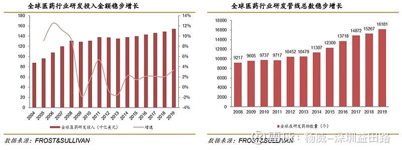 恒瑞医药(600276):每股净资产 6.04元,每股净利润 1.19元,历史净利润年均增长 27.67%,预估未来三年净利润年均增长 20.96%,更多数据见:恒瑞医药600276核心经营数据 恒瑞医药的当前股价 83.0元,市盈率 67.98,未来三年的估值假设和预期收益率如下:15倍PE,预期收益率 -68.02%;20倍PE,预期收益率 -57.35%;25倍PE,预期收益率 -46.69%;30倍PE,预期收益率 -36.03%。 中国医药(600056):每股净资产 9.56元,每股净利润 1.23元,历史净利润年均增长 21.28%,预估未来三年净利润年均增长 0.0%,更多数据见:中国医药600056核心经营数据 中国医药的当前股价 13.02元,市盈率 11.12,未来三年的估值假设和预期收益率如下:15倍PE,预期收益率 5.81%;20倍PE,预期收益率 41.08%;25倍PE,预期收益率 76.34%;30倍PE,预期收益率 111.61%。 一、二十年磨砺成就全球一体化服务龙头 (一)公司概况 药明康德成立于2000年12月,公司为全球药企提供全面、一体化的新药研发和生产服务。药明康德目前拥有全球4100多个客户,遍布于全球30多个国家,在中国、美国和德国等地区拥有29个研发生产基地/分支机构,拥有21900多名科学家和技术人员,总员工数截止到2020年底达26240名。药明康德经过多年的努力和全球布局,2018年在全球医药研发外包市场的综合排名中位列第九、中国第一。 (二)财务数据 受益于外包行业向中印转移及国内创新药行业的高速发展,药明康德2017-2019年营业收入由77.65亿元增长至128.72亿元,年复合增长率高达28.8%。公司2020年实现营收165.35亿元,同比增长28.46%;归母净利润29.60亿元,同比增长59.62%;扣非归母净利润23.85亿元,同比增长24.60%。 公司2020年-2022年营收三年复合增速有望接近30%,归母净利润三年复合增速有望突破30%。 药明康德的收入主要来自于海外客户贡献,2018年美国市场收入占比55%、欧洲占比15%、中国占比16%;2019年国外收入总占比为77%,中国占比升至23%。 公司坚持“长尾战略”,服务范围由大型药企和生物公司扩展至中小型,公司客户数量已达4100多家,占全球创新药企业数量的三分之一。2020年上半年,全球前20大药企占公司整体收入比重为31.9%,长尾客户收入占比为67.3%。 (三)新药研发流程与CXO角色 1、新药研发流程 医药界的双十定律:一款新药从研发到上市平均需要10年时间和10亿美元的投入。随着法规的严格,可用靶点的不断开发,当前新药研发难度加大,一款新药投入已近18亿美元。 一款新药从研发到上市流程: (1)研究开发,包括实验室研究2-3年(药物靶点和先导化合物筛选)和临床前研究2-4年(药理毒理学研究和制剂开发)。 (2)临床试验审批(IND) (3)临床试验(3-7年):临床I期、临床II期、临床III期。 (4)新药批准上市(NDA) (5)上市后研究:临床Ⅳ期 (6)上市后再审批 2、CRO及CDMO的角色 近十年,为了降低资金成本和研发失败的风险,海外大型药企将支出较大的中间环节交给更专业的外包研究组织机构,将精力集中在药物发现之前的疾病机理研究及专利保护和后端定价销售上面,这样不仅能加快新药研发进程还能分散流程风险。CRO(合同研究组织)和CDMO(合同研发生产组织)等CXO企业在这样的背景下应运而生。 CRO(药物发现和临床前):靶点发现、先导化合物;药代动力学、药理毒理学等。 CRO(临床试验):覆盖I至Ⅳ期临床试验技术、数据、统计、注册申请等全过程服务。 CDMO/CMO:主要负责药品的生产、生产工艺升级。CDMO在新药临床前到商业化生产阶段为药企提供定制研发生产服务。 (四)药明康德的业务板块 药明康德主营业务分为四大块:1、中国区实验室服务;2、CDMO/CMO服务;3、临床研究及其他CRO服务;4、美国区实验室服务。 中国区实验室服务主要为临床前CRO,包括小分子药物发现、药物分析及测试服务,2019年收入64.7亿,复合增速25.5%,占总营收比例为50%;CDMO/CMO服务主要为药企提供小分子药物工艺研发和生产服务,2019年收入37.5亿,复合增速32.8%,占总营收比例为29%;临床研究包括临床I期至III期的临床试验和注册申请等服务,2019年收入10.6亿,复合增速74%,占总营收比例为8%;美国区实验室服务主要提供细胞和基因疗法的研发生产服务和医疗器械检测服务,2019年收入15.6亿元,复合增速20%,占总营收比例为12%。 二、全球和中国医药外包市场规模 随着经济发展、人口老龄化、卫生健康需求增强等因素,全球药物研发投入不断增加,2019年全球研发投入达1540亿美元、全球再研新药数量达16181个,为全球CXO行业发展奠定基础。 全球CRO行业规模从2015年的443亿美元增长到2019年的626亿美元,复合增速近9%;中国CRO行业规模从2015年的26亿美元增长到2019年的69亿美元,复合增速达27.6%。中国CRO市场规模占全球市场规模比例从2015年的5.87%提升至2019年的11.02%,未来预计将进一步提升。 全球小分子CDMO/CMO市场规模由2015年480亿美元增长至2019年744亿美元,复合增速11.58%;国内小分子CDMO/CMO市场规模从2015年69亿美元增长至2019年132亿美元,复合增速17.61%。 我国的CXO服务成本远低于发达国家:人才供应充足、人力成本相对较低、临床病患较好招募,众多优势促使国外CXO行业不断向中国转移。 综述,药明康德作为中国CXO行业龙头,在客户资源、人才优势、全球化赋能平台等方面具备较高行业壁垒,有望保持中长期高速增长,进一步巩固和提高其全球龙头地位。 #价值投资# #股民的日常# #今天聊点啥# @雪球征文 @今日话题 @玩赚组合 @雪球达人秀 作者:杨威-深圳益田路原文链接:https://xue