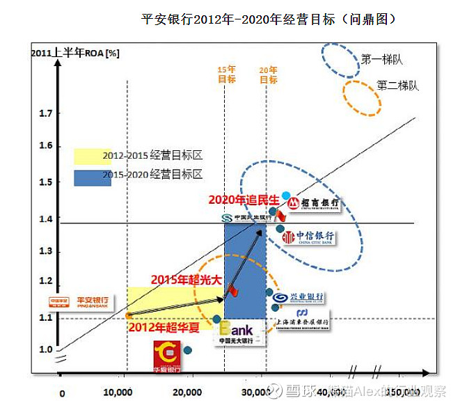 招商银行(600036):每股净资产 26.61元,每股净利润 3.79元,历史净利润年均增长 24.17%,预估未来三年净利润年均增长 13.17%,更多数据见:招商银行600036核心经营数据 招商银行的当前股价 53.3元,市盈率 13.81,未来三年的估值假设和预期收益率如下:15倍PE,预期收益率 47.66%;20倍PE,预期收益率 96.88%;25倍PE,预期收益率 146.1%;30倍PE,预期收益率 195.32%。 中国平安(601318):每股净资产 42.24元,每股净利润 8.1元,历史净利润年均增长 28.47%,预估未来三年净利润年均增长 14.48%,更多数据见:中国平安601318核心经营数据 中国平安的当前股价 74.26元,市盈率 9.41,未来三年的估值假设和预期收益率如下:15倍PE,预期收益率 154.87%;20倍PE,预期收益率 239.83%;25倍PE,预期收益率 324.79%;30倍PE,预期收益率 409.74%。 平安银行(000001):每股净资产 15.6元,每股净利润 1.4元,历史净利润年均增长 35.28%,预估未来三年净利润年均增长 15.69%,更多数据见:平安银行000001核心经营数据 平安银行的当前股价 23.29元,市盈率 14.81,未来三年的估值假设和预期收益率如下:15倍PE,预期收益率 53.58%;20倍PE,预期收益率 104.77%;25倍PE,预期收益率 155.96%;30倍PE,预期收益率 207.16%。 一、平安银行战略演变分析:目标始终如一,战略由混沌至清晰 2012年4月,原深圳发展银行与平安银行合并,合并后更名为平安银行,就在当年,马明哲提出三个阶段的战略规划:初始三至五年以对公业务为主,发展零售业务基础,并进入股份制银行第二梯队;之后五至八年,对公与零售业务并重,协调发展,并进入股份制银行第一梯队;八年后,成为一家以零售业务为主的银行。同时平安银行还提出了一张详细的问鼎图,明确了未来8年跻身股份行第一梯队的经营目标,这也是平安银行长期以来坚持如一的经营目标。 资料来源:互联网整理 2021年2月4日平安银行年报发布。资产规模接近4.5万亿,营收增幅11.3%,连续三年实现两位数增长,拨备前利润增幅12.0%,零售AUM超2.6万亿,增幅32.4%。从规模上看,平安银行虽然尚未实现问鼎图的赶超民生比肩招商的目标,但已稳居股份行第二阵营,从零售转型成果(与招行同为零售营收占比超过50%的股份行)和资本市场认可度的角度来看,已并不亚于股份行第一梯队成员。 在2020年年报中致辞中,平安银行董事长谢永林说:“回顾平安银行过去四年的挑战与成就,纷繁复杂表象下的商业逻辑以及经营思想已经逐步清晰,不忘初心、回归本质、顺势而为,才能始终“保持战略定力不折腾,厘清发展重点不盲乱,准确把握趋势立潮头”这也是平安银行多年来转型效果突出的重要原因。 因此,我们将平安银行2013年合并后的采取了主要战略方向整理如下: (一)2013-2015:“以对公业务为主,同时构建零售业务发展的基础” 2013年:明确了“对公、投行、零售、同业”的四轮驱动和组织变革。在当年,平安银行确立以小微金融业务为战略重心,做大战略和主流客户合作,同时启动事业部改革,公司端成立3个行业事业部,11个产品事业部和1个平台事业部,正式启动私人银行业务,着手搭建完善的总部组织架构。当年公司存款余额较年初增长19.69%,小微金融业务较年初增加312.94亿元,增幅56.05%,投行业务实现中收16.34亿元,比去年增加12.9亿元。 2014年,平安银行继续打造强大总行,塑造特色分行、特色事业部,支撑战略落地,事业部制延伸至零售条线,成立了零售大事业部,建立业务管理、资产负债管理与激励机制。当年零售存款余额较年初增长19%,零售贷款(含信用卡)余额较年初增长18%,管理个人客户资产快速增长,期末突破5000亿规模,较年初增长38%;财富客户累计22.7万,增长38%,零售中间业务净收入(含信用卡)同比增长44%。 2015年,平安银行开启智慧经营模式,秉承“专业化、集约化、综合金融、互联网金融”四大经营战略,公司端打造以“橙e网”等为代表的互联网门户平台,全面构建面向行业产业链和中小企业转型的服务生态体系;零售端:继续深化大事业部制改革,加快客户迁徙转化,进一步夯实零售业务基础。信用卡中心入驻深圳前海,升级成为具有二级法人资格继续保持业务快速稳健增长。同业端推动“黄金‘银行’”、“期权专家”和“智慧交易”三大业务品牌影响力提升,资金运营中心挂牌成立。 (二)2016-2019:“对公与零售业务并重,协调发展” 2016年,平安新管理层上任,旋即提出了“科技引领、零售突破、对公做精”的十二字方针,通过客户迁徙和科技创新,采取敏捷开发模式,完善操作流程和功能,加速打造智能化零售银行,借助产业电商化机遇,明确打造以“SAT+智能主账户”为核心的智能化、移动化、专业化的零售银行服务。 2017年:确立“1-2-3-4”零售突破策略,即一个尖兵(以LUM带动AUM;以信用卡带动借记卡)、两大能力(加强、完善大数据和账户能力)、三新三变(三新指社交化、在线化和远程化的经营模式,三变指组织、网点和产品注入互联网基因)、四轮驱动(四大业务发展模式,寿险综拓、家族传承、传统升级、平台对接) 2018年:将2017年的1-2-3-4战略体系升级为3+3+2的零售突破战略体系,即升级消费金融,深化信用卡、新一贷和汽融业务“三大尖兵”引领作用,发力基础零售、消费金融与私行财富“三大板块”,提升成本控制与风险控制“两大能力” 2019年:将2018年的3+3+2的零售突破战略体系升级演变为3+3+2+1,即全力发展“基础零售、私行财富、消费金融”3大业务模块,提升“