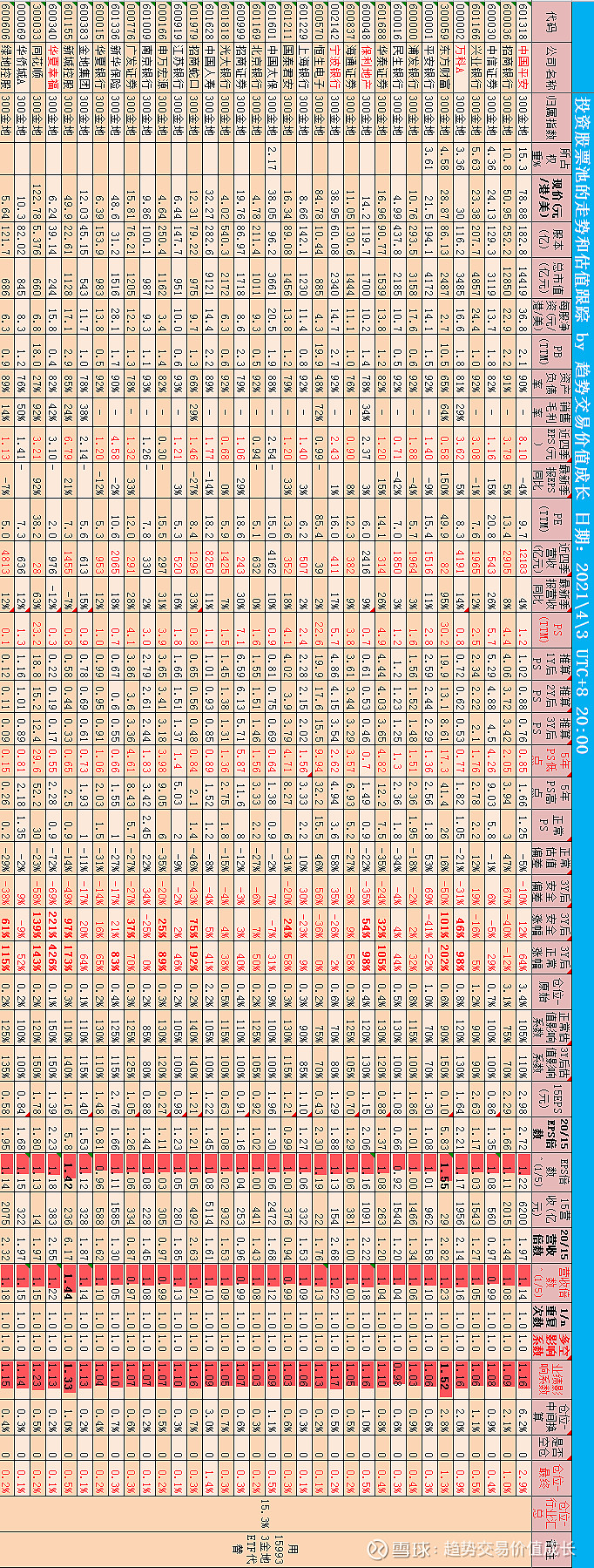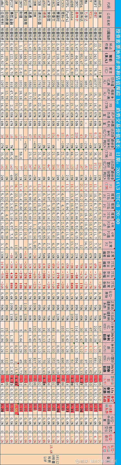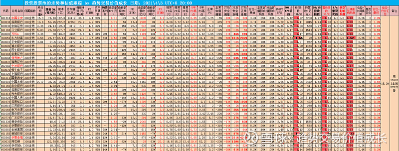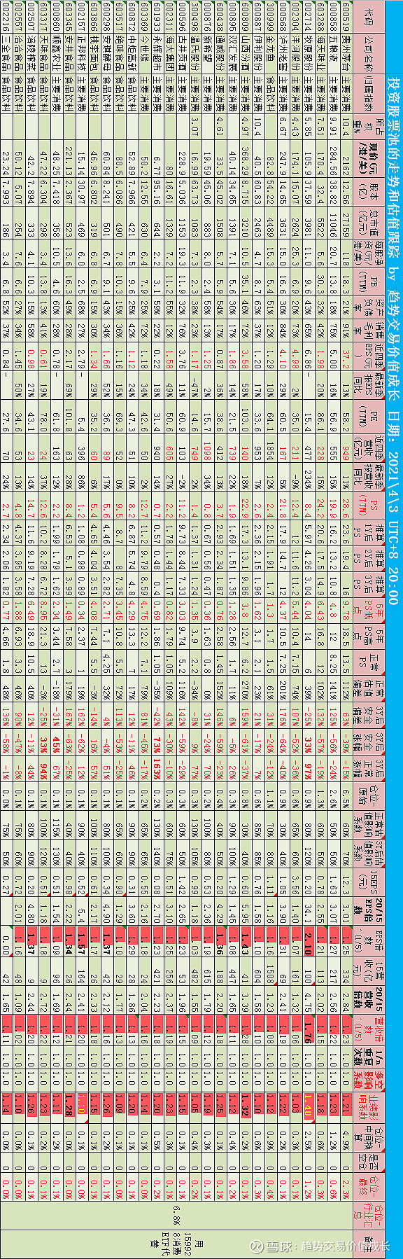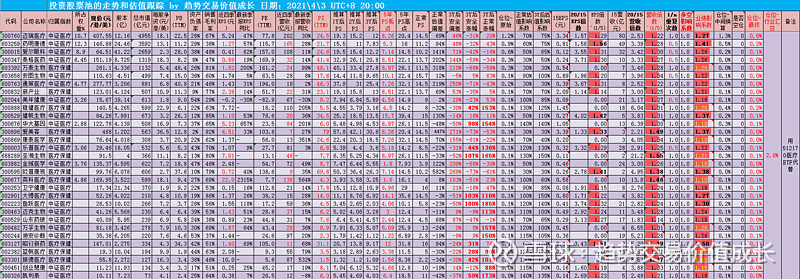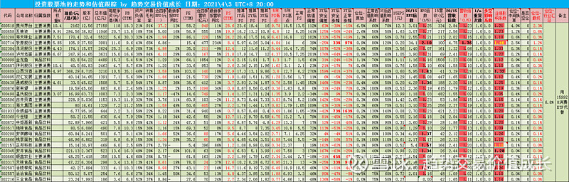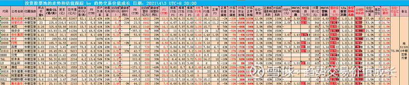 前言:本文主要总结分享我的长线白马投资股票池的估值跟踪情况,全部内容仅为个人投资记录,不构成任何投资建议,我在这里的ID为趋势交易价值成长。关于我的实盘组合,基本上与我的A股组合接近,名为:$玩转A股ETF(ZH2001511)$,2021年初至今(2021.4.3)的收益率约为5.29%。 在前面的文章中,介绍了开展量化交易和趋势交易的投资策略(【寻找圣杯-第17期】股市投资必备:构建简单实用的量化交易+趋势交易的价值投资策略 )。 现在,在此简单记录一下我们实施的简单实用的量化交易+趋势交易投资策略,然后对我的长线白马投资股票池的估值进行跟踪记录。 《估值跟踪-第59期》 1、投资品种的选择和仓位的控制 投资品种选择为长线白马股,适合价值投资。仓位控制上,因为目前是市场正常估值水平阶段,所以现金保留10%仓位左右,剩余的现金都放在银行T+0活期理财上目前主要放在平安银行天天成长C。关于银行活期理财,可以参考文:【寻找圣杯-第18期】低风险投资必备:寻找最高收益率的银行活期理财。现金仓位之外,主要在股票和场内基金上做分配,目前股票50%仓位,场内基金43%仓位,期货0%仓位。除现金外的各品种仓位比例大致参考我的组合(玩转A股ETF(ZH2001511)),如图1、图2和图3。 图1 组合(玩转A股ETF)收益走势2021.4.3 图2 组合(玩转A股ETF)仓位比例2021.4.3 图3 我的实盘组合-持仓-2021.3.20 2、海外中概互联投资股票池 根据量化交易和趋势交易的投资策略,需要进行定期对投资股票池的估值进行跟踪记录,有些股票涨得多,有些跌得多,估值都会不断变化,故可以每周末做一次跟踪记录。本次记录如下图。在这里也稍微解释一下表中主要内容的意思: (1)正常估值偏差:指目前的PS(TTM)相对正常PS来说的估值高低,负值表示目前低估,正值表示目前高估,我目前主要就很看重这一项指标。 (2)3Y后安全涨幅:指按照公司的预期发展速度,3年后股价能够相对安全到达的涨幅。 (3)3Y后正常涨幅:指按照公司的预期发展速度,3年后公司股价能够按照目前的正常估值能够达到的涨幅,我目前主要就最看重这一项指标。 适合电脑阅读版: 适合手机阅读版: $中概互联网ETF(SH513050)$的主要成分股网页链接{$腾讯控股(00700)$ }相对正常PS价位低估2%,按3年后正常估值涨幅为133%。 阿里巴巴BABA相对正常PS价位低估43%,按3年后正常估值涨幅为351%。 另外,也有美团点评03690、拼多多PDD、京东JD或09618、快手01024、网易NTES或09999、百度BIDU、小米集团01810、贝壳BEKE、好未来TAL、携程TCOM、京东健康06618、阿里健康00241、哔哩哔哩BILI、腾讯音乐TME等这几个互联网公司,大家可自行查看。 以上估值仅为根据个人风险承受能力和对公司的发展速度预期所做的判断,仅为个人自己投资使用,不作为投资建议,下面其他的也都是如此。 如果需要了解更多中概互联ETF的知识和获取购买方法,可参考我之前发的文章前往学习,进入链接:【寻找圣杯-第20期】世界顶级的优质基金No.2:易方达中概互联网ETF 3、A股医药行业股票池 适合电脑阅读版: 适合手机阅读版: 医药ETF的最大成分股恒瑞医药高估32%,而其他的主要成分股或潜力成分股(药明康德、爱尔眼科、智飞生物、长春高新、复星医药、片仔癀、云南白药、康泰生物、泰格医药、华兰生物、康龙化成、沃森生物、安图生物、君实生物、甘李药业、美年健康、华熙生物、凯莱英、乐普医疗、华海药业、贝达药业、白云山等),由于2020年的前期涨幅巨大,目前都有挺多的高估。我并不清楚这样的大涨行情是否能够继续,但是如果是泡沫,终究会有破灭的一天的。医药行业当然是个不错的赛道,但是并不是所有公司都会高成长,这里还是要看清楚公司的真正实力才可以。我认为目前还不错的、估值可以消化的医药公司有恒瑞医药、药明康德、智飞生物、长春高新、复星医药、康龙化成、乐普医疗、美年健康、白云山等这几个。 4、A股医疗行业股票池 适合电脑阅读版: 适合手机阅读版: 医疗ETF的主要成分股(迈瑞医疗、药明康德、爱尔眼科、泰格医药、万泰生物、安图生物、通策医疗、新产业、美年健康、稳健医疗、健帆生物、华大基因、爱美客、康泰医学、乐普医疗、圣湘生物、金域医学、欧普康视、英科医疗、卫宁健康、大博医疗、鱼跃医疗、迈克生物、山东药玻、万孚生物、迪安诊断、昭衍新药、蓝帆医疗、振德医疗、创业慧康、凯利泰)大部分都比较高估了。医疗行业同医药行业类似,是个不错的好赛道,今年因为疫情的影响,导致人们对于医药和医疗的关注度达到前所未有的空前热度,行业泡沫巨大,未来必定将会出现分化,好公司或许会继续上涨,一般的公司可能会回调较多。 5、A股主要消费行业股票池 适合电脑阅读版: 适合手机阅读版: 消费ETF的主要成分股(贵州茅台、五粮液、海天味业、牧原股份、洋河股份、泸州老窖、金龙鱼、伊利股份、山西汾酒、双汇发展、通威股份、新希望、温氏股份、古井贡酒、海大集团、永辉超市、今世缘、中炬高新、绝味食品、安琪酵母、桃李面包、正邦科技、安井食品、顺鑫农业、天味食品、涪陵榨菜、洽洽食品、三全食品)大部分都比较高估了。过去靠大量出口来拉动经济未来可能会不那么灵了,所以必定会向扩大内需消费来着手。而且,大家也大致看出来了,2020年美国出点政策,中概股都会大幅下跌,但是消费行业的公司却影