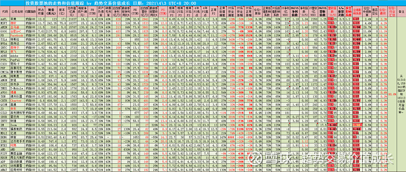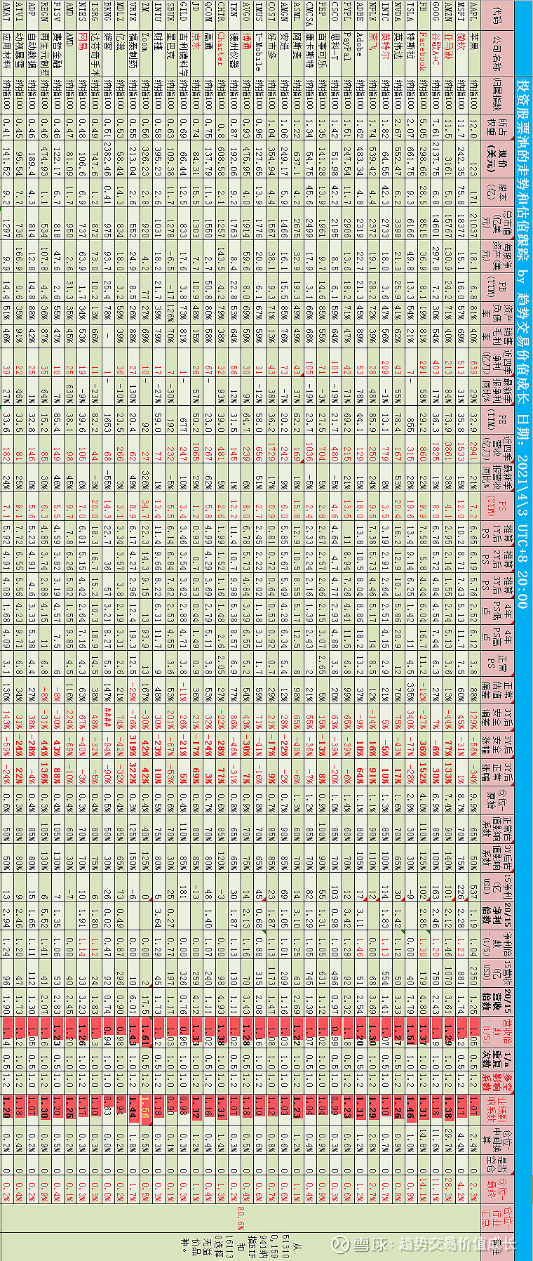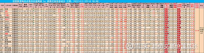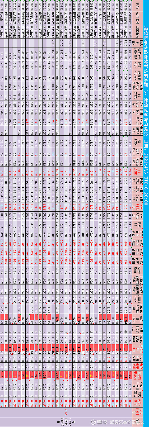 前言:本文主要总结分享我的长线白马投资股票池的估值跟踪情况,全部内容仅为个人投资记录,不构成任何投资建议,我在这里的ID为趋势交易价值成长。关于我的实盘组合,基本上与我的A股组合接近,名为:$玩转A股ETF(ZH2001511)$,2021年初至今(2021.4.3)的收益率约为5.29%。 在前面的文章中,介绍了开展量化交易和趋势交易的投资策略(【寻找圣杯-第17期】股市投资必备:构建简单实用的量化交易+趋势交易的价值投资策略 )。 现在,在此简单记录一下我们实施的简单实用的量化交易+趋势交易投资策略,然后对我的长线白马投资股票池的估值进行跟踪记录。 《估值跟踪-第59期》 1、投资品种的选择和仓位的控制 投资品种选择为长线白马股,适合价值投资。仓位控制上,因为目前是市场正常估值水平阶段,所以现金保留10%仓位左右,剩余的现金都放在银行T+0活期理财上目前主要放在平安银行天天成长C。关于银行活期理财,可以参考文:【寻找圣杯-第18期】低风险投资必备:寻找最高收益率的银行活期理财。现金仓位之外,主要在股票和场内基金上做分配,目前股票50%仓位,场内基金43%仓位,期货0%仓位。除现金外的各品种仓位比例大致参考我的组合(玩转A股ETF(ZH2001511)),如图1、图2和图3。 图1 组合(玩转A股ETF)收益走势2021.4.3 图2 组合(玩转A股ETF)仓位比例2021.4.3 图3 我的实盘组合-持仓-2021.3.20 2、海外中概互联投资股票池 根据量化交易和趋势交易的投资策略,需要进行定期对投资股票池的估值进行跟踪记录,有些股票涨得多,有些跌得多,估值都会不断变化,故可以每周末做一次跟踪记录。本次记录如下图。在这里也稍微解释一下表中主要内容的意思: (1)正常估值偏差:指目前的PS(TTM)相对正常PS来说的估值高低,负值表示目前低估,正值表示目前高估,我目前主要就很看重这一项指标。 (2)3Y后安全涨幅:指按照公司的预期发展速度,3年后股价能够相对安全到达的涨幅。 (3)3Y后正常涨幅:指按照公司的预期发展速度,3年后公司股价能够按照目前的正常估值能够达到的涨幅,我目前主要就最看重这一项指标。 适合电脑阅读版: 适合手机阅读版: $中概互联网ETF(SH513050)$的主要成分股网页链接{$腾讯控股(00700)$ }相对正常PS价位低估2%,按3年后正常估值涨幅为133%。 阿里巴巴BABA相对正常PS价位低估43%,按3年后正常估值涨幅为351%。 另外,也有美团点评03690、拼多多PDD、京东JD或09618、快手01024、网易NTES或09999、百度BIDU、小米集团01810、贝壳BEKE、好未来TAL、携程TCOM、京东健康06618、阿里健康00241、哔哩哔哩BILI、腾讯音乐TME等这几个互联网公司,大家可自行查看。 以上估值仅为根据个人风险承受能力和对公司的发展速度预期所做的判断,仅为个人自己投资使用,不作为投资建议,下面其他的也都是如此。 如果需要了解更多中概互联ETF的知识和获取购买方法,可参考我之前发的文章前往学习,进入链接:【寻找圣杯-第20期】世界顶级的优质基金No.2:易方达中概互联网ETF 3、A股医药行业股票池 适合电脑阅读版: 适合手机阅读版: 医药ETF的最大成分股恒瑞医药高估32%,而其他的主要成分股或潜力成分股(药明康德、爱尔眼科、智飞生物、长春高新、复星医药、片仔癀、云南白药、康泰生物、泰格医药、华兰生物、康龙化成、沃森生物、安图生物、君实生物、甘李药业、美年健康、华熙生物、凯莱英、乐普医疗、华海药业、贝达药业、白云山等),由于2020年的前期涨幅巨大,目前都有挺多的高估。我并不清楚这样的大涨行情是否能够继续,但是如果是泡沫,终究会有破灭的一天的。医药行业当然是个不错的赛道,但是并不是所有公司都会高成长,这里还是要看清楚公司的真正实力才可以。我认为目前还不错的、估值可以消化的医药公司有恒瑞医药、药明康德、智飞生物、长春高新、复星医药、康龙化成、乐普医疗、美年健康、白云山等这几个。 4、A股医疗行业股票池 适合电脑阅读版: 适合手机阅读版: 医疗ETF的主要成分股(迈瑞医疗、药明康德、爱尔眼科、泰格医药、万泰生物、安图生物、通策医疗、新产业、美年健康、稳健医疗、健帆生物、华大基因、爱美客、康泰医学、乐普医疗、圣湘生物、金域医学、欧普康视、英科医疗、卫宁健康、大博医疗、鱼跃医疗、迈克生物、山东药玻、万孚生物、迪安诊断、昭衍新药、蓝帆医疗、振德医疗、创业慧康、凯利泰)大部分都比较高估了。医疗行业同医药行业类似,是个不错的好赛道,今年因为疫情的影响,导致人们对于医药和医疗的关注度达到前所未有的空前热度,行业泡沫巨大,未来必定将会出现分化,好公司或许会继续上涨,一般的公司可能会回调较多。 5、A股主要消费行业股票池 适合电脑阅读版: 适合手机阅读版: 消费ETF的主要成分股(贵州茅台、五粮液、海天味业、牧原股份、洋河股份、泸州老窖、金龙鱼、伊利股份、山西汾酒、双汇发展、通威股份、新希望、温氏股份、古井贡酒、海大集团、永辉超市、今世缘、中炬高新、绝味食品、安琪酵母、桃李面包、正邦科技、安井食品、顺鑫农业、天味食品、涪陵榨菜、洽洽食品、三全食品)大部分都比较高估了。过去靠大量出口来拉动经济未来可能会不那么灵了,所以必定会向扩大内需消费来着手。而且,大家也大致看出来了,2020年美国出点政策,中概股都会大幅下跌,但是消费行业的公司却影