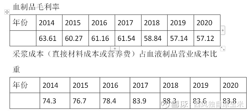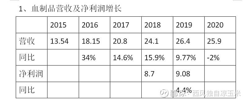 华兰生物(002007):每股净资产 4.29元,每股净利润 0.89元,历史净利润年均增长 25.64%,预估未来三年净利润年均增长 20.52%,更多数据见:华兰生物002007核心经营数据 华兰生物的当前股价 43.31元,市盈率 48.98,未来三年的估值假设和预期收益率如下:15倍PE,预期收益率 -57.34%;20倍PE,预期收益率 -43.11%;25倍PE,预期收益率 -28.89%;30倍PE,预期收益率 -14.67%。 制约华兰生物业绩的几个因素 (个人愚见,不当之处,轻拍!) 2020年公司实现营业收入502,320.63万元,较上年同期增加35.76%,归属于上市公司股东的净利润161,310.53万元,较上年同期增长25.69%。 华兰生物是一家从事血液制品、疫苗、基因工程产品研发、生产和销售的国家高新技术企业。公司业务包括血液制品业务、 疫苗制品、创新药和生物类似药研发、生产三类业务,其中血液制品有人血白蛋白、静注人免疫球蛋白、人免疫球蛋白、人凝血酶原复合物、人凝血因子VIII、狂犬病人免疫球蛋白、乙型肝炎人免疫球蛋白、破伤风人免疫球蛋白等11个品种(34 个规格),是我国血液制品行业中血浆综合利用率较高、品种较多、规格较全的企业之一。2020年,公司研发的采用层析分离纯化工艺和纳米膜过滤+低pH孵放双重病毒灭活去除病毒工艺技术研制的三种规格的新一代静注人免疫球蛋白取得《临床试验通知书》;研发的新药重组Exendin-4-Fc融合蛋白注射液(适应症为:II型糖尿病患者,辅助饮食和运动治疗改善血糖控制)取得药物临床试验批准通知书,正按计划开展临床研究;公司研发的新工艺人纤维蛋白原和层析工艺静注人免疫球蛋白(pH4)取得《药品补充申请批准通知书》,进一步提高了产品收率和产品质量;重庆公司研发的人凝血因子Ⅷ和人凝血酶原复合物已完成临床研究工作并已申报生产。 公司控股子公司华兰生物疫苗有限公司从事疫苗的研发、生产和销售,目前已上市的疫苗有流感病毒裂解疫苗、甲型H1N1 流感病毒裂解疫苗、四价流感病毒裂解疫苗、A群C群脑膜炎球菌多糖疫苗、ACYW135群脑膜炎球菌多糖疫苗、重组乙型肝炎疫苗(汉逊酵母)。2020年公司共实现流感疫苗批签发2,315.3万剂,占全国流感疫苗批签发量的40.16%,其中四价流感病毒裂解疫苗批签发2,062.4万剂,占全国四价流感病毒裂解疫苗批签发量的61.41%,流感疫苗的生产量和销售量继续保持行业首位;破伤风疫苗接受了国家药品监督管理局食品药品审核查验中心的生产现场核查,四价流感病毒裂解疫苗(儿童)已完成临床试验并申报药品注册。 公司参股公司华兰基因工程有限公司主要开展创新药和生物类似药的研发、生产,目前已取得曲妥珠单抗、利妥昔单抗、 贝伐单抗、阿达木单抗、德尼单抗、帕尼单抗和伊匹单抗的临床试验批件,正在按计划开展临床试验。 (摘自2019年报)。 下面我们就从血制品、疫苗、单抗三个方面来分析制约华兰生物的因素。 血制品血制品营收及净利润增长 2017年以前疫苗公司亏损,血制品净利润不准确。2020年报未披露疫苗公司净利润,参照下表疫苗公司分拆上市的净利润表,2018年净利润率为33.6%,2019年净利润率为35.3%,考虑2020年四价流感疫苗的放量和销售费用增加了5.5亿,增长106.7%,考虑分拆上市的净利润占比情况,非常不情愿的估算2020年疫苗公司的净利润为8亿,则血制品公司利润为8.1亿。 从另一个角度看,血制品营收微降,估算血制品净利润为8.8亿左右,则疫苗公司的利润为7.3亿。至于基因公司不考虑。 2015-2020年受限于采浆量、毛利率下降等诸多因素,血制品营收增速逐年下滑,如果排除2020年度新冠疫情的影响,2020年度血制品营收基本微增5%以下。 采浆量 血液制品行业整体采浆量 单位吨 据有关统计,血制品行业整体需求量2018年-2020年14000吨,2018年之前12000吨。数据不一定准,但可以说明国内血制品依然处于供不应求的状态。 华兰生物采浆量 2018年和2019年均未披露采浆量,根据2020年报,2020年度公司下属单采血浆站血浆采集量为1000多吨,采浆量与2019年基本持平。说明自2017年达到1100吨之后,2018-2020年采浆水平基本稳定在1000-1100吨之间,这从下表浆站的数量也能说明,已经3年未新批浆站。2015年23家,一家在建;2016,23家均能采浆,2017年新增河南鲁山新建单采血浆站。2018新增重庆1家。 浆站数量 五年时间仅增加两家单采浆站,说明整体行业目前比较萎靡,地方政府对于民营企业采浆站的设立也比较小心谨慎,天坛生物最近几年获得多个浆站的批复。另外,企业对于兼并重组的意愿几乎是没有,从这几年的年报中就没有提到过兼并重组的词语表述。2020年双林生物成功并购哈尔滨的血制品企业,实现规模的扩张。 2、毛利率 血制品毛利率 从上面两表看到,14年-18年血制品的采浆成本(直接材料成本或者营养费)占营业成本的比重逐年上升,2018年采浆量放量达到新高的1100吨,导致采浆成本也达到新高,2019年-2020年稳定在84%左右的高位。另外毛利率也是逐年下降,2014-2020年下降了6.49个百分点。相比采浆成本的上涨比例,血制品毛利的下降幅度较低,这也说明了企业在管理水平和降本增效方面成效显著。 3、消费结构 在近几年的年报中经常出现的话就是注重血液制品的产品结构调整,加大市场急需产品的生产,也就是说市场需要什么,我生产什么,哪种毛利率高,我生产哪种。从批签发的量也看的出来,凝血Ⅷ因子的销量增长幅度较大,市占率也较高。同样也说明管理层还