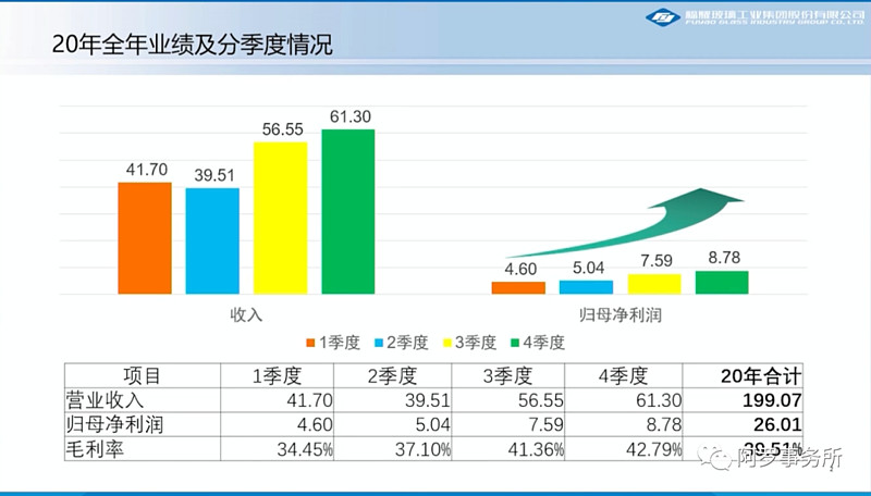 福耀玻璃(600660):每股净资产 8.98元,每股净利润 1.04元,历史净利润年均增长 13.45%,预估未来三年净利润年均增长 30.71%,更多数据见:福耀玻璃600660核心经营数据 福耀玻璃的当前股价 48.66元,市盈率 40.74,未来三年的估值假设和预期收益率如下:15倍PE,预期收益率 -20.14%;20倍PE,预期收益率 6.47%;25倍PE,预期收益率 33.09%;30倍PE,预期收益率 59.71%。 2020 年营收 199.07 亿,同比 19 年 -5.67%;归母净利润 26.01 亿,同比 -10.27%;归属上市公司扣非净利润 23.04 亿,同比 -17.8%;经营净现金流 52.77 亿,同比 +2.94%;2020Q4 营收 61.3亿,同比 +12.07%,环比 +8.04%,归母净利润 8.78亿,同比 +59.06%,环比 +15.67%。 如果排除掉汇兑损失、19年福耀伊利诺伊有限公司违反独家经销协议赔偿影响、美国工厂疫情影响损失的话,那么20年净利润同比增长 6.91%。上面的财报数据整体看不太好,但是结合疫情的情况,也符合我们的预期,特别是通过 2020Q4 的财务数据分析,里面透漏着一些喜人的细节。下面通过一组图表展示。 2020Q4 营收、利润、毛利率同比都有提高,其中毛利率最为亮眼,达到 42.79%,证明福耀玻璃毛利率正在恢复到17、18年高位。随着国内外疫情影响减弱,叠加汽车周期复苏,我预判Q4的业绩会有持续性。 在阅读财报与收集数据中,发现如下对预期业绩有支撑的几个方面。 1、有科技含量的玻璃占比提升 靠着研发费用占比营收 4.1% 的研发,福耀保持着玻璃行业的技术先进性。其中,天幕、隔热、隔音、抬头显示、可调光、防紫外线、憎水、太阳能、包边模块化等高附加值产品占比持续提升,占比较上年同期上升2.64个百分点,价值得以体现,给玻璃的提价带来利好,也给毛利率的提高提供支撑。 2、境外市场占有率提升 福耀玻璃国内营收占 53.55%,国外营收占45.12%,国外营收占到近一半。福耀玻璃在全球汽车玻璃行业市场占有率超过28%,在中国的汽车玻璃市场占有率超过65%,全球第一,结合着看,福耀如果继续提高境外市场占有率,也给未来的营收增长带来预期,并且福耀在18年也确实提出了将全球市占率提高到 30%以上的目标。 3、整车用玻璃占比提升 目前全玻璃车顶已经是个趋势,会提高整车玻璃使用量占比,作为汽车玻璃龙头,会首先受益,支撑后续营收增长。 4、铝饰条业务减损增收 备受关注的铝饰条业务,收购的 SAM,原计划是20年收支平衡,因疫情导致会往后延到 21 年达到不亏损,贡献利润预计在22年了。铝饰条业务整合成功,会扩展福耀的业务线,提高玻璃产品的附加值,更能卖上价了。 综上总结,随着汽车周期复苏,依靠高附加值产品科技价值提升,凭借天幕玻璃趋势提高整车玻璃用量,整合铝饰条业务达成减损增收,再结合福耀玻璃的精细管理与性价比,提高境外市场份额,我有理由长线继续看好。 风险: 1、就是汽车周期恢复不达预期或者慢速增长; 2、市场出现另外一家有颠覆技术的汽车玻璃竞争者,譬如京东方生产信息显示玻璃,目前认为这个辛苦活京东方还没技术做。 对于目前福耀的股价是否高估,我通过自由现金流折现(DCF)测算了一下,通过公式估值这种方式只是提供一个参考,参数不同,结果也大相径庭。每个人都对福耀玻璃有自己的认知,预期增速智者见智,当个参考就好。 利益相关:长期持有福耀玻璃,最近没有买卖计划。 $福耀玻璃(SH600660)$ 作者:价值慢牛原文链接:https://xueqiu.com/5618920272/176409766 转载请注明:www.51xianjinliu.com » 福耀玻璃2020年财报简析 喜欢 (0)or分享 (0)