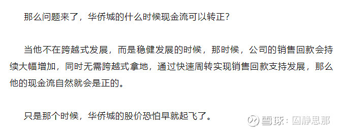 华侨城A(000069):每股净资产 9.54元,每股净利润 1.56元,历史净利润年均增长 24.39%,预估未来三年净利润年均增长 17.91%,更多数据见:华侨城A000069核心经营数据 华侨城A的当前股价 9.36元,市盈率 6.05,未来三年的估值假设和预期收益率如下:15倍PE,预期收益率 295.21%;20倍PE,预期收益率 426.95%;25倍PE,预期收益率 558.69%;30倍PE,预期收益率 690.43%。 今天我们来看看华侨城2020年的年报。 1、成长性 在一年二倍的投资机会:华侨城的四个预期差中,表示华侨城最大的预期差是恢复成长性,从死气沉沉变成朝气蓬勃,体现在资产负债表上,有两个科目。 一是存货余额大幅增长。截止2020年底,存货余额2505亿元,同比增长35%,是2017年底的2.5倍。 二是预收账款和合同负债,截止2020年底,预收账款(含合同负债)余额885亿元,同比增长26%,是2017年底的3倍。 反映到销售额上,全年实现销售1052亿元,历史新高,同比增长22%,是2017年的2.15倍。 存货的持续增长保证了可售货值,可售货值的持续销售保证了预收账款,预收账款的结算确认保证了收入和利润的增长。 最终2020年实现营业收入819亿元,大幅增长36%,归母净利润127亿元,增长3%,扣非净利润97亿,同比下滑3%。 收入大幅增长,扣非利润下滑,两个意料之中的原因:一是疫情影响,文旅收入压力肯定大,而成本费用是刚性的。二是纯地产业务毛利率的下滑:2020年纯地产业务毛利率下滑了15个百分点,但是依然高达59%。 这里第一点不具有可持续性,第二点不会持续大幅下滑,也不具有可持续性。 总之,2021年华侨城依然可以维持20%左右的增长率。 2、经营现金流 关于经营现金流,在现在这家公司,就是股价没涨之前的茅台中详细论述过: 那么问题来了,华侨城的什么时候现金流可以转正? 当他不在跨越式发展,而是稳健发展的时候,那时候,公司的销售回款会持续大幅增加,同时无需跨越式拿地,通过快速周转实现销售回款支持发展,那么他的现金流自然就会是正的。 只是那个时候,华侨城的股价恐怕早就起飞了。 果然,今年年报显示,华侨城经营现金流净额高达212亿元,一年就覆盖了过去三年的流出,还有结余。 股价也再也看不到0.7倍PB的华侨城了! 3月开始带大家布局的中材节能(603126)和华银电力(600744),到现在都已经实现了翻倍! 还有前几天在(公 众 号)提示的长源电力(000966)和菲达环保(600526)也都吃了一波肉,这足以证明笔者的实力。 4月份布局已经开始了 ,把握住好机会!最近复盘精选一只高质量翻倍妖股。该股目前已被游资机构重仓,处于震荡上行趋势,庄家控盘程度极高,近期受大盘调整后,技术上弧形底部,主力控盘不错。尾盘大资金介入明显,这波大资金,很大机会要打造一只大妖股!也是我最近一直重点关注!短期预计至少有128%以上的涨幅,明天正是低吸建仓最佳时机!接下来吃一次大 肉,早点跟上,早点回血。 想跟上节奏的朋友,来微信公众号:玩股 大师 回复“名单”即可。 华侨城的经营现金流一点都不值得担心,不论是旅游业务还是房地产业务,都是先收钱的买卖。前几年不好,只是储备土地而已。 目前子弹已经充足,预计进入良性发展结算,以后年度的经营现金流应该不会为负了。当然,季度上不好说,一季度经营现金流大概率还是负的,这没什么值得担心的。 至于分红,锦上添花而已,目前阶段,看分红买什么华侨城。 说到这里,不得不佩服万科,万科的稳健发展最大的体现点就是经营现金流非常稳定,希望华侨城以后可以跟万科一样,在经营现金流方面稳健一点。 3、有息负债 房地产的三套红线是大家分析的重点,从华侨城来看,随着经营现金流的好转,整个现金流量表都很好看。 投资现金流净流入6.55亿,2015年以来首次为正。 筹资现金流净额27亿,要知道过去三年这个科目分别为293亿、234亿和213亿。随着经营现金流好转,公司发展不需要那么大的筹资规模了,偿还债务流出金额1121亿元,同比大增500亿。 当然,负债规模整体还是增长的,不过长期借款大幅增加300多亿,短期借款大幅减少100亿,负债结构更合理了。 要知道,华侨城后面还有很多“欢乐海岸”需要投入。 4、欢乐海岸 欢乐海岸类项目不仅是公司成长性的体现,更是后面提升估值的保证。 不过关于欢乐海岸类项目,公司表述不多,目前开业的只有深圳、顺德和中山欢乐海岸,深圳欢乐港湾、南昌准开业。 这种项目只要开业基本就是当地城市的网红点,人流量非常大,上周刚刚去了深圳的欢乐港湾,摩肩接踵,非常恐怖。 华侨城的欢乐海岸对于传统商业业态基本是降维打击。 但是这种项目急不得,目前落地项目非常多,在华侨城,地产股、文旅股还是造城者?文章中,统计是在建13个,签约16个,目前不确定这些数据的准确性。 这些目前还有待观察。 5、股价 2021年以来,华侨城股价大涨41%,不论是旅游板块还是地产板块独树一帜,非常牛逼。 整个过程跟下来,这波上涨出乎的意料,没有太多征兆,港资持股变化不大,大概率是机构资金? 不管怎么样,一些坚守的小伙伴,获得了坚守的回报。 你要问华侨城低估不低估,觉得肯定还是低估,但是你要问华侨城还能不能涨,不知道。 今年以来,不少低估的公司没涨到合理估值就跌回去的不在少数。 短期股价无法预测。 $华侨城A(SZ000069)$ $上证指数(SH000001)$ #价值投资# @今日话题 作者:囜静思那原文链接:https://xueqiu.com/5891715360/176616579 转载请注明:www.51xianjinliu.com » 华侨城A深度分析未