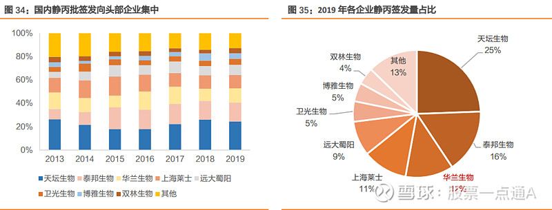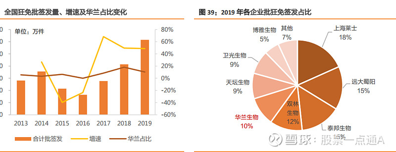 华兰生物(002007):每股净资产 4.29元,每股净利润 0.89元,历史净利润年均增长 25.64%,预估未来三年净利润年均增长 20.52%,更多数据见:华兰生物002007核心经营数据 华兰生物的当前股价 43.31元,市盈率 48.98,未来三年的估值假设和预期收益率如下:15倍PE,预期收益率 -57.34%;20倍PE,预期收益率 -43.11%;25倍PE,预期收益率 -28.89%;30倍PE,预期收益率 -14.67%。 华兰生物工程股份有限公司成立于 1992 年,前身为华兰生物工程有限公司,建立之初是 一家单纯的血液制品企业,1998 年首家通过血液制品行业 GMP 认证,2000 年被认定为高 新技术企业。 2005 年华兰成立疫苗子公司,2013 年又与股东共同成立华兰基因工程有限公司,正式进 军基因重组与单克隆抗体领域。2018 年 6 月,疫苗子公司取得四价流感病毒裂解疫苗生产 文号、新药证书及 GMP 证书,成为我国首家获准上市该疫苗的企业,目前已成为我国最 大的流感病毒裂解疫苗生产基地。公司逐渐形成血液制品、疫苗、单克隆抗体及重组药物 为核心的大生物产业格局。 血液制品按照其功能和结构的不同可分为白蛋白、免疫球蛋白和凝血因子等三大类产品。公司是国内首家通过 GMP 认证的血液制品企业,能从血浆中分离提取人血白蛋白等 11 个品种、34 个规格的产品,生产规模、品种规格、市场覆盖和主导产品产销量均居国内同行业前列,是国内同行业中综合利用率最高和凝血因子类产品种类最为齐全的生产企业之一。 白蛋白是血浆中含量最多的蛋白,也是目前国内需求量最大的血液制品,广泛用于肿瘤、肝病、糖尿病的治疗。人血白蛋白具有调节血浆渗透压、运输、解毒和营养供给功能;适用于癌症化疗或放疗患者、低蛋白血症、烧伤、失血创伤引起的休克,肝病、糖尿病患者,可用于心肺分流术、血液透析的辅助治疗和成人呼吸窘迫综合症。 全国白蛋白批签发量一直呈上升趋势,2018 年增速为 18%,2019 年受到上海新兴事件影响,批签发缩紧,全年批签发 5213 万件,同比增加 8%。由于白蛋白分子量大,在分离时易于提纯去除血源性传染病毒,而且国内对于白蛋白的需求市场巨大,因此白蛋白是我国唯一允许进口的血液制品,进口企业批签发占比一直维持在 50%~60%,占据了大部分市场份额。 国产企业中,天坛生物、泰邦生物、上海莱士、华兰生物占据批签发前四,除这四家之外,其他企业市场份额逐年下降,批签发向头部企业集中的趋势明显。 静脉注射免疫球蛋白(Intravenous immunoglobulin,IvIg)又称人丙种球蛋白,简称静丙,是从上千份人血浆中提取的一种由人体免疫系统受抗原刺激后产生的免疫物质所制成的生物制剂,含有广谱抗病毒、细菌或其他病原体的 IgG 抗体。 在临床上应用广泛,具有免疫替代和免疫调节的双重治疗作用,主要用于失血创伤,烧伤引发的休克;脑水肿及损伤引发的颅内升高和持续性脑积水等,能迅速提高接受者血液中的 IgG 水平,增强机体的抗感染能力和免疫调节功能。 狂犬病人免疫球蛋白(狂免)仅供肌肉注射,主要用于被狂犬或其他携带狂犬病毒的动物咬伤、抓伤患者的被动免疫。 中检院数据显示,自 2016 年开始,全国狂免批签发量逐年上升,近两年增速接近 50%,2019年批签发 1231 万件。公司 2019 年狂免批签发量为 126 万件,占比 10%,去年同期占比为16.6%,批签发量占比有小幅下降,主要是由于公司目前调整产品结构,逐渐集中优势开发疫苗新产品。 随着人们生活方式的转变,宠物猫狗的数量在不断增加,未来狂免市场还有很大的提升空间。 破伤风人免疫球蛋白是用吸附破伤风疫苗对健康献血员进行检疫后,获得的特异免疫血浆。主要是用于预防和治疗破伤风,尤其适用于对破伤风抗毒素(TAT)有过敏反应者。从批签发量来看,全国破免批签发量除 2018 年有所下降外均保持稳定上升,2019 年共计批签发 606 万件,同比大幅提升 79%。公司破免批签发变化整体符合全国的趋势,2019 年批签量 140.5 万件,同比大幅提升 60%。行业中破免批签发格局较为稳定,华兰近两年位于前列。 人凝血因子Ⅷ主要对缺乏因子Ⅷ所致的凝血机能障碍具有纠正作用,主要用于防治甲型血友病和获得性凝血因子Ⅷ缺乏而致的出血症状及这类病人的手术出血治疗。全国因子Ⅷ批签发量稳提升,2019 年由于批签发收紧,增速由 2018 年的 34.7%回落至-1.8%,批签发 171 万瓶(统一规格为 200IU)。 华兰生物作为人凝血因子Ⅷ的市场引领者,批签发占比近两年维持在 37%,2019 年批签发 63 万瓶,同比-2.2%。考虑到产品的品牌效应和血友病患者的刚性需求,未来公司因子Ⅷ收入有望保持稳健增长。 华兰生物 2005 年成立疫苗公司,布局疫苗业务已达 14 年,目前已成为我国最大的流感病毒裂解疫苗生产基地。近年来,公司在以血液制品为依托的基础上,发展多样性的产品组合,进一步强化血液制品优势地位,快速做大疫苗产业规模。公司目前主要有四种疫苗产品:流感病毒裂解疫苗、重组乙型肝炎疫苗(汉逊酵母)、ACYW135 群脑膜炎球菌多糖疫苗和甲型 H1N1 流感病毒裂解疫苗。 华兰生物所生产的流感疫苗分为三价和四价两种,在从批签发量上来看,自 2018 年四价流感疫苗有批签发记录以来,2019 年前三季度批签发总和已经超过 2018 年全年,根据市场上流感疫苗接种的发展趋势,预计公司会逐步将三价疫苗的产能向四价疫苗转换。从竞争格局上看,目前市场上在售的三价流感疫苗厂家主要有科兴生物