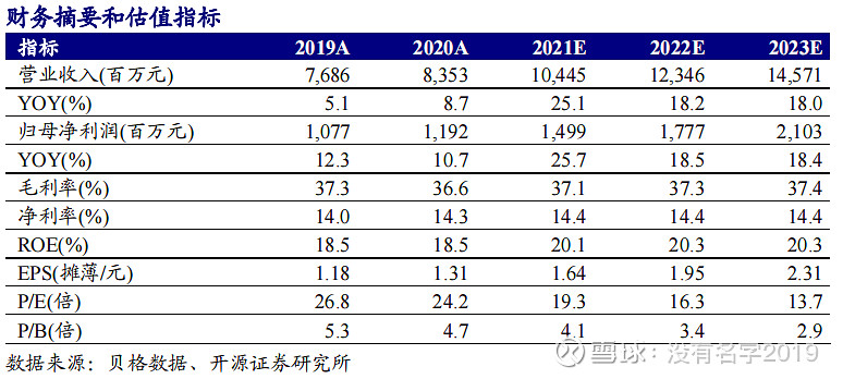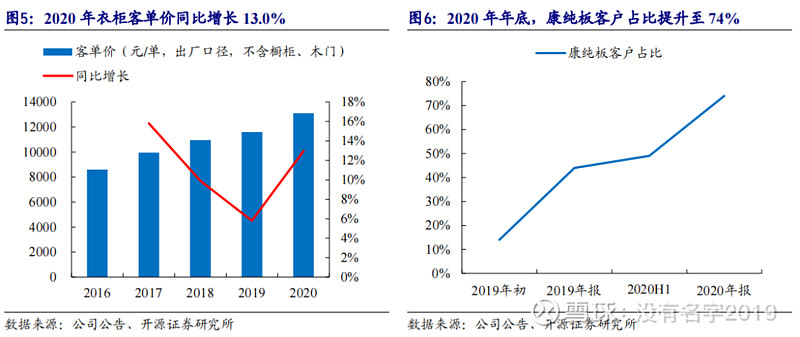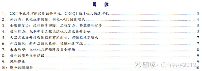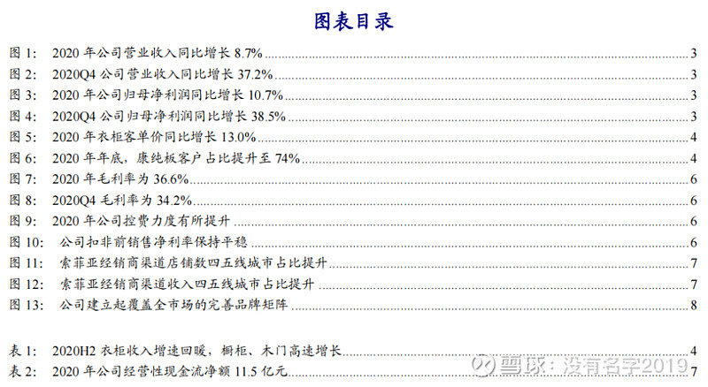 索菲亚(002572):每股净资产 6.86元,每股净利润 1.31元,历史净利润年均增长 39.11%,预估未来三年净利润年均增长 17.36%,更多数据见:索菲亚002572核心经营数据 索菲亚的当前股价 30.8元,市盈率 23.57,未来三年的估值假设和预期收益率如下:15倍PE,预期收益率 -7.11%;20倍PE,预期收益率 23.86%;25倍PE,预期收益率 54.82%;30倍PE,预期收益率 85.79%。 点击关注, 可以订阅哦! 投资要点 文:开源吕明可选消费团队(轻工/家电/纺服) 2020年业绩接近预告中枢,2021Q1收入快速增长,维持“买入”评级 公司发布2020年报和2021年一季报,2020年公司实现营收83.53亿元(+8.7%),归母净利润11.92亿元(+10.7%),扣非归母净利润10.50亿元(+8.1%)。2021Q1,公司预计收入16.0亿元-18.3亿元,同比增长110%-140%,相较2019Q1增长35%-55%;预计扣非后净利润0.85亿元-1.05亿元,2020Q1同期亏损6549万元,相较 2019Q1增长7.6%-32.9%。业绩符合预期,维持2021-2022年盈利预测不变,预计2021-2023年归母净利润14.99/17.77/21.03亿元,对应EPS为1.64/1.95/2.31元,当前股价对应PE为19.3/16.3/13.7倍,维持“买入”评级。 衣柜逐渐回暖;工程渠道驱动橱柜+木门快速增长;整装渠道顺利起步 2020年衣柜/橱柜/木门收入分别增长1.5%/42.3%/55.3%。其中,衣柜客单价同比增长13.0%至13905元/单,2020年底公司康纯板客户占比提升至74%。橱柜和木门2020H2在工程渠道取得了显著突破,收入增速均显著提升。工程渠道2020年收入15.1亿元,收入占比提升至18.08%,同比增长约99.1%,2020Q4收入7.8亿元。此外,经销渠道2020Q4收入约23.8亿元,根据我们估算同比增速约20%,继续呈逐季回暖趋势。而整装渠道2020年实现销售额7417.31万元,顺利起步。 工程渠道收入占比提升对毛利率有所影响,但扣非后净利率保持稳定 2020年,公司毛利率为36.6%,同比下降0.8pct,2020Q4毛利率为34.2%,同比下降3.3pct,毛利率下降或主要系2020Q4工程渠道收入占比提升。但受益于控费力度提升,公司2020年扣非后净利率为12.57%(-0.06pct),依然保持稳定。 展望2021:立体化品牌矩阵覆盖全市场,有望加速抢占市场份额 2021年公司将以更为立体的、覆盖全市场的完善品牌矩阵进一步抢占市场份额,分别是以中高端市场为目标的“索菲亚–柜类定制专家”,以高精人群为目标的“司米–定制家居”和“华鹤–定制家居”和以大众市场为目标的“米兰纳–定制家居”。司米橱柜和米兰纳2021年分别计划开100家独立店和350家线下店。 风险提示:竣工数据和终端需求回暖不及预期;工程渠道拓展不及预期。 1 2020年业绩增速接近预告中枢, 2020Q1预计收入快速增长 2020年公司实现营收83.53亿元(+8.7%),归母净利润11.92亿元(+10.7%),扣非归母净利润10.50亿元(+8.1%)。其中,2020Q4公司收入32.59亿元(+37.2%),归母净利润4.95亿元(+38.5%),扣非归母净利润4.66亿元(+39.6%)。2020年,合计约1.43亿元的非经常性损益主要源于政府补助和持有金融资产公允价值变动。 2021Q1,公司预计收入16.0亿元-18.3亿元,同比增长110%-140%,相较2019Q1增长35%-55%;预计归母净利润1.05亿元-1.3亿元,2020Q1同期亏损1655万元,相较2019Q1下降1.9%至增长21.5%;预计扣非后净利润0.85亿元-1.05亿元,2020Q1同期亏损6549万元,相较2019Q1增长7.6%-32.9%。 2 分品类:衣柜逐渐回暖,橱柜+木门快速增长 分主要品类拆分公司收入: (1)衣柜及其配套品:康纯板推广顺利,客单价持续提升 2020年收入67.02亿元(+1.46%),其中2020H2收入45.1亿元(+16.3%)。公司全年衣柜收入增速相对其他品类较慢的原因主要为:公司一二线城市占比高,因此受疫情影响较为严重;精装房衣柜配套率较低,因此大宗工程业务对衣柜的拉动并不明显;新渠道和新品牌还处于导入期。2020H2,伴随疫情影响逐渐消除,公司衣柜收入增速已经出现明显的回升。 同时,公司衣柜客单价提升的逻辑仍然不断兑现中。2020年,索菲亚客单价(出厂口径,不含橱柜、木门)同比增长13.0%至13905元/单。康纯板、轻奢等品类拓展依然顺利,2020年底公司康纯板客户占比提升至74%,订单占比提升至66%,2020H2康纯板占比加速提升。 (2)司米橱柜:工程渠道加速突破,经销战略逐渐清晰 2020年收入12.11亿元(+42.3%),其中2020H2收入9.57亿元(+77.6%),已成功跻身中国市场橱柜品牌第一梯队。2020年司米橱柜在工程渠道开始发力,2020H2收入增速显著提升。经销渠道发展战略也逐渐清晰,在促使原有经销商继续新开分店的同时加快全屋店招商,加速布局全屋定制新赛道。 (3)木门:加强品类联动,工程发力 2020年收入2.92亿元(+55.3%),其中2020H2收入2.03亿元(+89.7%)。公司品类联动效率显著提升,木门与索菲亚柜类的花色匹配率达到70%,系列匹配率达到73.3%。此外,报告期内木门工程渠道收入也有显著增长。 3 全渠道发力:经销逐季回暖,工程发力,整装顺利起步 分主要渠道看: (1)经销渠道:逐季回暖,蓄势待发 经销渠道2020年收入65.6亿元,2020Q4收入23.8亿元。根据我们估算,2020Q4公司经销渠道收入同比增速约20%,增速环比继续回暖。 我们继续看好2021年公司在经销渠道的增长。一方面,从行业来看,2021年地产竣工有望回暖进而带动下游家居零售增长,并且2020Q1-Q3定制家居行业受到了疫情较大的冲击因而具有低基数的特点。另一方面,从公司自身看,在继续深化经销商管理的同时(2021年预计仍将淘汰不低于5%的索菲亚经销商),终端门店进一步升级,品牌矩阵也在不断完善。2020年索菲亚全国建店(全新开店、重装及整改)数量达2519家。 (2)工程渠道:品类拓展红利快速释放 工程渠道2020年收