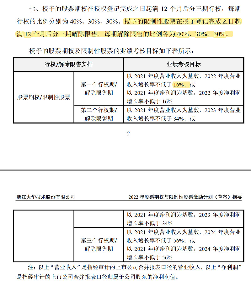 大华股份(002236):每股净资产 6.6元,每股净利润 1.34元,历史净利润年均增长 35.29%,预估未来三年净利润年均增长 20.12%,更多数据见:大华股份002236核心经营数据 大华股份的当前股价 16.51元,市盈率 14.22,未来三年的估值假设和预期收益率如下:15倍PE,预期收益率 111.01%;20倍PE,预期收益率 181.34%;25倍PE,预期收益率 251.68%;30倍PE,预期收益率 322.01%。 $海康威视(SZ002415)$ $大华股份(SZ002236)$ 从13年限制性股票激励后,大华在18年在启动股权激励,这个激励和新CEO到岗应该有关。新CEO为李柯,在华为工作21年后,从地总岗位来到大华,2017年5月份开始任总裁/CEO。从17年年报看,其年薪是189.98万元。通常新的高管进入,会开始进行一轮股权激励,云南白药引入董明也是如此。 一、2018年8月,大华发布股权激励的草案。本计划拟授予的股票数量为121,749,000股(最终以实际认购数量为准),拟授予的限制性股票所涉及的股票来源为公司向激励对象发行的人民币普通股(A股)股票,约占本计划公告时公司股本总额的4.2000%。公司拟首次授予激励对象限制性股票的价格为8.17元/股,系根据本次激励计划草案公告前1个交易日交易均价的50%与前20个交易日交易均价的50%之较高者确定。 从解锁条件看,2018年营收相对17年有25.58%增长,满足第一个解锁期条件。后面两个解锁期无法满足条件。CEO李柯只能解锁32万股。 二、2020年4月,大华发布股权激励草案。这是一次针对高管的限制性股票激励(半价),此时李柯辞职总裁职务,张兴明接任执行总裁,傅利泉任董事长兼总裁。这个解锁条件非常高,20年营业收入同比19年增长34.1%,21年营收相比19年增长64.95%。利润也有相应的要求,收入目标无法达成,显然这两个解锁期都无法解锁。 三、2022年4月,大华再次启动股权激励计划,这次规模庞大,占股本5%,包含高管和骨干员工。 本激励计划拟授予激励对象权益总计14,972.80万份,约占本激励计划草案公告日公司股本总额299,455.073万股的5%。其中股票期权激励计划和限制性股票激励计划计划各一半。本激励计划授予的股票期权的行权价格为16.86元/股,限制性股票的授予价格为8.43元/股。这次的解锁条件看比18,20年两次要宽松,收入增长率从23%,34%降低到了16%,且和利润采用或的关系,而非前两次的与关系。 四、大华股权激励的小结。 大华股份老板是傅利泉和朱江明,属于典型的私企。在这里面做高管,想拿到限制性股票或者股权激励计划,挑战还是很大的。大华创始人之一朱江明负责零跑的情况来看,提出三年超越特斯拉,说明大华创始人可能敢于提不太现实的目标,这也许是大华18,20年两次股权激励只有20%解锁率的原因。 从18年,20年的两次股权激励来看,18年3期,20年的2期,合计5期解锁,真正解锁成功的只有1期。 针对2022年的股权激励,覆盖范围更宽,适当降低了解锁条件,是有机会成功的,如继续解锁不成功,可能对高管和骨干的积极性会有所伤害。 另外,从18,20,22年三次的股权激励来看,限制性股票授予价格都在8元左右(市场价半价)。也就是对于16元的价格,管理层应该认为属于低估区间。 作者:前瞻三五年原文链接:https://xueqiu.com/2817581036/216126631 转载请注明:www.51xianjinliu.com » 从股权激励视角看大华股份 喜欢 (0)or分享 (0)