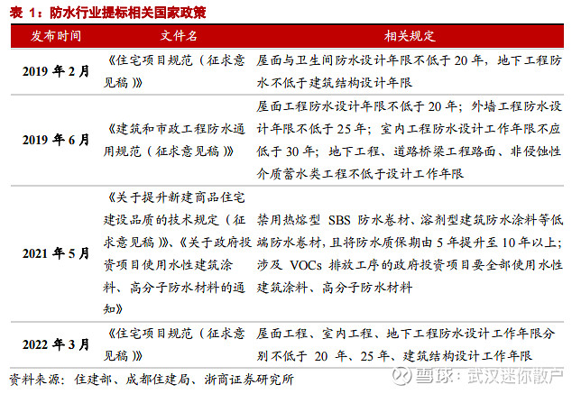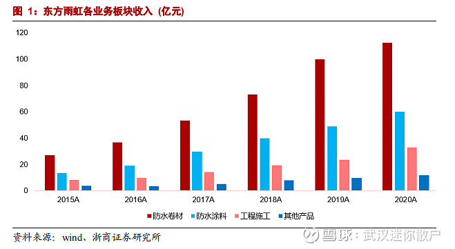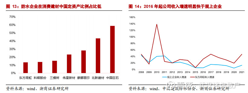 1. 防水绝对龙头,业绩稳步提升 1.1. 防水主业为收入主要来源 防水主业是公司最重要业务。公司以防水为主业,其中以防水卷材为主,占公司收入约 50%。公司防水业务的规模优势显著,是亚洲最大的防水系统服务商。 1.2. 收入、业绩持续高增长 上市至今收入复合增长 34%、业绩复合增长 42%。东方雨虹 1995 年成立,2008 年上市,上市至今 2008-2021 年收入从 7.12 亿增长至 318.92 亿,成长为防水行业绝对龙头,CAGR 达 33.97%,归母净利润从 0.44 增长至 41.85 亿,CAGR 为 41.93%。 2021 延续高增长。2021 年收入 318.92 亿,增长 46.76%,归母净利润 41.85 亿,增长23.50%,扣非归母 38.85 亿,增长 25.68%;单 Q4 收入 92.10 亿,增长 36.39%,归母净利 2. 优质赛道+优秀公司成就持续增长 2.1. 从行业阶段、行业属性和行业容量看防水赛道润 15.07 亿元,增长 19.73%,扣非归母 14.17 亿,增长 33.95%。 2.1.1. 行业阶段:步入成熟期,行业加速分化 历史上我国主要以排水为主,防水采用刚性防水材料,直至 20 世纪 40 年代才开始采用柔性防水材料和刚柔结合的防水材料,20 世纪 60 年代至 80 年代石油沥青纸胎油毡备受青睐,是最主要的防水材料,1963 年产量达 1 亿平米,与之匹配的“三毡四油”或“两毡三油”是屋面防水最主要的施工方式,真正的新型建筑防水材料产业发展从 80 年代开始,至今经历三个发展阶段: (1)20 世纪 80 年代至 2000 年前后(初创期):随着建筑业的迅速崛起,对防水材料的要求也进一步提升,20 年代中期我国开始引进改性沥青与合成高分子卷材生产线,是我国新型防水材料的导入期。1987-1993 年的 6 年间,我国先后引进各类改性沥青防水卷材成套装备 11 条,加速了我国建筑防水卷材产品的结构调整和产业升级。 (2)2000 年至 2015 年(成长期):新型建筑防水材料的快速发展期,占比从 2000年的占比 34.88%提升至 2015 年的 94.26%。很多具有竞争力的防水企业也诞生于此阶段,如雨虹、卓宝、科顺、宇虹、宏源等,均是成立于 2000 年前后。 (3)2015 年之后(成熟期):防水行业增速放缓,产量进入个位数增长时代,现阶段防水材料行业从快速成长阶段过渡到成熟期。 行业开始进入加速分化阶段。2021 年下半年以来,面对成本压力、下游风险等不利情况,东方雨虹收入增速明显快于行业和竞品,我们认为行业分化将进一步加速,主要源于:1)房地产客户景气下行,尤其是部分民营开发商风险加大,剩下的央国企开发商、非房客户更加重视技术标高于商务标,对产品和服务的质量要求更高,龙头企业优势因此更加凸显;2)《建筑和市政工程防水通用规范》(征求意见稿)已发布接近三年时间,以“防水设计工作年限”为核心概念,对不同使用环境下的防水工程提出了基本设防措施、防水层最小厚度及材料基本性能等要求,其实施将进一步规范防水建材行业的良性、健康发展。我们认为防水行业提标落地后,龙头企业份额会进一步提高。 2.1.2. 行业属性:功能性+隐蔽工程决定品牌重要性,利好龙头企业 建筑防水材料是建筑功能材料的重要组成部分。在工程施工中,防水材料在建筑物、构筑物的表面形成整体防水层,以达到防水或者增强抗渗透的能力,因此其质量和应用效果直接关系到工程的结构效果和使用寿命。 优质防水材料需具备六大性能。建筑物与构筑物在使用过程中,会受到各种自然因素的影响。如屋面防水层长期暴露于自然环境中,受到风、霜、雨、雪、紫外线等侵蚀;建筑物地下部分防水层不但长期在水环境中,还要承受不均匀沉降的反复作用;桥梁防水层承受频繁交通荷载的反复应力作用。为保证建筑物、构筑物所用防水材料长期正常使用,要求防水材料必须具备耐水性、抗裂性、温度适应性、耐久性、可操作性、环保性。 防水工程属于典型隐蔽工程。对于建筑防水材料的质量、效果,下游不容易认知或鉴别品质需要较长时间,在行业早期无序发展时期,会造成一定“劣币驱逐良币”的现象,非标产品充斥着市场。但随着行业发展不断规范以及消费升级,下游逐渐认识到一旦产品出现问题、发生漏水,试错成本会很高。 品牌力对于防水材料很重要。由于防水产品功能性强、消费者认知难、非标产品多,再加上其占比整个建安成本较低约 1%。因此,对于下游而言,产品品牌越来越成为选择时重要考虑因素,品牌影响力更强的龙头企业更加受益, 2.1.3. 行业容量:市场空间大,提标落地有望带来潜在扩容 防水行业是约 2000 亿的大市场。2021 年 1-12 月份,839 家规模以上防水企业的主营业务收入累计为 1261.59 亿元,比去年同期增长 13.2%,增速比去年同期提高 8.6 个百分点;比 2019 年 1-12 月增长了 27.38%,两年平均增长 12.81%。2019 年中国建筑防水协会成立 35 周年之际,现中国建筑防水协会会长、东方雨虹董事长李卫国先生撰文表示防水行业规模达 2000 多亿,即众多小企业仍占比较高。 防水行业提标加速,落地有望带来潜在增量空间。1)2021 年 3 月 15 日,住建部发布关于《住宅项目规范》征求意见稿,其中包括屋面工程、室内工程、地下工程防水设计工作年限分别不低于 20 年、25 年、建筑结构设计工作年限,相比 2019 年版本的屋面与卫生间防水不低于 20 年,提高了要求;2)2019 年 9 月住建部发布《建筑和市政工程防水通用规范》征求意见稿,依据当前国内外防水工程现状及技术发展趋势,以“防水设计工作年限”为核心概念,对不同使用环境下的防水工