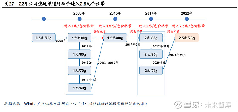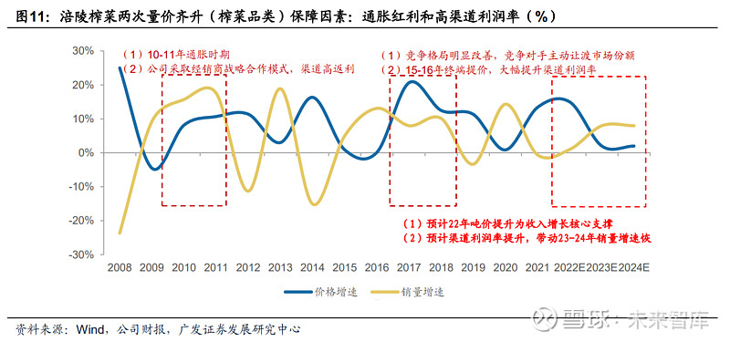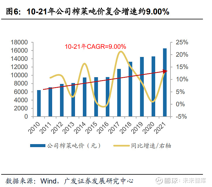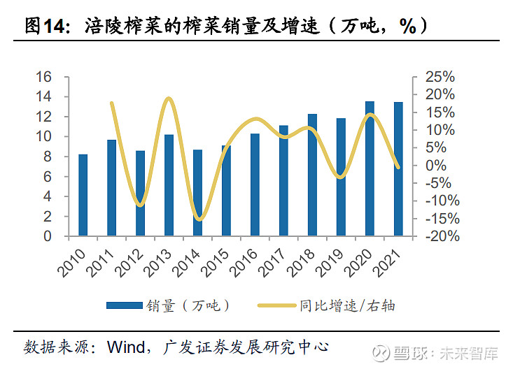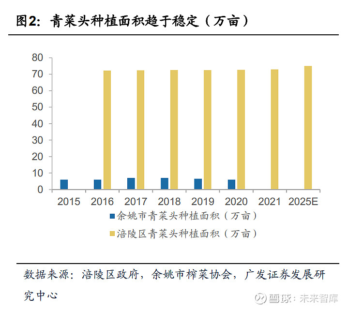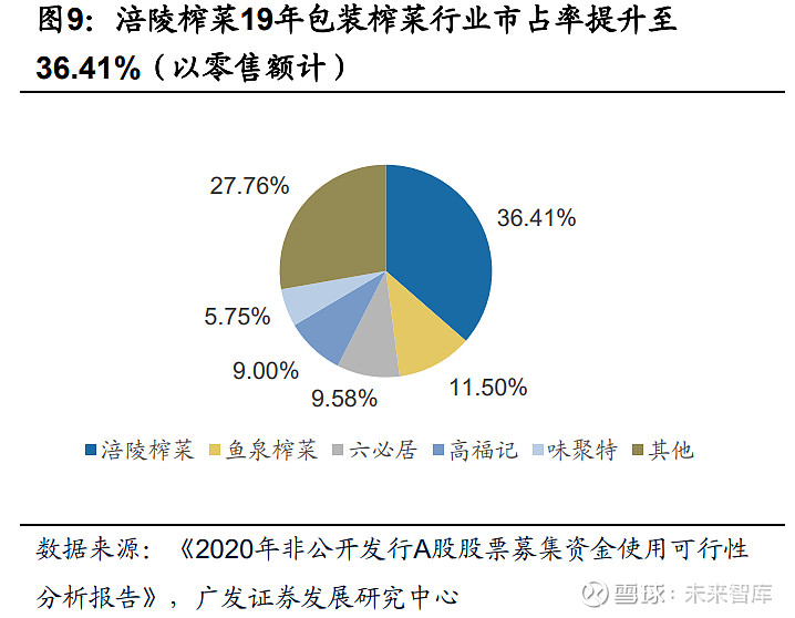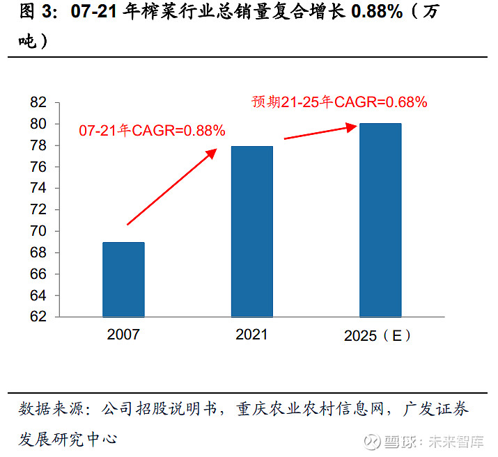 涪陵榨菜(002507):每股净资产 8.07元,每股净利润 0.87元,历史净利润年均增长 26.24%,预估未来三年净利润年均增长 23.0%,更多数据见:涪陵榨菜002507核心经营数据 涪陵榨菜的当前股价 32.5元,市盈率 38.88,未来三年的估值假设和预期收益率如下:15倍PE,预期收益率 -25.28%;20倍PE,预期收益率 -0.37%;25倍PE,预期收益率 24.53%;30倍PE,预期收益率 49.44%。 (报告出品方:广发证券) 一、榨菜行业量稳价增,龙头市占率有望提升至 50% (一)行业空间:预计 25 年榨菜行业规模约 100 亿元,复合增速 5%+ 预计25年榨菜行业规模约100亿元,复合增速5%+。榨菜原材料为青菜头,近几 年全国青菜头产量增长缓慢,种植面积限制榨菜行业的发展空间,青菜头产量增速基 本与下游榨菜行业产量增速维持一致。根据涪陵区人民政府数据,21年我国涪陵区青 菜头总产量169.90万吨,考虑到浙江余姚等地区21年明显减产,假设涪陵区青菜头产 量在全国的占比提升至48%,则推算全国青菜头产量为353.96万吨。考虑到青菜头收 购主要分为加工收购和外运鲜销两部分,近几年青菜头外运鲜销占比稳定在34%左右。 根据榨菜制作工艺,除鲜销外,青菜头制作榨菜制成率约3:1,即3吨青菜头可产成1 吨榨菜,推测21年我国榨菜行业产量为77.87万吨(目前行业以销定产,其中包装销 量占比2/3左右),根据京东数据均价信息(我们估计包装/散装吨价约1.35/0.40万元), 估算行业收入规模(出厂口径)约80亿元。我们预计未来5年榨菜行业价格复合增长 约5%,叠加销量增长,行业收入复合增长5%+,预计25年行业规模有望达到约100亿 元的水平。 量价拆分来看,我们预计25年榨菜行业产量约80万吨,销量复合增速约0.68%, 预计未来5年榨菜行业价格复合增长约5%。根据涪陵榨菜招股说明书,07年榨菜行业 总销量68.90万吨,根据我们的预测,21年榨菜行业总销量77.87万吨,即07-21年行 业销量复合增长约0.88%。同时据涪陵区政府数据,10-21年涪陵区青菜头产量复合 增速约1.41%。展望25年,我们参考涪陵区政府《涪陵榨菜产业十三五发展规划》, 预计25年青菜头种植面积稳定在75万亩,总产量为180万吨。若按照涪陵区青菜头产 量在全国占比50%的假设进行估算,我们预计25年全国可生产榨菜约80万吨,则估计 21-25年榨菜产量复合增速约0.68%,行业产量增长有限,榨菜行业整体销量保持稳 中略增的态势。 我们预计未来5年榨菜行业价格复合增长约5%。从行业采购成本端来看,20-22 年青菜头价格复合增长2.43%,从行业龙头产品出厂均价看,10-21年涪陵榨菜公司 榨菜均价复合增长9.00%。我们认为行业均价提升幅度介于二者之间:一方面成熟行 业有能力通过提价及产品升级实现成本压力覆盖;另一方面,龙头具备提价话语权, 提价幅度及力度超行业平均水平。我们根据京东数据均价信息及包装榨菜占比,估计 21年榨菜行业平均出厂吨价约1.04万元,假设25年涪陵榨菜出厂均价突破2.00万元 (CAGR约6%),同时包装榨菜占比提升至70%,综合考虑其他品牌及散装榨菜跟随 提价,预计25年榨菜行业出厂均价约1.26万元,21-25年CAGR约5.03%。 (二)竞争格局:集中度提升逻辑持续兑现,龙头市占率长期有望达 50% 1.单寡头格局稳固,龙头市占率长期有望达 50% 我们认为行业集中度仍有提升空间,主要基于以下两个方面:(1)包装榨菜持续替代散装榨菜。目前我国包装榨菜占比约2/3,较07年约1/2的水平明显走高。同时, 鉴于此前对榨菜行业生产特性的分析,产地不断集中与全国化布局的矛盾,我们认为 在一定程度上会助推产品包装化率进一步提升;(2)包装榨菜龙头有能力对其他企业产生挤压。若参考榨菜成熟市场份额(目前最成熟市场广州收入市占率50%以上), 我们预计涪陵榨菜长期有望占据榨菜行业50%的市场份额。 根据《2020年非公开发行A股股票募集资金使用可行性分析报告》披露的数据, 公司在包装榨菜行业(以零售额计)的市占率持续提升,08-19年市占率由21.28%提 升至36.41%。我们之所以认为公司有能力继续对其他企业产生挤压,主要基于以下 三个方面: (1)榨菜行业具备原材料壁垒,涪陵榨菜原料采购优势明显。青菜头产地集中且运输困难,川渝以外企业难抢占市场份额。余姚市榨菜协会及涪陵区政府数据,20- 21年余姚市青菜头种植面积及产量双双下滑,而涪陵地区20年/21年产量分别提升 0.41%/5.65%。青菜头减产叠加价格高企,浙江等地中小榨菜企业逐步退出。此外, 涪陵区青菜头采购竞争加剧,行业龙头抢占原材料能力最强,近年来涪陵区榨菜企业 数量持续缩减(07年102家,至21年缩减至41家),单寡头格局不断加固。 (2)涪陵榨菜具备明显渠道优势。涪陵榨菜渠道精细化管理程度和渠道覆盖率 均高于竞争对手。目前涪陵榨菜已经完成全国34个省市自治区、300个地市级市场以 及1000余个县级市场全覆盖,而竞争对手渠道覆盖主要集中于区域性省地级城市,如 鱼泉集中于北京、川渝,铜钱桥集中在东北市场省地级市,川南聚焦全国KA渠道。 (3)乌江为榨菜行业唯一全国性品牌,品牌力强于竞品。榨菜行业有望通过抢占酱腌菜消费实现增长,其中涪陵榨菜作为行业龙头,品类扩充以及市场份额抢占能 力最强,市占率有望进一步提升。 2.预期龙头 25 年榨菜收入市占率超 30%,量/价复合增长约 4%/6% 我们预计25年涪陵榨菜收入市占率有望超30%,21-25年榨菜收入复合增速 10.64%。由于榨菜行业数据口径较多,基于对行业我们从出厂口径的角度,按照销 售量/