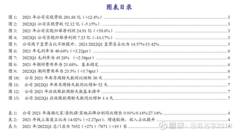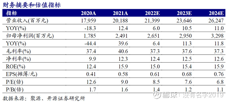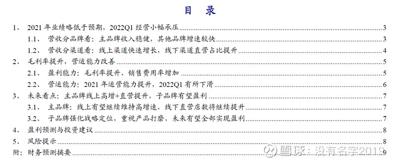 海澜之家(600398):每股净资产 3.34元,每股净利润 0.58元,历史净利润年均增长 21.85%,预估未来三年净利润年均增长 10.67%,更多数据见:海澜之家600398核心经营数据 海澜之家的当前股价 5.21元,市盈率 9.49,未来三年的估值假设和预期收益率如下:15倍PE,预期收益率 126.35%;20倍PE,预期收益率 201.79%;25倍PE,预期收益率 277.24%;30倍PE,预期收益率 352.69%。 点击关注, 可以订阅哦! 投资要点 文:开源吕明可选消费团队(纺服/家电/轻工) 疫情等因素致业绩承压,整体经营质量稳健,维持“买入”评级 2021年公司实现营收201.88亿(+12.4%),2021Q4/2022Q1营收为60.32/52.12亿元,同比分别-2.4%/-5.15%;全年归母净利润24.91亿元(+39.6%),2021Q4/2022Q1归母净利润分别为4.44亿元(-10.25%)、7.23亿元(-14.17%),主要系计提存货跌价准备。疫情致业绩承压,下调2022-2023年、新增2024年盈利预测,预计公司2022-2024年归母净利润26.5/29.5/33.0亿元(2022-2023年原值38.5/45.6亿元),EPS为0.6/0.7/0.8元,当前股价对应PE为8.5/7.6/6.8倍,我们看好主品牌线上增长+线下直营提升、子品牌之后减亏,维持“买入”评级。 主品牌收入稳健、其他品牌增速较快;线上增速较高,线下直营占比提升 (1)分品类看,2021年主品牌/圣凯诺/其他品牌(OVV、男生女生、海澜优选、英氏)收入151.33(+9.91%)/ 22.6(+9.14%)/ 20.42亿元(+27.14%),占比为77.86%(-1.06pct)/ 11.63%(-0.24pct)/ 8.78%(+1.3pct)。(2)分渠道看,2021年线上收入27.3亿元(+32.98%),占比为14.02%(+2.27pct),平台销售占比为天猫淘宝:京东:唯品会:其他=4:2:2:2;2021年线下收入为167.09亿元(+8.54%),直营/加盟收入同比增长44.39%/7.62%,占线下收入比为14.4%/85.6%;2022Q1直营/加盟收入增长99.58%/-14.86%,占线下收入比为17.6%/82.4%,直营占比提升。(3)店数:2021年总店数为7652家(+271),直营/加盟总净拓310/-39家;主品牌门店5672家(+129),直营/加盟净拓241/-1。 2021年、2022Q1毛利率均提升,营运能力改善 (1)毛利率:2021年/2022Q1毛利率为40.64%(+3.22pct)/45.26%(+2.36pct),上升主要系促销活动减少、毛利率较高的直营店有所增加。(2)费用端:2021年销售/管理/研发/财务费用率分别为16.11%/4.93%/0.62%/0.03%,分别同比+2.73/-2.04/+0.15/-0.12pct;2022Q1期间费用率为23.5%(+3.74pct),其中销售费用率为17.35%(+4.07pct),主要系直营拓店、职工薪酬增加。(3)净利率:2021年/2022Q1净利率为12.34%(+2.4pct)/13.87%(-1.46pct)。(4)存货:2021年存货为81.2亿元(+9.49%),存货周转天数为233.4天(-30天);2022Q1公司存货为85.62亿元(+17.65%),存货周转天数为263.2天(+52天),主要系疫情影响终端销售带来产品积压,但仍处于正常波动区间。(5)应收账款:2021年/2022Q1应收账款为10.23亿元(+5.17%)/10.89亿元(+0.16%),应收账款周转天数为17.8天(-0.3天)/18.23天(+1.4天),基本持平。 风险提示:疫情反复影响终端;市场竞争加剧;其他品牌进展不及预期。 1 2021年业绩略低于预期,2022Q1经营小幅承压 2021年公司实现营收201.88亿(+12.4%),归母净利润24.91亿元,同比提升39.6%,全年利润增长快于收入增长,主要系2021年疫情反复影响终端销售,加之毛利率较2020年有较大提高。 单季度来看,2021Q4/2022Q1分别实现营收60.32/52.12亿元,同比分别-2.4%/-5.15%;归母净利润分别为4.44亿元(-10.25%)、7.23亿元(-14.17%),2022Q1归母净利润同比下滑主要系营业收入减少、计提存货跌价准备、销售费用中员工薪酬增加。 1.1 营收分品牌看:主品牌收入稳健,其他品牌增速较快 2021年主品牌海澜之家实现收入151.33亿元(+9.91%),收入占比为77.86%(-1.06pct);圣凯诺:2021年实现收入22.6亿元(+9.14%),收入占比为11.63%(-0.24pct);其他品牌(OVV、男生女生、优选、英氏等)2021年实现收入20.42亿元(+27.14%),收入占比为8.78%(+1.3pct),其中OVV/优选增速约为50%/10%。 2022Q1主品牌海澜之家/圣凯诺/其他品牌收入分别为42.63(-7.28%)/3.06(-4.28%)/4.86亿元(+16.7%),收入占比为84.34%(-1.06pct)/6.05%(-0.24pct)/9.61%(+1.3pct)。其他品牌增速较快,收入占比提升。 1.2 营收分渠道看:线上渠道快速增长, 线下渠道直营占比提升 线上渠道:2021年线上增长迅速,实现收入27.3亿元(+32.98%),占比同比提升2.27pct至14.02%,公司采取“全渠道、多平台,优势互补”的线上营销策略,平台销售占比为天猫淘宝:京东:唯品会:其他=4:2:2:2。2022Q1线上收入为5.38亿元(-6.33%),剔除未做奥莱的因素影响,电商依然为增长趋势。 线下渠道:2021年线下收入为167.09亿元(+8.54%),按直营/加盟拆分线下门店收入(不含圣凯诺),直营店线下收入同比增长44.39%,占线下总收入比为14.4%;加盟店及其他在线下收入同比增长7.62%,占线下总收入比为85.6%。2022Q1线下收入为45.17亿元(-5.1%),主要系3月疫情拖累影响所致,直营/加盟收入增长99.58%/-14.86%,收入占比为17.6%/82.4%。 线下门店数量方面,截至2021年,公司总门店数7652家,较2020年初净增271家,其中海澜之家系列门店5672家(+129家),直营店净增241家,占比为12.82%(+4.05pct);其他品牌门店1980家(+142家),直营店净增69家。2022Q1总门店数为7671家,海澜之家系列门店5692家,其他品牌门店1979家。公司不断优化线下门店的渠道布局,加大购物中心门店的拓展力度。 2 毛利率提升,营运能力改善 2.1 盈利能力:毛利率提升、销售费用率增加 (1)毛利率:2021年毛利率为40.64%(+3.22pct),分季度看,2021Q4/2022Q1毛利率分别为33.01%/45.26%,分别同增0.62pct/2.36pct,毛利率上升主要系促销活动减少,且毛利率较高的直营店数有所增加。 分品牌看,圣凯诺毛利率较高。2021年海澜之家主品牌毛利率为40.01%,同比提升4.02pct,圣凯诺/其他品牌毛利率为51.57%/44.14%,同比-1.14