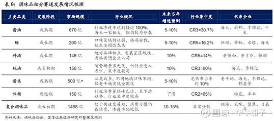 海天味业(603288):每股净资产 5.56元,每股净利润 1.58元,历史净利润年均增长 20.57%,预估未来三年净利润年均增长 15.39%,更多数据见:海天味业603288核心经营数据 海天味业的当前股价 76.34元,市盈率 54.04,未来三年的估值假设和预期收益率如下:15倍PE,预期收益率 -56.64%;20倍PE,预期收益率 -42.18%;25倍PE,预期收益率 -27.73%;30倍PE,预期收益率 -13.28%。 1.1企业信息 佛山市海天味业调味食品股份有限公司,A股简称“海天味业”,创立于1955年8月30日,注册资本421257. 617万元人民币,并于2014年2月登陆上海交易所发行A股。 2021年,毕马威华振会计师事务所(特殊普通合伙)为公司出具了:标准无保留意见的审计告。 海天是中国调味品行业的龙头企业,专业的调味品生产和营销企业,历史悠久,是中华人民共和国商务部公布的首批"中华老字号"企业之一。目前生产的产品涵盖酱油、蚝油、酱、醋、料酒、调味汁、鸡精、鸡粉、腐乳、火锅底料等几大系列百余品种400多规格,年产值过两百亿元。 海天酱油产销量连续二十四年稳居全国第一,并遥遥领先。2018年,Kantar发布的《2018年全球品牌足迹报告》中国榜单,海天味业以5. 2亿消费者,73. 3%的渗透率,位列中国快速消费品品牌第4位,是榜单前10名中唯一的调味品企业,在中国调味品快消市场持续保持领头羊位置。2019年,海天品牌荣登中国品牌强国盛典榜样100品牌榜单,品牌价值212. 94亿元。在凯度消费者指数2019亚洲品牌足迹报告中,海天味业荣登中国快速消费品品牌第4位。2020年,品牌评级权威机构Chnbrand发布的第十届中国品牌力指数(C-BPI)品牌排名和分析报告中,海天在调味品行业领域勇夺“四冠”,分别获得2020C-BPI酱油、蚝油、酱料、食醋行业第一品牌。 2021年3月,海天公司被中国质量检验协会评为“全国产品和服务质量诚信示范企业”,2021年4月海天再次获得2021C-BPI酱油、蚝油、料、食醋行业第一品牌,2021年6月,凯度消费者指数《2021年亚洲品牌足迹报告》发布,海天味业以6. 2亿消费者触及数、79. 4%的渗透率,入选中国消费者十大首选品牌榜单。 1.2行业规模和发展阶段 1.2.1行业规模 海天调味主营业务为调味品的生产与销售,中国调味品行业的"油、盐、酱、醋等"是老百姓"衣食住行”中最基本的刚性需求,餐饮行业的发展,食品加工业的发展以及消费升级,成为了推动行业发展的主要因素,随着调味品企业的技术升级和创新,调味品越来越多的满足消费者的烹饪需求,调味品成为了老百姓日常餐饮的不可或缺的重要部分。 目前我国调味品市场规模超4900亿元,过去5年CAGR为8. 5%.目前调味品行业内缺少关于市场规模的官方数据,调味品协会统计口径不完整且缺少近年的数据,第三方欧睿仅是统计了零售端的市场规模且没有充分考虑由城市化率提升所贡献的增量。通过选取数据更连续的欧睿数据作为其础、并将欧睿数据进行城镇化和全口径调整,通过将欧睿数据进行调整,测算出2020年我国调味品市场规模为49295亿元,同比+5. 4%过去5年CAGR为85%行业依旧保持快速增长趋势。 资料来源:wind 国信证券经济研究所《厚积薄发铸平台,行稳致远稳成长》 根据中国调味品协会数据显示,我国调味品产量由2016年926. 2万吨增至2019年1428.9万吨,年均复合增长率为15. 5%.中国产业研究院预测,2021年我国调味品产量可达1785. 4万吨。 根据中国调味品协会的统计数据显示,2020年调味品行业的营业收入就已超过3950亿元,调味品行业品种丰富,种类繁多,需求旺盛,调味品行业发展稳定而繁荣。 资料来源:行行查《调味品专题分析报告》国金证券研究所 2019年,Euromonitor研究数据显示,海内外调味品行业规模超过10000亿元,预计至2022年,调味品行业总规模将突破15000亿大关。 资料来源:行行查《食品饮料行业2020年中期策略》华创证券 1、酱油市场 资料来源:国信证券《厚积薄发铸平台,行稳致远稳成长》 酱油目前是调味品行业最大的细分领域。酱油作为众多菜系必不可少的调味品。在烹调时可起到定味、增鲜、增香、上色、复合、去腥解腻等作用。目前酱油行业市场规模接近900亿元,过去5年CAGR为8. 3%.2012年开始至今,随着渗透率逐渐上升至接近100%,酱油行业逐渐告别高速增长阶段,产量增速降低至个位数,行业已步入产品结构升级和高端化的阶段。 2、耗油市场 蚝油景气度高,正处于渗透率快速提升的阶段。蚝油起源于广东,是用牡蛎熬制而成的调味料,具有味道鲜美、蚝香浓郁,黏稠适度,营养价值高等特点,目前已进入快速扩容阶段,未来有望成为酱油之后的另一大单品。根据国信证券研究所的测算,2020年蚝油市场规模为150. 9亿元(对应出厂口径为104. 3亿元),过去5年CAGR为8. 3%.目前蚝油品类渗透率仍然不高,未来随着渗透率持续提升,预计未来5年仍将保持接近双位数增长。 3、食醋市场 根据中国产业信息网数据,2013年至今、食醋行业量价齐升,目前食醋行业市场规模约为200亿元,2013-2020年CAGR为72%.根据前瞻研究院的数据、2019年我国人均食醋消费量为3. 6千克1年,仅为美国的55%,日本的46%,由于食醋具备健康属性,预计未来食醋行业量价仍有提升空间,我们认为未来五年食醋行业市场规模将保持高个位数的复合增长率。 1.2.2行业发展阶段 我国调味品行业经历三大周期: 快速扩容期(2002-2011):标准化调味品的渗透率提升打开调味品行业快速放量"黄金十年",餐饮行业的繁荣则同步对25%的行业CAG
