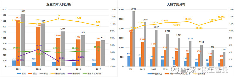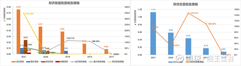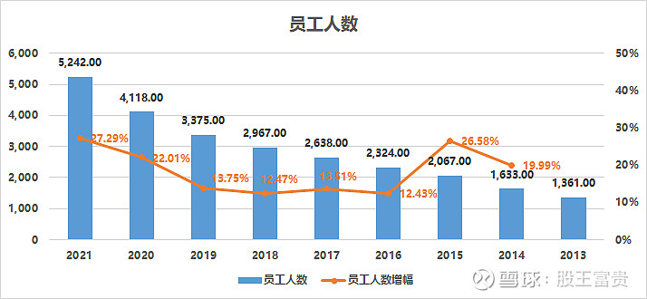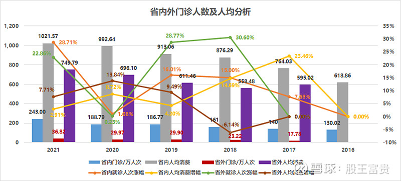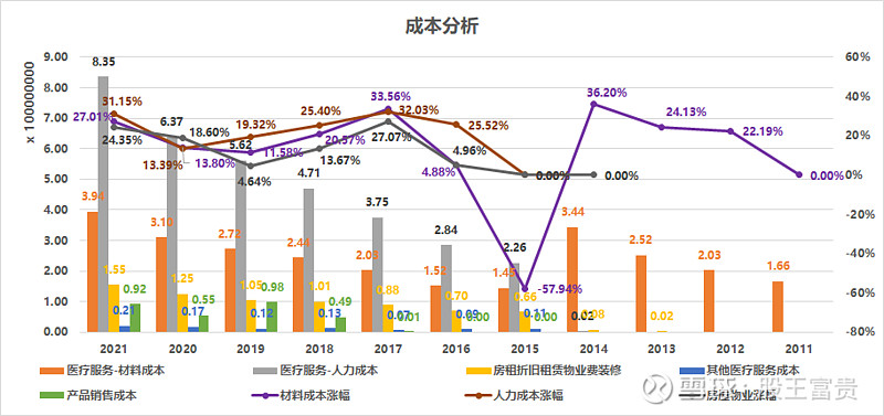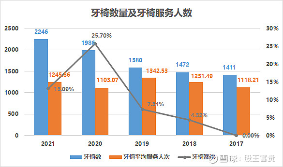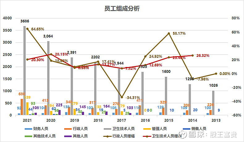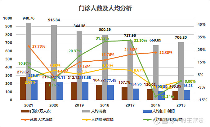 通策医疗(600763):每股净资产 8.98元,每股净利润 2.19元,历史净利润年均增长 39.81%,预估未来三年净利润年均增长 24.53%,更多数据见:通策医疗600763核心经营数据 通策医疗的当前股价 125.4元,市盈率 57.04,未来三年的估值假设和预期收益率如下:15倍PE,预期收益率 -49.41%;20倍PE,预期收益率 -32.55%;25倍PE,预期收益率 -15.68%;30倍PE,预期收益率 1.18%。 $通策医疗(SH600763)$ 富贵本来计划五一放假期间好好写写牙科的年报的,结果放假一直加班,基础数据和脚本还在更新,所以并没有完成分析报告的编写,数据已经基本更新的差不多了,现在动笔。争取这几天全部写完。如想看前面的请跳转(2021年报分析1,2021年报分析2,2021年报分析3) 【五】成本分析 1.医疗服务成本分析 医疗服务成本包括材料成本、人力成本、房租物业装修折旧这几大部分,在2015年之前财报是不披露材料和人力的细项,富贵都纳入材料成本中。 材料成本:2021年材料成本3.94亿,同比2020年(3.1亿)增幅27%,或增加8400万,材料费占总成本的26.29%,符合口腔业务的特点。 人力成本:2021年人力成本8.35亿,同比2020年(6.37亿)增幅31.15%,或增加1.98亿,人力成本占总成本的55.76%,也符合口腔业务的特点,从材料成本和人力成本看出,医疗服务的成本就是材料费和人工费,基本占比80%左右。人力成本增幅这么大,也和2021年扩张人员有很大关系。回头结合员工数量变化一同更新。 房租折旧物业装修:2021年房租装修折旧成本1.55亿,同比2020年(1.25亿)增幅24.35%,或增加3000万,占总成本的10.6%。 其他医疗成本:总体比例不多,2021年2100万,同比2020年增加500万。详细数据如下图所示。 2.三费分析 销售费:2021年销售费2400万,同比2020年(1700万)增加700万,同比增幅40.36%,主要系本期宁口总院 搬迁开业和存量医院增加口腔保健宣传投入以及新建医院前期普所致; 占营收比在1%以下,整体消费费用比例控制相对较好。从解释上宁口又增加了广告费拖了上市公司后腿。主要是广告费和宣传费。 管理费:2021年管理费2.59亿,同比2020年(2.3亿)同比增幅12.45%,或者增加2900万,主要系本期随新建医院增加、老业务规 模增长而加管理人员,以及日常行政管理开支增加所致。占营收比在2021年下降到10%以内。其中薪资1.52亿,将近59%占比,折旧与摊销2900万,办公经费5300万,差旅440万,中介510万,业务招待费 460万,其他900万,从当年数据看,重要的还是经营场所和人力的成本。 财务费:2021年财务费2300万,同比2020年(1500万)增幅51.18%,或增加800万,主要系本期首次执行新租赁准则,租赁负债利息费用增加所致。其中利息费用2800万,这里面租赁负债的利息就有1600万,实际资金使用的利息只有1200万。手续费支出500万,利息收入抵扣了1100万。该部分费用一直都很稳定,说明公司不需要大额借贷或者有大额长期负债。 研发费:2021年研发费用5900万,同比2020年(4000万)增幅47.59%,或增加1900万,47.59%,主要系本期加大研发投入所致。其中职工薪酬3800万,材料费1700万,折旧240万,其他34万。说明研发费用大头还是研发人员的工资。看近几年的势头研发费用增幅缓慢爬升,研发费用还会大幅增加。详细数据如下图所示。 【六】服务人次及人均分析 门诊量:2021年门诊人数279.82万人次,同比2020年(219.07万)增幅27.73%,或者增加60万人次,服务人次多并没有转化为营收或者高营收,也许是一个工序来的次数比以前多了。 人均消费:人均消费940.76元,同比2020年(916.84元)增幅2.6%,只多了20几块钱人均,不知道是到了瓶颈,还是受疫情影响。看后续能否突破人均1000的平台。 人均扣非利润:人均扣非利润239.81元,同比2020年(216.11元)增幅10.97%,或者增加23.7元。人均还有提升空间。详细数据如下图所示。 省内门诊:2021年省内门诊人数243万人次,同比2020年(188.79万人次)增幅28.71%,或增加58万人次。省内规模什么时候有500万人次了,市占率估计也就上来了。 省外门诊:2021年省外门诊人数36.82万人次,同比2020年(29.97万人次)增幅22.86%,或增加6.8万人次。省外规模依旧很小,有很大发展空间,前提是分院或者布点合理。 省内人均消费:2021年省内人均消费1021.57元,首次突破1000元大关,同比2020年(992.64元)增幅2.91%,基本持平。 省外人均消费:2021年省外人均消费749.79元,同比2020年(696.1元)增幅7.71%,省外人均消费和省内依然有将近250块钱的差额,省外还是要提高高净值项目的营收占比。详细数据如下图所示。 【七】牙椅 牙椅数:2021年牙椅2246张,同比2020年(1986张)增幅13.09%,或增加260张。牙椅的增速比预期下滑的比较多,牙椅是非线性发展的,开新的分院会有节奏型,需要每隔半年观察一下。 人均服务人次:牙椅人均服务人次1245.86人次,同比2020年(1103.07人次)增加142人次。详细数据如下图所示。 牙椅产能:2021年牙椅平均产能是117.2万元,同比2020年(101.13万)增幅15.89%,刚恢复到2019年的水平,产能距离200万还有非常大的空间,现在需要提高新开分院或者运营周期短的分院的牙椅产能。 【八】人员分析 2021年员工人数5242人,同比2020年(4118人)增幅27.29%,或增加1124人,增幅达历史新高,人力和薪酬成本的确是和人工数量增幅匹配的。详细数据如下图所示。 公司人员包括财务人员、行政人员、卫生技术人员、管理人员、销售人员、其他人员。 卫生技术人员:占比最高,2021年3686人,同比2020年(3064人)增幅20.%,或新增622人。 行政人员:2021年680人,同比2020年(413人)增幅64.65%,或增加267人,是同比例中增