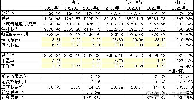 招商银行(600036):每股净资产 29.01元,每股净利润 4.61元,历史净利润年均增长 24.1%,预估未来三年净利润年均增长 15.47%,更多数据见:招商银行600036核心经营数据 招商银行的当前股价 37.03元,市盈率 7.54,未来三年的估值假设和预期收益率如下:15倍PE,预期收益率 187.5%;20倍PE,预期收益率 283.34%;25倍PE,预期收益率 379.17%;30倍PE,预期收益率 475.01%。 兴业银行(601166):每股净资产 28.8元,每股净利润 3.77元,历史净利润年均增长 24.55%,预估未来三年净利润年均增长 14.77%,更多数据见:兴业银行601166核心经营数据 兴业银行的当前股价 19.66元,市盈率 4.73,未来三年的估值假设和预期收益率如下:15倍PE,预期收益率 334.84%;20倍PE,预期收益率 479.79%;25倍PE,预期收益率 624.74%;30倍PE,预期收益率 769.69%。 中远海控VS兴业银行 结论一,从眼前的时间维度来说投资中远海控好于兴业银行。 结论二,从更长的时间维度来说投资兴业银行好于中远海控。 中远海控与兴业银行都是雪球网的热门股,中远海控有78万球友关注,兴业银行有97万球友关注。中远海控与兴业银行目前都属于价值低估,按目前的市场价,到底是买进兴业银行划算,还是买入海控投资价值更高,市场估值更便宜,未来长期投资收益更高呢? 带着这个问题,就有了把两家报表数据进行比较,看看这两家究竟哪个更好?中远海控是我目前持有的股票。中远海控全称中远海运控股股份有限公司,于2007年6月26日在上交所主板A股上市,从去年中报开始关注中远海控,9月底开始操作。目前持有较重仓位为第三。2022年一季末总股本160.14亿股,一季末股东权益1603.89亿元。兴业银行从2015年11月开始到2019年8月操作过并取得6位数的盈利。兴业银行成立于1988年4月11日,2007年2月5日在上交所主板A股上市,2022年一季末总股本207.74亿股,一季末归属于普通股的净资产6250.95亿元。 说来也巧,这两者国内上市的时间差不多,都在大牛市的2007年;中远海控上市之初股本总额71.35亿股;目前160.14亿股,股本扩张2.24倍;上市第一年开盘价15.52元即为最低价,最高冲到68.4元,收盘42.66元。兴业银行上市之初股本总额50亿股;目前207.74亿股,股本扩张4.15倍;上市第一年开盘价24.8元,最高冲到70.5元,收盘51.86元。 直接上数据对比 备注1:上表中数据采用2022年E数据,是我自己测算的数据,依据根据一季度数据进行的演算结果,如果觉得不对,那就一笑了之。 备注2:上表中的前复权价,采用的是行情系统中的前复权价,由于系统计算前复权价的公式是在历史成本或者说历史股价中直接扣除历年分红,所以按前复权价计算的投资收益率有所失真,所采用的是通达信里的数据。当前价取5月11日的收盘价。 在上表中,我把中远海控的相关数据设定为100%的基准点进行比较,兴业银行总股本207.74亿股,是中远海控160.14亿股的130%;总资产98935亿元,是中远海控5596亿元的1768%;兴业归属普通股净资产6854亿元,是中远海控净资产2437亿元的281%;营业收入兴业银行2337亿元,是中远海控4147亿元的56%;净利润870亿元,是中远海控1090亿元的80%;兴业总市值4109亿元,是中远海控2266亿元的181%;动态市盈率4.72倍,是中远海控2.08倍的227%;市净率0.6倍,是中远海控0.93倍的64%。 从以上数据对比中我们可以发现,在不考虑市场估值差异或者说市场偏好的情况下,按测算2022年的经营业绩,眼前中远海控的市场估值更低或者说价格更便宜,意味着中远海控更具备投资价值,意味着投资中远海控的投资收益更高。 从上表中前复权历史价格可以看见,中远海控从最高价下跌73%,从最低价上涨587%,波动幅度大于上证指数,意味着中远海控不仅业绩波动大,市场价格的波动也大,这就是市场称之为周期王的内在逻辑。 兴业银行从历史最高价下跌27%,由于高分红的优势前复权最低价只有0.63元,从最低价上涨3039%,2021年一度还创历史新高,其下跌幅度小于上证指数,上涨幅度远大于上证指数,显示出长期投资于兴业银行的投资优势。 从以上对比,得出结论一,从眼前的来说投资中远海控好于兴业银行。 结论二,从长期时间维度来说兴业银行好于中远海控。 作者:千秋雪原文链接:https://xueqiu.com/5707193182/219681168 转载请注明:www.51xianjinliu.com » 中远海控VS兴业银行 喜欢 (0)or分享 (0)