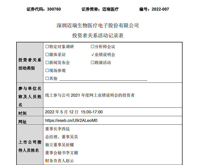 迈瑞医疗(300760):每股净资产 22.17元,每股净利润 6.59元,历史净利润年均增长 28.81%,预估未来三年净利润年均增长 21.45%,更多数据见:迈瑞医疗300760核心经营数据 迈瑞医疗的当前股价 305.71元,市盈率 44.17,未来三年的估值假设和预期收益率如下:15倍PE,预期收益率 -42.1%;20倍PE,预期收益率 -22.81%;25倍PE,预期收益率 -3.51%;30倍PE,预期收益率 15.79%。 2022 年 5 月 12 日,公司就 2021 年年度业绩和经营情况的相关问题与投资者进行了沟通与交流,并对投资者关注的问题进行了回答,要点问题摘录如下,详细问答记录请参见会议网址。 问: 迈瑞在研发上给人的感觉是比较稳健的,迈瑞从过去的追随者到引领者,对研发的要求是不一样的,想问下公司研发的思路是否有一些转变,公司现阶段是否会更加愿意冒险、更加愿意挑战新的东西? 答: 随着过去几年在高端技术领域上的突破,迈瑞已经基本完成了从跟随者到挑战者的身份转变。部分产品如监护仪、麻醉机、血球已经步入引领者阶段,这意味着进口品牌在这些领域的灯塔效应已经完全消失,迈瑞要开始主导下一代产品的研发方向,探索技术无人区,挖掘临床上还未被满足的需求,这对公司的研发团队而言是一个更加大的考验。 自从公司 2011 年研发变革以来,公司已经搭建了一套成熟的、以临床需求为导向的研发体系,在临床需求端具备更敏锐嗅觉的同时,着力开展并行工程,从原材料、制造、售后等多方面考虑产品研发,使得迈瑞过去几年推出的新品在销售端均成为爆品。 医疗器械的创新研发和其他行业很不一样,即使创造出了新的技术路径,首先技术需要成熟、原理清晰,其次在全球顶级专家认可、临床验证、产品注册等环节中仍需要经历非常漫长且复杂的过程。例如公司的除颤仪从研发到上市共经历了十年时间,由于国内之前并没有相关产品的准入标准,因此我们协助国家局专家一起建立除颤仪的认证标准,历时五年时间才完成了产品注册。 因此,医疗器械很难冒进。我们稳扎稳打,是对生命的尊重和负责,我们稳健,但不是保守,我们研发投入比例全球靠前。更重要的是,医疗器械从低端到高端的技术突破是一个逐步积累的过程,不存在弯道超车的现象,因此更加需要公司在研发上踏踏实实地做好每一步。 随着全面开始向引领者身份的转变,公司也将进一步优化研发体系,完善研发的绩效考核机制,保障优秀研发人才的晋升通道,鼓励成熟产品在新一代技术领域的研发探索,给公司未来的增长注入源源不断的活力。 问: 请问公司医学影像产品在国内市占率情况?高端超声与进口品牌/国内竞品相比有何优势? 答: 公司拥有超过 20 年的超声研发经验,并始终专注于该领域的技术创新和高端突破。例如,公司去年推出的 Resona R9 高端超声突破了传统超声波束合成在成像空间分辨力和时间分辨力的技术限制,拥有更快的成像速度,更高分辨力的整场图像,借助超宽带非线性造影成像、微血管造影增强技术和高帧频造影技术,公司超声产品可以为临床带来更清晰的造影成像以及更精准的影像诊断。2021 年,公司的超声业务首次超越进口品牌成为国内第二,并且二、三级医院占国内超声收入的比重也在连年提升。未来,公司将通过对超高端超声领域的技术积累,实现高端客户群的全面突破,加速市场份额的提升。 问: 请问公司 2022 年生命信息与支持产线的营收和利润增速预期多少? 答: 随着医疗新基建的深入开展,相关项目开始从北上广深等大城市向其他城市渗透、从三级医院向二级医院推进。今年以来部分地区严峻的疫情局势不仅没有对整体新基建的推进速度造成影响,反而更加坚定了医疗新基建的投入决心。剔除一季度已执行的商机,截至一季度末,系统中的医疗新基建待执行商机仍有 240 亿元,预计将在未来两年时间左右逐步落地。 迈瑞强大的产品实力、完善的全院级整体解决方案和“三瑞”生态系统更加适合医疗新基建的需要,也能更好地支持智慧医院的建设,今年预计实现的医疗新基建收入将远超去年,其中对生命信息与支持产线的拉动尤为显著,这将成为该产线今年重要的增长动力。同时,海外常规业务的完全复苏,以及 AED、微创外科等种子业务的超高速增长也将给该产线的增长带来贡献。 问:请问公司最大的短板是什么? 答: 截止 2021 年底,迈瑞医疗拥有研发人员 3492 人,占比 23.78%,分布于全球十大研发中心——深圳、武汉、南京、北京、西安、成都、美国硅谷、美国新泽西、美国西雅图和欧洲。目前,迈瑞已经实现了覆盖高中低端、整体化、智能化的解决方案,正式向行业“引领者”迈进,遍布全球的十大研发中心正在带领迈瑞和中国医疗器械行业进入研发深水区。 因此,人才问题始终是公司面临的重要问题,我们必须把很多的精力和资源投入到人才引进和培养上,这也是迈瑞 31 年发展历程中始终重视的课题。 一方面,通过广泛吸引人才,从国际上引入一批有从业经验的高端人才,这对提高产品的性能和质量会起到非常大的作用; 另一方面,通过从高校招募高素质技能型人才,在企业内部培养自己的人才。 问: 请问今年一季度海外销售增长缓慢是什么原因?后续会有改善吗? 答: 在 2021 年一季度因部分发展中国家疫情爆发和欧洲医疗补短板而增长 38%的高基数基础上,2022 年一季度国际市场仍实现高个位数增长。 其中主要得益于国