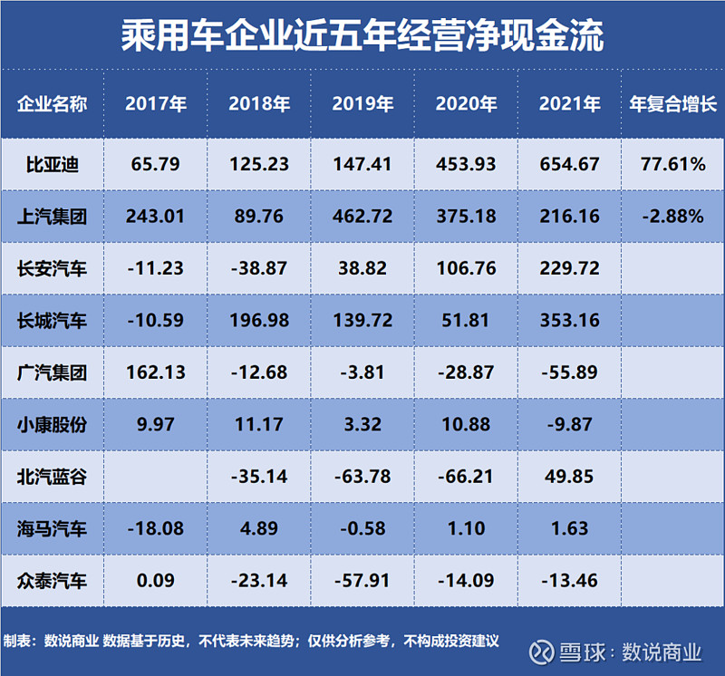 上汽集团(600104):每股净资产 23.43元,每股净利润 2.12元,历史净利润年均增长 21.38%,预估未来三年净利润年均增长 9.3%,更多数据见:上汽集团600104核心经营数据 上汽集团的当前股价 15.8元,市盈率 7.96,未来三年的估值假设和预期收益率如下:15倍PE,预期收益率 162.8%;20倍PE,预期收益率 250.4%;25倍PE,预期收益率 338.01%;30倍PE,预期收益率 425.61%。 本文为企业价值系列之一【成长能力】篇,共选取9家乘用车企业作为研究样本,并以2017-2021年经营数据作为参考。 成长能力评价指标有营收复合增长、净利润复合增长、扣非净利润复合增长,以及经营净现金流复合增长。数据基于历史,不代表未来趋势;仅供静态分析,不构成投资建议。 从近五年营收复合增长来看,比亚迪、长城汽车、长安汽车、广汽集团等4家企业实现正增长,其中比亚迪复合增长19.52%。 比亚迪主要从事包含新能源汽车及传统燃油汽车在内的汽车业务、手机部件及组装业务、二次充电电池及光伏业务,并积极拓展城市轨道交通业务领域。 汽车、汽车相关产品及其他产品为最主要收入来源,收入占比52.04%,毛利率17.39%;手机部件、组装及其他产品收入占比达到40%。 从近五年净利润复合增长来看,长城汽车唯一实现正增长,复合增长7.55%。 长城汽车是中国最大的SUV和皮卡制造企业之一。 销售汽车为最主要收入来源,收入占比88.93%,毛利率14.89%。 从近五年扣非净利润复合增长来看,长城汽车、广汽集团、上汽集团、比亚迪等4家企业没有出现亏损,其中广汽集团复合增长-12.70%。 广汽集团涵盖上游的汽车研发、零部件以及下游的汽车商贸、汽车金融、移动出行的产业链闭环, 是国内产业链最为完整、产业布局最为优化的汽车集团之一。 乘用车为最主要收入来源,收入占比61.65%,毛利率3.73%;汽车相关业务收入占比达到35%。 从近五年经营净现金流复合增长来看,比亚迪、上汽集团等2家企业现金流没有出现负值,其中比亚迪复合增长77.61%。 长安汽车主营业务是整车(含乘用车、商用车)的研发、制造和销售以及发动机的研发、生产。 销售商品为最主要收入来源,收入占比94.39%,毛利率15.45%. 乘用车企业成长能力 作者:数说商业原文链接:https://xueqiu.com/2715675448/219948069 转载请注明:www.51xianjinliu.com » 比亚迪长城汽车上汽集团谁是成长能力最强的乘用车企业 喜欢 (0)or分享 (0)
