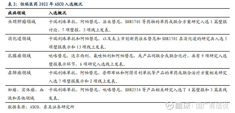 恒瑞医药(600276):每股净资产 5.47元,每股净利润 0.71元,历史净利润年均增长 23.13%,预估未来三年净利润年均增长 11.79%,更多数据见:恒瑞医药600276核心经营数据 恒瑞医药的当前股价 30.03元,市盈率 44.86,未来三年的估值假设和预期收益率如下:15倍PE,预期收益率 -50.45%;20倍PE,预期收益率 -33.94%;25倍PE,预期收益率 -17.42%;30倍PE,预期收益率 -0.91%。 恒瑞医药(600276):每股净资产 5.47元,每股净利润 0.71元,历史净利润年均增长 23.13%,预估未来三年净利润年均增长 11.79%,更多数据见:恒瑞医药600276核心经营数据 恒瑞医药的当前股价 30.03元,市盈率 44.86,未来三年的估值假设和预期收益率如下:15倍PE,预期收益率 -50.45%;20倍PE,预期收益率 -33.94%;25倍PE,预期收益率 -17.42%;30倍PE,预期收益率 -0.91%。 点击蓝字 关注我们 投资要点 事件:2022年美国临床肿瘤学会(ASCO)年会,于芝加哥当地时间6月3日开幕。恒瑞医药连续12年有研究入选ASCO年会,2022年ASCO共有63项研究入选,包括2项口头报告、1项壁报讨论、34项壁报和27项线上发表,涉及卡瑞利珠单抗、阿帕替尼片、吡咯替尼、达尔西利片、氟唑帕利,阿得贝利单抗、普那布林、法米替尼、SHR3680(ARi)、SHR-1701(PD-L1/TGF-βRII双抗)、SHR2554(EZH2i)等药物。 二代AR拮抗剂闪耀ASCO舞台,CHART研究绽放中国原创风采。CHART研究是一项国际多中心、随机对照、开放的Ⅲ期临床试验,在全球范围内共有72家参研中心,包括22家欧洲中心以及50家国内中心,旨在探索新型二代AR拮抗剂瑞维鲁胺联合ADT治疗高瘤负荷转移性激素敏感性前列腺癌患者的疗效与安全性。CHART研究纳入654例mHSPC患者,随机分组(1:1)接受ADT+SHR3680 (240 mg/d,n=326) 或 比卡鲁胺(Bica) (50 mg/d,n=328)治疗,主要终点由独立评审委员会(IRC)评估的影像学无进展生存期(rPFS)和总生存期(OS)。截至2021年5月16日,SHR3680组的中位随访时间为22.1个月,Bica组为20.4个月。与Bica相比,SHR3680显著降低了影像学进展或死亡的风险 (mrPFS为未达到vs 25.1个月),SHR3680组OS数据不成熟,所有次要疗效终点均显示SHR3680治疗更有效。安全性方面,SHR3680和Bica组分别有19.2%和13.9%的患者发生≥3级治疗相关不良事件,各组间任何级别、任何原因的不良事件发生频率相似。 “双艾“组合在黑色素瘤领域取得重要进展:在黑色素瘤领域,恒瑞医药的卡瑞利珠单抗联合阿帕替尼(“双艾”组合)联合注射用替莫唑胺方案(CAM/APA/TMZ)一线治疗晚期肢端黑色素瘤的单中心、单臂Ⅱ期研究(NCT04397770),获选口头报告。结果显示,CAM/APA/TMZ方案治疗肢端黑色素瘤,客观缓解率(ORR)为64.6%,疾病控制率(DCR)为95.8%,6个月和12个月的中位无进展生存(PFS)率分别为81.7%和62.9%,12个月总生存(OS)率为82.3%,“双艾”联合注射用替莫唑胺可以为肢端黑色素瘤患者带来生存获益。 盈利预测与投资评级:我们预计2022-2024年的归母净利润为50.96亿元、60.52亿元、71.33亿元,当前市值对应2022-2024年PE分别为37、31、27倍。恒瑞医药创新实力强劲,250+创新药管线,10个创新药已上市,中期期待“创新药+首仿/高端制剂+国际化”的兑现,维持“买入”评级。 风险提示:药品价格下降的风险,新冠疫情的风险,竞争恶化的风险 2022年ASCO开幕,恒瑞医药2项口头报告、1项壁报讨论等63项入选。2022年美国临床肿瘤学会(ASCO)年会于芝加哥时间6月3日开幕,恒瑞医药共有63项研究入选,包括2项口头报告、1项壁报讨论、34项壁报和27项线上发表。其中,SHR3680的CHART研究入选口头报告(abstact#:5005),双艾在黑色瘤和头颈癌领域分别入选口头报告(abstact#:9508)和壁报讨论(Abstract #: 6012; Poster #: 4) SHR3680(瑞维鲁胺)可大幅降低高瘤负荷转移性激素敏感性前列腺癌患者的影像学进展或死亡风险。CHART(NCT03520478)是一项随机、开放标签的3期临床研究,旨在探索新型二代AR拮抗剂瑞维鲁胺联合ADT治疗高瘤负荷转移性激素敏感性前列腺癌患者的疗效与安全性。截至2021年5月16日,结果显示SHR3680显著降低了影像学进展或死亡的风险(mrPFS为未达到vs 25.1个月)。 5款已上市产品+6款未上市产品大放异彩。2022年ASCO涉及的抗肿瘤药包括5款已上市创新产品:注射用卡瑞利珠单抗(艾瑞卡®)、甲磺酸阿帕替尼片(艾坦®)、马来酸吡咯替尼片(艾瑞妮®)、羟乙磺酸达尔西利片(艾瑞康®)、氟唑帕利胶囊(艾瑞颐®),以及6款未上市创新产品:雄激素受体拮抗剂SHR3680、人源化抗PD-L1抗体阿得贝利单抗(SHR-1316)、微管蛋白抑制剂普那布林、多靶点受体酪氨酸激酶抑制剂法米替尼、抗PD-L1/TGF-βRII双抗SHR-1701、组蛋白甲基转移酶EZH2抑制剂SHR2554等。研究成果涵盖泌尿肿瘤、黑色素瘤、头颈肿瘤、消化道肿瘤、乳腺癌、肺癌、妇科肿瘤和血液肿瘤等8个肿瘤治疗领域。 免责声明: 本公众订阅号(微信号:swsc_bm,国广有话说)由东吴证券研究所朱国广团队设立,系本研究团队研究成果发布的唯一订阅号。 本公众号所载的信息仅面向专业投资机构,仅供在新媒体背景下研究观点的及时交流。 本订阅号不是东吴证券研究所朱国广团队研究报告的发布平台,所载内容均来自于东吴证券研究所已正式发布的研究报告或对已发布报告进行的跟踪与解读,如需了解详细的报告内容或研究信息,请具体参见东吴证券研究所已发布的完整报告。 本订阅号所载内容不构成对具体证券在具体价位、具体时点、具体市场表现的判断或投资建议,不能够等同于指导具体投资的操作性意见。本订阅号所载内容仅供参