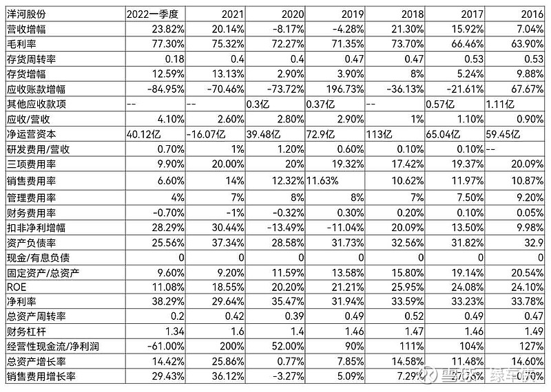 洋河股份(002304):每股净资产 28.19元,每股净利润 5.01元,历史净利润年均增长 38.98%,预估未来三年净利润年均增长 22.64%,更多数据见:洋河股份002304核心经营数据 洋河股份的当前股价 160.2元,市盈率 27.97,未来三年的估值假设和预期收益率如下:15倍PE,预期收益率 -13.4%;20倍PE,预期收益率 15.47%;25倍PE,预期收益率 44.33%;30倍PE,预期收益率 73.2%。 一.基本情况和生意特征。 1.生意特征。 1.这个公司应收账款历年来占营收都非常低,说明这个公司销售环节的现金含量高,也说明了公司的产品供不应求。 2.公司的净运营资本历年来看都很高,这个数字越大说明公司在日常运营环节需要动用自己的钱就就会越多,也说明公司在产业链中处于劣势位置,主要原因是公司的存货太高了,会影响公司的经营性现金流。后续需要看看公司的存货到底是什么,会不会有减值的风险。 3.从上述两点综合来看,公司的销售环节现金含量高,日常运营环节现金含量低,然后公司的经营性现金流净额历年占比同期净利润占比却较高,也仅仅是今年一季度的和2020年占比较低,其中今年一季度经营性现金流负增长主要是2021年提前把钱收了,因为2021年经营性现金流净额占到利润的200%。其实2020年的情况也是提前把钱收了,因为2019年公司营收也才231亿,然而公司销售商品、提供劳务收到的现金却是281亿,多了50亿的预收账款。所以总体来说这个公司利润含金量较高。 3.公司的固定资产呈现出趋势性下降,资产变得越来越轻了。今年一季度固定资产占用资产也才9.6%,公司的研发费用占营收极低,说明公司的竞争点并不是研发。基本这个生意可以排除是医药行业了,因为医药的竞争点就在研发。所以总体来说公司自由现金流较好,基本上每年赚的都是真金白银,而且还不需要什么资本投入来维持当前的盈利水平低边际扩张成本。 4.公司的roe长期都保持在15%以上,其中净利率长期保持在30%左右,说明了这个行业容易形成差异化壁垒,公司也有稳定的竞争优势,能做出差异化的产品,属于高净利率低周转率的生意模式,赚钱比较轻松,关键是未来净利率会不会被竞争侵蚀。 5.公司的营收增幅在2019年和2020年都下滑了,而同期的销售费用却在增长。说明公司出货压力较高。公司的毛利率呈现出上升趋势,公司毛利率从2016年的63.9%增长到2021年的75.32%,说明公司产品竞争力越来越高了。 6.公司的三项费用率长期在20%左右,费用结构是高销售费用率低管理费用率,似乎说明其产品的销售依赖于大规模的营销活动和复杂的销售网络,一般来说它意味着这种产品距离终端消费者是比较近的。靠销售渠道驱动,往往说明公司的渠道和品牌壁垒高,产品更新换代的压力小。财务费用率是负数,说明公司帐上现金多。 7.公司负债率不高,几乎有息负债约等于零。 8.目前来看这个公司的生意特征呈现出自由现金流好、低负债率、低边际扩张成本、高差异化壁垒。 公司的存货到底有什么?会不会有减值风险? 根据2021年公司年报 其中存货由半成品、库存商品、在产品和原材料构成,其中半成品是基酒,存放时间越越长不仅不会减值还会增值,所以存货并不会占用公司的日常运营环节的现金流,也就解释了公司自由现金流好的原因了。所以我又修正了公司的净运营资本,减去130亿半成品基酒。 得到净运营资本基本上都是负数,基本上都是预收账款和应付账款。预收账款是占用下游经销商的钱,应付账款是占用上游原料供应商的钱,说明公司在产业链中处于强势地位,也说明这个生意在日常运营环节中,不仅用不到自己的一分钱,还多了净运营资本这个无息的经营性负债,这也是竞争优势的一种体现。 2.基本情况。 二、核心投资逻辑及业务分析 1.市场空间及潜力 国家统计局数据显示,2021年度全国规模以上白酒企业为965家,较上年减少75家;白酒产量715.63万千升,同比下降于平稳,名酒产区、区域市场及各价位段之间的竞争更加激烈,集中化、品牌化、高端化趋势进一步凸显,白酒行业发展质0.59%;实现营业收入6033.48亿元,同比增长18.69%;实现利润总额1701.94亿元,同比增长32.95%。白酒行业产销总量趋量进一步提升。 次高端白酒全国范围内扩容行业天花板打开,次高端赛道高速增长。随着普五、国窖 1573 价盘上行至 900 元+,当前次高端白酒价格区间拉长至 300-800 元,其中可划分为 300 元次高端入门价位、400-600 元次高端核心价位、及 700-800 元次高端挑战价位,洋河 M6+/梦之蓝·水晶版/天之蓝分别占位对应价位。2016 年以来,次高端白酒行业受益于茅台、普五批价大幅上行,行业“价格天花板”显著抬升,带动次高端白酒行业实现“量价齐升”,行业规模由约 150 亿元增长至 2020 年 700 亿元+,CAGR 约 34%。 需求迭代带动次高端市场规模持续突破。近年来,我国人均GDP稳定增长,国民收入的产品的消费比重提升。次高端白酒吸引了强社交属性的消费群体和体现个人身份辨识度的不断提升使得白酒消费者的消费意愿向高品质消费转变,消费升级促使次高端及以上白酒中产阶级,次高端价位也连续增长,消费场景多元化,市场规模不断突破。 江苏经济领跑全国,消费升级带动白酒价位向上江苏是我国经济、人口大省,2020 年常驻人口约 8475 万人,人均可支配收入 43390 元,高于全国平均水平(32189 元)。得益于较高的经济发展水平,江苏白酒消费升级领先全国, 省内主流价位分布在 20