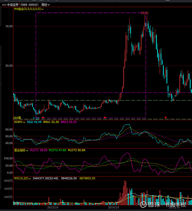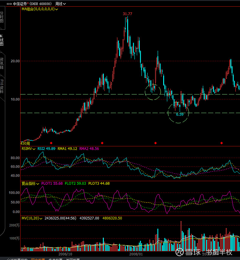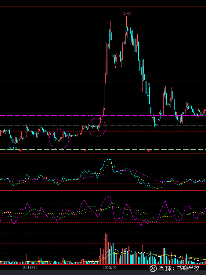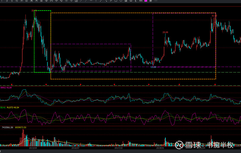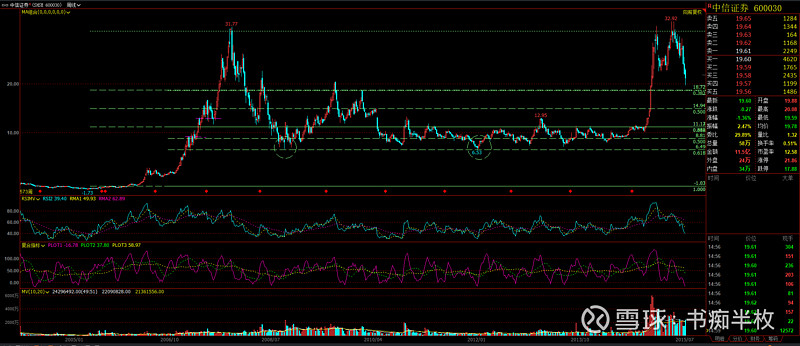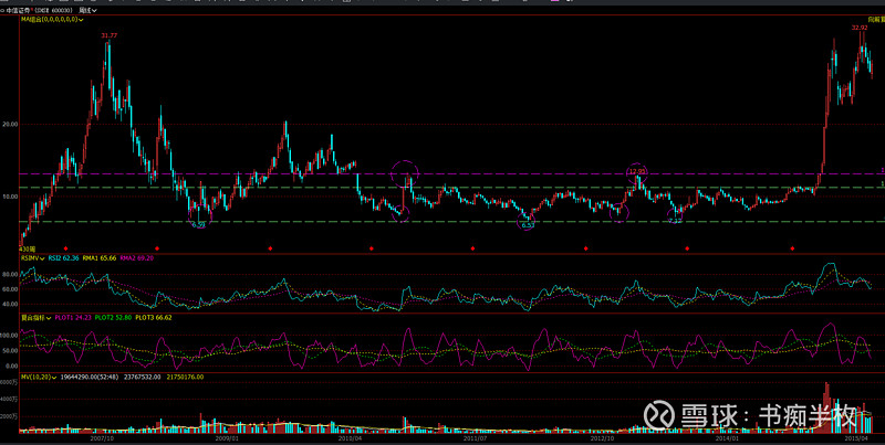 中信证券(600030):每股净资产 15.35元,每股净利润 1.77元,历史净利润年均增长 28.85%,预估未来三年净利润年均增长 16.06%,更多数据见:中信证券600030核心经营数据 中信证券的当前股价 19.09元,市盈率 12.21,未来三年的估值假设和预期收益率如下:15倍PE,预期收益率 117.42%;20倍PE,预期收益率 189.9%;25倍PE,预期收益率 262.37%;30倍PE,预期收益率 334.85%。 本文无结论,无结果,无定论。指望速成,可以跳过。 我学了技术分析很久,我对很多走势有些理解不能,或许我对自己的要求过高,或许我的理解力太差,无论如何,我希望慢慢梳理,好好从头学起。 本文标的股票随机选择典型的大型的股票。 本篇主要写中信证券, 先说大背景,上图是周线,周线中,绿色方框约为五浪上涨形态,这种走势是相对明确的。这个五浪上涨的高点,紫红色水平线标出。此后所有的走势没有 超过该范围。 那么,对于波浪来说,先不考虑更复杂的情况和数浪,就这里而言,他绿色方框以后的走势都算是这个绿色防控的第二浪调整。至少到目前还没有办法证明,新趋势已经开始了。 也就是说,绿色方框本身是五浪上涨的趋势上涨,绿色方框以后的走势是,调整型下跌。调整型走势是对应趋势上涨而言的。 没有趋势上涨,也就没有调整下跌。这是个相对概念。 也就是说,07年下半年以后的走势,全部是调整。 除非,将来的走势,有一天,能够证明上图蓝色方框里面的小一个级别的五浪走势是第三浪的第一浪。那么,这票或许回来空间极具想象力。如果是这种情况,蓝色方框只是第三浪的起始浪,那么,未来,目前的高点少于未来完整的五浪结构的三分之一,一般而言,或许只可能占了四分之一到五分之一。这个结论没什么用,因为未来很远。 什么是趋势浪?波浪理论种,趋势浪是五浪结构,调整浪是三浪结构,更复杂的情况暂时不提。 一般来讲,这个就是五浪结构,这个大的方框是个大五浪,小方框,是个三个小五浪结构。 这个大方框满足,一四浪不重叠,三浪不为最短。三个驱动浪都是五浪结构的特征。所以他是一个大的五浪结构的主升浪。 个别地方可能没有办法确认他的准确五浪结构的内在细节,在这张图,至少,我还没有去细究,我谨慎的用五浪特征去猜测的,因为非三即五。但是猜测也要满足波浪的特征。不能瞎猜。. 这里是上图中的两个调整形态。他不满足上述的五浪 特征的描述,一次他是三浪结构。这两个三浪结构在大致的级别上相当。 趋势上涨中,最重要的介入位置,就是调整, 通过调整来判断将来的走势,估算高度。通过调整来确定上涨可能性。 比如说,如果他只是个调整,且调整幅度是健康的,不超过66%的回撤幅度。那么,他就是健康的调整,然后找工具确认调整结束。找点位买进,做未来的大趋势,是一般通行的方法。 第一种做法,调整结束的位置,也就是回调的低点,比如说上图方框中的下沿位置,他的风险系数主要是跌穿了不止损。以及找不到合理的止损位。但是一般而言方框的下沿,调整的末端,是较为良好的买入区域,因为总体风险系数较小,买入成本较低,止损空间小。 第二种做法,也就是,方框的上沿区域也就是突破的位置,这个是最多人在研究和做的,也就是海龟交易法的核心内容,突破前高做多,就单看这张图,做法没毛病,因为,突破后向上的空间完全打开了,远期走势极具想象力。突破的做法需要严格止损,而且,止损一般比较大,还可能反复止损,这是突破做法的缺陷,不止损的突破战法,会比较惨。还有人是用均线的缠绕之后的向上开口扩张,还有人使用的类似布林通道,等。他们都是在做同样的事情。忽略调整,捕捉未来的趋势。 突破的难点是这里,紫红色的水平线段都是根据线段左侧高点来画的,一般是第一个高点,圆圈是突破区域重点标出。可以看到突破手法,在这里面会被反复打脸。或许左侧绿色方框可以看作是一个楔型,可是那也是走了两三个高点才能说他是楔型的,在当时,很难和顶部反转,或者大型调整的开始相甄别出来,这是最难的地方,而且,这个走势,一般来说代表偏空,可是看他后面的走势涨的很好。所以,该怎么看这里偏空预期?左侧提前空?左侧提前进的都在山岗上吹风。 右侧,还有几个向下的假突破,这是行情的复杂性。 这就是楔型,一个相对预期偏空的走势,可是有时候他也是在上涨早期的,我对这种走势,困惑了几年,如果严格来说,还要找他内在的结构的波浪特征,这个太复杂了,我估计没能力解释清楚。 上图这个方框里面是个expanded flat走势,他的迷惑性很大,他的高点突破了前高,他的低点,突破了前低,可是他只是个调整,意味着他仍然是上涨趋势中的中间位置。 反倒是,向下突破失败构成了一个绝佳的买点。 这是个复杂的expanded flat或者 flat。他的高点轻度超过了前高。低点轻度超过了前低。他的买点和此后的长期横盘会让人很困惑。这是难点,耐心,和信心,有时候真的很重要。 这是个众所周知的头肩顶形态,不过我不能接受生搬硬套,尤其在学了波浪理论之后,他其实是有第五浪的上涨,或者第五浪的第五浪上涨的一个摆臂,和下跌a浪,b浪组成的。确认跌穿颈线,差不多就是c浪位置了。 从趋势上来说,他其实至少意味着,超大型的abc调整正在形成,这个得看此前的五浪是否完整,这个超大型的abc调整是不是和此前的趋势上涨级别相对称。级别相当,这个很重要。有a,有b,那么就有c。而且, c的级