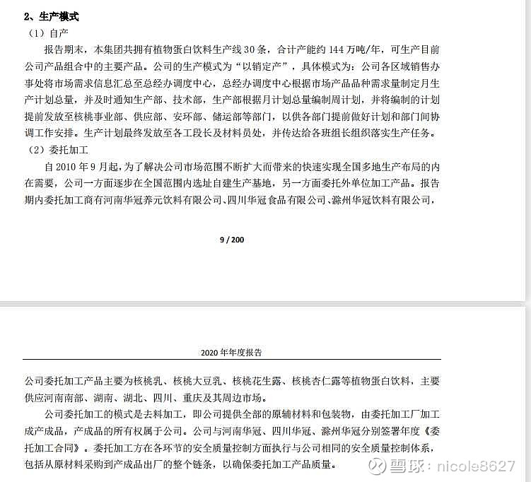 养元饮品(603156):每股净资产 8.39元,每股净利润 1.67元,历史净利润年均增长 50.21%,预估未来三年净利润年均增长 10.11%,更多数据见:养元饮品603156核心经营数据 养元饮品的当前股价 19.27元,市盈率 14.82,未来三年的估值假设和预期收益率如下:15倍PE,预期收益率 73.33%;20倍PE,预期收益率 131.11%;25倍PE,预期收益率 188.89%;30倍PE,预期收益率 246.67%。 先找一家认为自己能看得懂的企业。 能看得懂的企业有哪些特征?怎样可以说明你看懂了这个企业呢? 这就涉及一个能力圈的问题。 能力圈原则是以巴菲特为代表的价值投资者坚守的重要原则之一。 这个概念第一次出现在巴菲特1996年的致股东信中:投资人需要的是对选定的企业进行正确评估的能力。 巴神有言:只会选择一英尺的栏,七英尺的栏留给能跳过的人。 这也是能力圈一种形象的说法。 投资的目的是赚钱,不是比赛。 投资不是竞技项目比赛没有难度系数加分项 能力圈的大小不是最重要的,重要的是能不能确定能力圈的边界。 巴神给出了他的具体办法,他说:写出自己真正了解的企业的名字。在它周围画一个圈,然后衡量这些企业的价值高低、管理优劣、出现经营困难的风险大小等方面,再排除掉那些不合格的企业。 翻译出来就是了解关注企业所在行业特点、企业商业模式、产品竞争力、管理层是否值得信任、上市以来带给投资者的收益情况,企业发展是否可以大致预测、企业目前估值高低。 选已经读过2020财报的养元饮品做为分析对象: 一、行业特点分析 先找出这家企业所属的行业 2020年年报里面,查找:行业 可以在年报第三节:公司业务概要~报告期内公司所从事的主要业务、经营模式及行业情况说明里面~(三)公司所处的行业情况 公司所处行业 根据主营业务、主要产品的具体情况,公司所处行业大类为“酒、饮料和精制茶制造业” 小类为“含乳饮料和植物蛋白饮料制造”。具体类别为植物蛋白饮料行业。 行业内的主要产品根据原材料的不同可分为核桃露饮料、杏仁露饮料、花生露饮料、椰子汁饮料、豆奶饮料等品种。 这些类别的强势企业:养元饮品(核桃露)、承德露露(杏仁露)、银鹭(花生奶)、椰子汁(海南椰树)、豆乳(维维豆奶),代表企业大都是属于区域强势企业,整体植物蛋白饮品的市场规模和影响力仍然具有较大的上升空间。 根据养元21年报,21年整体植物蛋白饮料行业销售额1236亿元,养元销售额69亿,占比约5%。 植物蛋白饮料自带“绿色、天然、健康”的产品属性,契合了当下绿色健康的消费观念。 植物蛋白饮料因为行业进入壁垒比较低,从事植物蛋白饮料的企业比较多,目前处于完全竞争市场。 目前植物蛋白饮料的头部企业养元饮品、承德露露。 为什么要先分析行业? 1、看行业整体发展前景如何 2、看企业在行业里面的位置,找属于行业龙头位置的企业。 3、看行业的竞争格局, 有序竞争还是恶性竞争,恶性竞争不利于发展。 二、企业商业模式分析 可以在年报第三节:公司业务概要~报告期内公司所从事的主要业务、经营模式及行业情况说明里面、(二)公司的经营模式里面 1、 采购模式 核桃事业部和供应部负责主要原材料、辅料、包装材料等的采购事宜。 2、 生产模式 自产和委托加工 自产:生产线30条、产能144万吨 生产模式是“以销定产”。 委托加工:采用去料加工的模式。委托河南华冠养元饮料有限公司、四川华冠食品有限公司、滁州华冠饮料有限公司这三家公司生产。主要是供应河南南部、湖南、湖北、四川、重庆及周边市场。 3、 销售模式 公司销售模式有经销和直销。其中经销模式是主流销售模式。 经销模式下,公司的产品通过卖断方式直接销售给经销商,再由经销商销售给零售终端商,最后有零售终端商直接销售给消费者。 经销商模式的运行主要包括两个方面: 一 产品销售 卖断给经销商 二 服务于产品销售 对经销商实行指导、支持与管理。 用商业模式画布工具来分析商业模式: 商业模式画布工具是一种分析企业价值的工具,通过将商业模式中的元素标准化,引导思维,将素材进行归档。 《商业模式新生代》的作者亚历山大.奥斯特瓦德认为,一个完整的商业模式,应该包括4个视角,9个模块。 9个模块:客户细分、客户关系、渠道、价值主张、关键业务、核心资源、合作伙伴、成本结构、收入来源。 从4个视角来看养元: (1)目标客户客户是谁(客户细分)?怎样获得维护客户(客户关系)? (2)我有哪些独特竞争力?产品、其他还有哪些资源(核心资源)(价值主张) (3)我的货通过什么渠道直达客户(渠道) (4)我的收入来自哪里(大单品六个核桃系列),成本支出(成本结构) 三、产品竞争力? 波特竞争五力模型,又为波特竞争力模型。 五力模型是迈克尔.波特在上个世纪80年代提出的,对企业战略指定产生全球性的深远影响。用于竞争战略分析,可以有效分析客户的竞争环境。 五力分别是: (1)供应商的议价能力 主要采购物品:核桃、辅料、包装盒,影响成本的主要是包装盒。 (2)购买者的议价能力 购买者包括: 为消费而购买的大众,为销售而购买的经销商 大众不具备议价能力,但是可以选择不买 经销商的议价能力要看其压价的实力 (3)潜在竞争者进入的门槛 处于完全竞争的市场中,植物蛋白饮料进入门槛并不高 公司作为主要单位参与指定了国家标准《植物蛋白饮料核桃露》(GB/T 31325—201