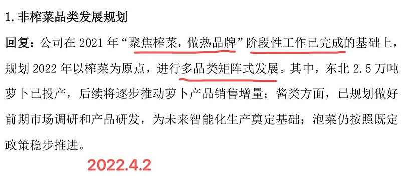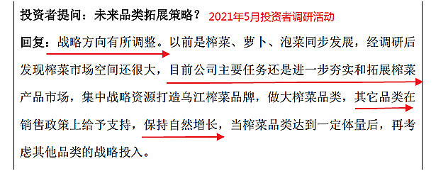 涪陵榨菜(002507):每股净资产 8.31元,每股净利润 0.87元,历史净利润年均增长 26.24%,预估未来三年净利润年均增长 21.94%,更多数据见:涪陵榨菜002507核心经营数据 涪陵榨菜的当前股价 27.68元,市盈率 27.85,未来三年的估值假设和预期收益率如下:15倍PE,预期收益率 -14.52%;20倍PE,预期收益率 13.98%;25倍PE,预期收益率 42.47%;30倍PE,预期收益率 70.97%。 上半年营收增长5.6%,归母净利润增长37.2%,涪陵榨菜看似交出了一份不错的成绩单,但拆分之后就会发现,情况并不像想象中那么美好。 总营收同比微增,其中榨菜和其他产品各自贡献了增量的一半。榨菜占营收的绝对大头,因此我们只看榨菜。 榨菜单价同比提升14.6%,主要原因是2021年11月中旬的提价。 榨菜的销量下降10%,这个得重点聊聊。 2020年8月,涪陵榨菜进行过一次定向增发,定增预案描绘了一副美好的前景,提出了三个方面榨菜未来可能的增量,即散装替代72万吨、餐饮渠道37万吨、休闲零食4万吨,合计还有113万吨的增量空间,而公司2021年销量仅13.56万吨,增长空间巨大。 在这样一种美好前景下,公司募集了33亿元,用于建设一个绿色智能化生产基地,增加窖池容量40.7万吨,增加榨菜产能20万吨/年。 也是在这样的美好前景下,管理层信誓旦旦,宣布公司战略转向,要集中战略资源做大榨菜品类,其他品类放任自流。然而两年时间过去了,榨菜的销量却从2020年的13.56万吨下降到2021年的13.48万吨,从2021年上半年的7.32万吨下降到2022年上半年的6.59万吨。 而且根据管理层在调研时的回复,2022年上半年的疫情并没有对榨菜的销售有负面影响,甚至还有促进销售的作用: 我们在地区营收情况表中,也能看出证据,上半年上海的静默,让华东地区的销售增长亮眼: 然而,这极其罕见的受益于疫情的行业属性,并没有帮助涪陵榨菜取得应有的成绩,榨菜营收不升反降,管理层似乎也没有好办法,于是宣布从之前的“战略转向”转回来,回归“多品类矩阵式发展”的老路。 也可能正是因为看到榨菜销量增长无望,定增时承诺建设的绿色智能化生产基地,在至今近一年半的时间里,募集的33亿资金仅投入5400万,工程进度1.46%。而定增预案里公布的工程建设期为三年,一半的时间已然过去。 榨菜销量没指望,萝卜泡菜这些没有任何规模优势和品牌优势的新产品,更难做出成绩。 这份半年报也体现出了这份艰难,毛利勉强维持,微降0.18亿,净利润37.2%的增长靠的是销售费用的节约和定增带来的33亿现金的利息收入: 剔除这两项的影响,净利润的增长甚至是负数。 总结: 前几篇关于涪陵榨菜的文章得出过一个结论,即榨菜的单价提升空间颇为有限,其他产品不具竞争优势,所以涪陵榨菜未来的增长主要看榨菜销量有没有起色,但我们通过定向增发后两年时间的观察发现,榨菜的前景并不像非公开发行预案上描述的那么美好,管理层似乎也有点手足无措,从2020年之前的品类拓展到“战略转向、集中榨菜”再到“多品类矩阵式发展”,兜兜转转,最终还是要靠其他品类,来扛起增长的大旗。 洽洽食品当年也有一段与现在的涪陵榨菜相似的时期,瓜子营收降速,品类拓展受阻,但最终陈先保回归,不仅在坚果方向找到了新的突破口,瓜子增长也开始恢复。食品饮料行业的模式即是如此,维持一头现金牛,以此为根基寻找下一个明星业务。 但有一点不同,瓜子是成瘾性产品,销量有所保证,而榨菜是会随着生活水平提高,慢慢被人抛弃的,时间是瓜子的朋友,却不是榨菜的朋友。因此洽洽在业务上的确定性要强过涪陵榨菜。 涪陵榨菜到了该背水一战的时候了。 @今日话题 $涪陵榨菜(SZ002507)$ 作者:F_Free原文链接:https://xueqiu.com/8531807918/229955303 转载请注明:www.51xianjinliu.com » 涪陵榨菜半年报隐忧 喜欢 (0)or分享 (0)