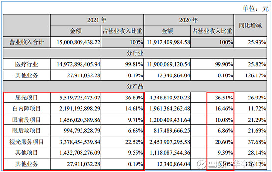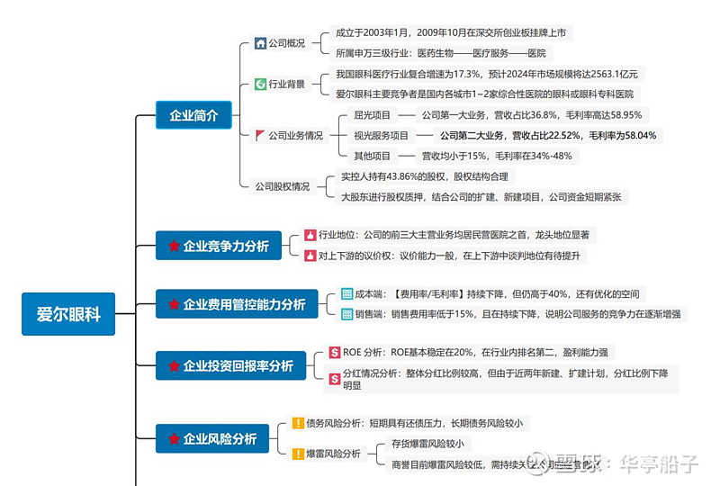 爱尔眼科(300015):每股净资产 2.27元,每股净利润 0.43元,历史净利润年均增长 40.22%,预估未来三年净利润年均增长 29.36%,更多数据见:爱尔眼科300015核心经营数据 爱尔眼科的当前股价 28.67元,市盈率 80.81,未来三年的估值假设和预期收益率如下:15倍PE,预期收益率 -62.22%;20倍PE,预期收益率 -49.62%;25倍PE,预期收益率 -37.03%;30倍PE,预期收益率 -24.44%。 文章摘要 爱尔眼科是全球最大的眼科医疗集团,具备强大的品牌优势和规模优势护城河,公司的归母净利润连续五年复合增长率高达32.97%。目前行业仍处于高速成长期,具备广阔的增长空间。 1.企业简介 1.1公司概况 爱尔眼科医院集团股份有限公司(简称:爱尔眼科)成立于2003年1月,公司注册地位于湖南省长沙市天心区。2009年10月,公司在深圳证券交易所创业板挂牌上市,登陆资本市场。 公司属于申万三级行业中的"医药生物------医疗服务------医院”行业。 爱尔眼科是全球最大的眼科医疗集团,主要从事各类眼科疾病诊疗、手术服务与医学验光配镜。主营业务包括屈光项目、视光服务项目、白内障项目、眼前段项目和眼后段项目等。 目前,公司总共运营着近700家眼科医疗机构,医疗网络覆盖中国内地各省、中国香港、欧洲、东南亚和美国,奠定了全球发展的战略格局。 1.2全文大纲 1.3 行业背景 根据中国卫生健康年鉴数据测算,中国眼科医疗行业的市场规模从2015年的507. 1亿增长至2020年的1125. 7亿,CAGR(年化复合增长率)为17. 3%.其中,民营医院的CAGR为18. 5%,公立医院的CAGR为16. 5%.预计2024年中国眼科医疗服务行业的市场规模将达到2563. 1亿,仍处于高速增长阶段,且行业没有明显的周期性。 爱尔眼科作为一家连锁性眼科医疗机构,主要竞争者是国内各城市1~2家综合性医院的眼科或眼科专科医院。从竞争实力来看,北京同仁医院、广州中山大学中山眼科中心、上海复旦大学附属眼耳鼻喉科医院、温州医科大学附属眼视光医院等几家公立医院,在临床和科研方面具有较强的竞争实力。 1.4 主营业务分析 2017年至2021年,公司的营业收入从59. 63亿增长至150. 01亿,每年增速基本都在20%以上,属于高速增长。 (数据来源:雪球) 2017年至2021年,公司的毛利率从46. 28%增长至51. 92%,呈现出稳中上涨的趋势。 数据来源:雪球 公司的业务主要包括屈光项目、白内障项目、视光服务项目等。其中,屈光项目是公司最大的一项业务。屈光项目主要就是近视眼、远视眼矫正手术。2021年,公司的屈光项目实现营收55. 20亿,同比增长26. 92%,占到总营收的36. 8%,与上年相比,占总营收的比重基本持平。另外,屈光手术的毛利率呈现出上涨趋势,2021年高达58. 95%,在各项业务中最高。 视光服务项目是公司的第二大业务,包括医学验光、诊疗配镜、干眼病诊治、斜弱势训练等内容。2021年实现营收33. 78亿,同比增长37. 68%,占比为22. 52%,与上年相比,占总营收的比重增加了2个百分点。视光服务项目的毛利也呈现出增长趋势,2021年达到58. 04%. 而白内障项目、眼前段项目、眼后段项目等业务的营收相对较少,营收占比均在15%以下,毛利率也相对较低,在34%~48%区间。 综合来看,屈光、视光服务两类业务是公司赚钱的主要项目,二者的营收占总营收的比例接近60%,毛利率均超过了58%. 1.5 公司股权结构分析 1.5.1 股权结构分析 爱尔眼科由陈邦、李力共同出资设立。陈邦为公司的实际控制人,持有公司43. 86%的股权;李力持有10. 50%的股权;其余股权为公众股东持有。股权结构相对集中,实控人持股比例在合理区间,股权风险相对较低。 数据来源:华西证券 1.5.2 股权变动及质押分析 年报显示,2021年爱尔眼科的控股股东爱尔医疗投资集团有限公司、实际控制人陈邦、李力均进行了增持,分别增持4. 34亿股、1. 96亿股、0. 43亿股,增持比例分别为22. 89%、22. 92%、23. 12%. 实际上,这是由于资本公积转增股本导致的。2021年6月,公司实施了10股转增3股的股利分红,导致股东的持股数量同步增长23%左右。但是,大股东并未卖出任何股权进行套现,说明公司核心管理层还是非常看好公司发展的。 但是,我们也注意到,公司的控股股东爱尔医疗投资集团、陈邦、李力均进行了股权质押,质押比例分别为4. 1%、8. 9%、21. 16%.由此猜测,公司可能面临资金紧缺问题。 年报显示,爱尔医疗投资集团的股权质押,是为子公司爱尔眼科国际(新加坡)有限公司的银行贷款提供连带担保产生的。 在“其他重大事项的说明”中,我们看到公司同时进行着多项新建、扩建项目,并为此筹集了36. 5亿元资金。 可见,公司由于扩大经营规模,进行了大量投资,可能存在短期的资金紧张。结合眼健康行业的发展情况,未来还有很大的需求空间,公司扩大投资规模在未来能够助力公司提升市场竞争力和占有率,这对公司的长期发展是有利的。 2.企业竞争力分析 2.1公司的行业地位 根据相关统计,在目前中国眼科医疗服务行业,医学视光、白内障、屈光手术的市场规模占据了细分市场的前三甲,占比分别为21. 3%、18. 1%、16. 8%.而这三项也是爱尔眼科最大的三项主营业务。 中国眼科医疗服务市场规模占比: (数据来源:华西证券) 下面,我们逐一分析一下爱尔眼科在这三个细分市场的竞争状况。 2.1.1 医学视光 根据国家卫健委的调查结果,2018年,我国青少年的总体近视率为53. 6%,其中初中生的近视率高达71. 6%,而到了高中阶段,这一比例高达81%.并且,近视率仍处于小幅