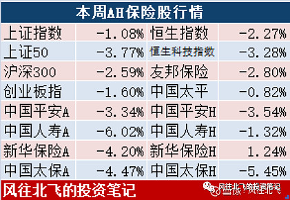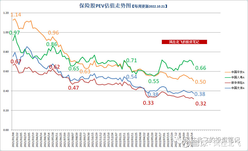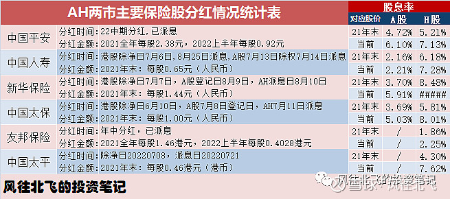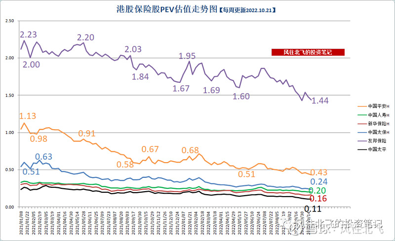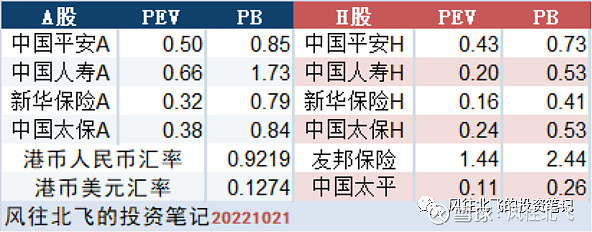 中国平安(601318):每股净资产 46.43元,每股净利润 5.77元,历史净利润年均增长 23.8%,预估未来三年净利润年均增长 13.61%,更多数据见:中国平安601318核心经营数据 中国平安的当前股价 38.31元,市盈率 7.26,未来三年的估值假设和预期收益率如下:15倍PE,预期收益率 231.29%;20倍PE,预期收益率 341.72%;25倍PE,预期收益率 452.14%;30倍PE,预期收益率 562.57%。 中国太保(601601):每股净资产 23.56元,每股净利润 2.79元,历史净利润年均增长 21.89%,预估未来三年净利润年均增长 9.15%,更多数据见:中国太保601601核心经营数据 中国太保的当前股价 21.37元,市盈率 8.42,未来三年的估值假设和预期收益率如下:15倍PE,预期收益率 154.66%;20倍PE,预期收益率 239.55%;25倍PE,预期收益率 324.43%;30倍PE,预期收益率 409.32%。 风往北飞的“保险股黑板报”每周更新。这里每周会更新保险板块的动态PEV走势图,今天是第94期。行业内主要公司的业绩报告也会第一时间写观察文章。你的分享、在看、点赞,都是我坚持的动力。 本周行情回顾: 本周市场继续下跌,A股方面蓝筹、头部公司跌幅大于整体市场,上证50跌幅3.77%,沪深300%跌幅2.59%,上证指数、创业板指跌幅较小分别下跌1.08%和1.60%。港股继续下跌,雄狮不言底。恒生指数和恒生科技指数周跌幅2.27%和3.28%。 保险板块本周A股整体跌幅大于港股,A股保险板块本周跟随且跑输上证50指数,港股除了中国太保H跌幅较大,其他个股相对跌幅较小。本周板块内涨幅最大的个股是新华保险H,周涨幅1.24%。 PEV估值方面,估值指标已经失效。 PB说明:上表中的PB采用季报净资产数据(六家都已是2022年中报)和每周汇率数据,雪球等软件中PB并未采用每周汇率,而是半年末、年末,所以平安/国寿/新华/太保的港股PB可能与软件中不同。 ↑关注***回复关键词“PEV”,可查看过去10年保险板块PEV估值走势图。↑ AH两市主要保险股分红情况统计表 本周中国平安中报分红已到账。 上表中对应当前股价时采取动态股息率,即平安和友邦的分红按照2021年下半年+2022年上半年计算。 PS: 1、友邦保险、中国平安每年两次分红,其他各家暂时是每年一次分红。 2、港股的除净,意思等同于A股的除权。多数A股公司的除权和派息在同一天(或者很近)。多数港股公司除净到派息要间隔1个月左右。 3、关于股息率上表中均为税前股息率。A股目前是差额红利税,持股超过一年免税(交税的不好意思自称长线价投),持有1个月至1年税率为10%,持有不到1个月税率20%。H股红利税为10%,沪港通渠道购买H股红利税为20%。 中国10年期国债收益率 2022半年报点评: 主要头部险企的2022年中报已披露完毕,下面是我的观察点评文章: 中国平安2022半年报点评:雕栏玉砌应犹在,只是绿水青山网页链接 友邦保险2022半年报点评:在台风中走下神坛 中国人寿2022半年报点评:保持战略定力,逆市提高股基投资比例网页链接 中国人保2022半年报简评网页链接 中国太保2022半年报点评:在阴霾里逐光而行网页链接 中国太平2022半年报点评:重回跌势,未能延续复苏态势网页链接 新华保险2022半年报点评:新业务价值惨淡,权益投资占比历史新高网页链接 观察疫后第三年的保险行业,2022半年报数据横向对比:网页链接 ===================================================== 本周的观察和思考: 4险企公布前9月保费收入 本周,中国人寿、中国太保、新华保险和中国太平陆续公布了前9月保费收入: 中国人寿前9月原保费收入5541亿元,同比增长0.13% 中国太保前9月原保费收入3224.71亿元,同比增长7.6% 新华保险前9月原保费收入1377.92亿元,同比增长0.9% 中国太平前9月原保费收入1520.51亿元,同比增长1.86% 中国太保、中国太平分险种看: 2022年1-9月,太保寿险、太保财险分别实现原保费收入1897.38亿元、1327.33亿元,同比增幅分别为4.4%,12.5%。 2022年1-9月,太平人寿、太平财险、太平养老分别实现原保费收入1241.44亿元、219.46亿元及59.61亿元,同比分别增长0.88%、4.08%和16.13%。 上海国资增持中国太保A股 本10月16日晚间,中国太保公告称,上海国资自2022.5.21-2022.10.13通过二级市场合计增持公司A股股份2044.65万股。 截止10月13日,上海国资及其一致行动人对中国太保的持股比例达到10.53%。 友邦保险第28周回购 友邦保险2021年报公布了百亿美元回购计划,从2022年3月21日开始截止7月25日连续19周进行回购。应该是按照要求,提前半年报(8月25日)一个月暂停回购。中报结束后第二天8月26日,友邦保险重启连续回购。 本周港股开盘5天,回购了5天。周回购约1322万股,占总股本0.1114%。 最近一次注销是10月10日,注销8-9月回购的61934000股。按照前几次的日期来看,每月10日后注销上个月回购的股份。 目前累计回购股份约2.57亿股,约占总股本2.14%。已注销约2.256亿股。友邦保险目前总股本11872880008股。 PS:友邦在2021年报中披露,明确会根据回购当时的市场和地缘政Z状况,进行上限百亿美元的回购。如果按照目前的股价、汇率和每日回购1.5亿港币来计算,百亿美元回购计划可以回购783亿港币,连续回购522天,去掉休市时间可以连续回购2年左右,最终占总股本7.83%,全部注销后每股内在价值能提升8.5%……(当然最终百亿美元可能只是上限) 期待保粉在评论区里补充干货,把本周看到的行业新闻,研报信息等相互分享,我们一起记录每周黑板报。 本文内容仅为个人观点,不作为任何投资建议。 投资是每个人自己的事,请勿根据他人言论