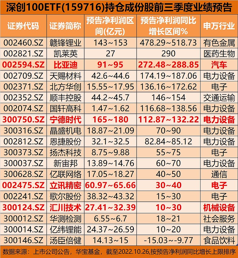 凯莱英(002821):每股净资产 39.42元,每股净利润 4.4元,历史净利润年均增长 32.24%,预估未来三年净利润年均增长 42.37%,更多数据见:凯莱英002821核心经营数据 凯莱英的当前股价 155.8元,市盈率 18.62,未来三年的估值假设和预期收益率如下:15倍PE,预期收益率 -12.68%;20倍PE,预期收益率 16.42%;25倍PE,预期收益率 45.53%;30倍PE,预期收益率 74.64%。 中信证券(600030):每股净资产 15.46元,每股净利润 1.77元,历史净利润年均增长 28.85%,预估未来三年净利润年均增长 11.08%,更多数据见:中信证券600030核心经营数据 中信证券的当前股价 18.25元,市盈率 12.28,未来三年的估值假设和预期收益率如下:15倍PE,预期收益率 99.39%;20倍PE,预期收益率 165.86%;25倍PE,预期收益率 232.32%;30倍PE,预期收益率 298.79%。 10月26日,市场主要宽基指数多数飘红,沪指上涨0.78%,深成指涨1.68%,创业板指涨2.52%,深创100收涨1.98%,两市合计成交9142亿元,北向资金净买入34.33亿元,连续两日净流入。 10月26日,深创100ETF(159716)前十大重仓行业九成上涨,医药生物和计算机板块领涨两市,涨超4%,电子板块涨超2%,通信、机械设备、交通运输和电力设备涨超1%。 数据来源:Wind A股规模最大深创100ETF(159716)全天震荡走高,收盘上涨2.15%,报0.713元。 10月26日,深创100ETF(159716)持仓的100成份股88只收涨,上涨比例近九成,22只成份股涨超5%。康泰生物收涨11.76%,晶盛机电涨超9%,深信服、凯莱英和捷佳伟创涨超8%,智飞生物、普洛药业和以岭药业涨超7%,东方雨虹、绿盟科技、安科生物、卫星化学、汤臣倍健、爱尔眼科和沃森生物涨超6%。 【深创100ETF(159716)持仓成份股10.26涨幅TOP20】 10月26日,深创100ETF(159716)前十大重仓股七只收涨,迈瑞医疗收涨3.91%排名第一,立讯精密、海康威视和美的集团涨超1%,京东方A、亿纬锂能和格力电器均录得小幅上涨。另一方面,深创100ETF(159716)第一重仓成份股宁德时代微跌0.16%。 【深创100ETF(159716)持仓前十大重仓股10.26涨跌幅】 数据来源:Wind,华宝基金 【深创100ETF(159716)19只成份股三季度业绩预告出炉,8只增速净利润增速超100%】 截至10月26日,深市超过200家公司披露三季报预告,预增占比超九成,新能源与生物医药业绩“领跑”深市三季报预告。深创100ETF(159716)19只成份股公布三季度业绩预告,18家业绩预喜(预增和略增)。 8只成份股前三季度业绩预告净利润增速超100%。”锂电池龙头”宁德时代同比增长112.87%至132.22%,第三季度预计实现净利润超过第一季度与第二季度之和,创单季最好成绩。“CXO龙头”凯莱英前三季度业绩预告净利润增速超290%,“新能源车龙头”比亚迪净利润同比增长272.48%-288.85%, “锂矿龙头”赣锋锂业预计前三季度净利润同比增长约478%-519%。“电解液龙头”天赐材料预计前三季度净利润同比增长约174%-187%。“半导体设备龙头”北方华创预计前三季度净利润同比增长约136%-173%。“快递龙头”顺丰控股预计前三季度净利润同比增长约146%-154%。“磷酸铁锂电池龙头”国轩高科预计前三季度净利润同比增长约117%-139%。 注:标红个股为深创100ETF(159716)前十大权重股 招商证券表示,展望后市,首先建议关注三季报延续确认高增长甚至超预期增长的细分品种。 中信证券近日指出,四大关键扰动将在本周陆续落地,预计将带来此轮月度级别修复行情的右侧买点,A股市场三大积极改善迹象已经陆续出现,全面修复行情正处于政策驱动的上半场,配置上更加侧重弹性。首先,四个不确定因素将在下周陆续落地,政策预期扰动在二十大后将彻底消除,推迟公布的经济数据预计将在下周发布,经济见底预期进一步明确,三季报月底集中披露后投资者对报表风险的担忧也将落地,美联储加息恐慌顶点已过,人民币快速单向波动阶段已经过去。其次,A股市场三个改善迹象已经出现,成交热度逐渐提升,活跃私募仓位已降至4月底以来最低水平,资金情绪已经有所好转,对行业机会的关注度开始高过总量扰动,资本市场在近期也迎来密集的政策催化。 山西证券表示,A股整体估值已经进入显著低估区间,布局窗口正在开启,结构转型中有望延续高景气逻辑的赛道+基本面修复弹性较大的行业(养殖、造船和部分医药等)有望持续收获较优表现。 国海证券认为,当前,市场已处于底部区域,流动性是更有可能发生积极变化的因素,但市场回升趋势的确立仍需经济预期的改善。现阶段景气成长有望脱颖而出,一方面,“弱经济”环境下成长相对价值占优。另一方面,市场在底部前后,短期优势风格具有一定持续性。 中信证券指出,国内经济和政策预期逐渐明朗,预计经济同比改善将延续至明年二季度;欧美加息和人民币快速贬值的压力高点已过,对市场的负面影响逐渐减弱;存量资金调仓和增量资金入场有持续性;A股全面修复行情已启动,预计将持续数月,期间扰动因素或有反复,但不改修复趋势;建议继续坚持均衡配置,积极布局估值切换和景气拐点行业。 中金公司指出,三季度A股市场整体表现偏弱,对负面因素已有较多反映,估值和情绪都已达到历史区间较为极端的水平,虽然短期路径依然有一定不确定性,但从国际比较的角度看,全球主要经济体均面临较大结构性挑战,而中国内需潜力大、改革与挖潜空间足,只要政策及时适度发力,从中期的角度看,市场机遇大于风险。 ★聚焦高景气赛道!深创100ETF(159716)四大硬核科技板块占比超60%★ 深创100ETF(159716)被动跟踪深证创新100